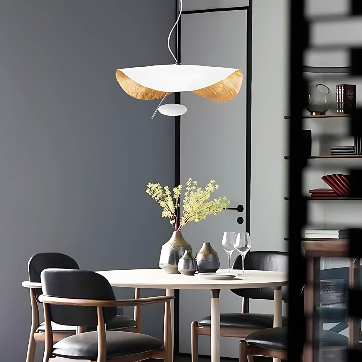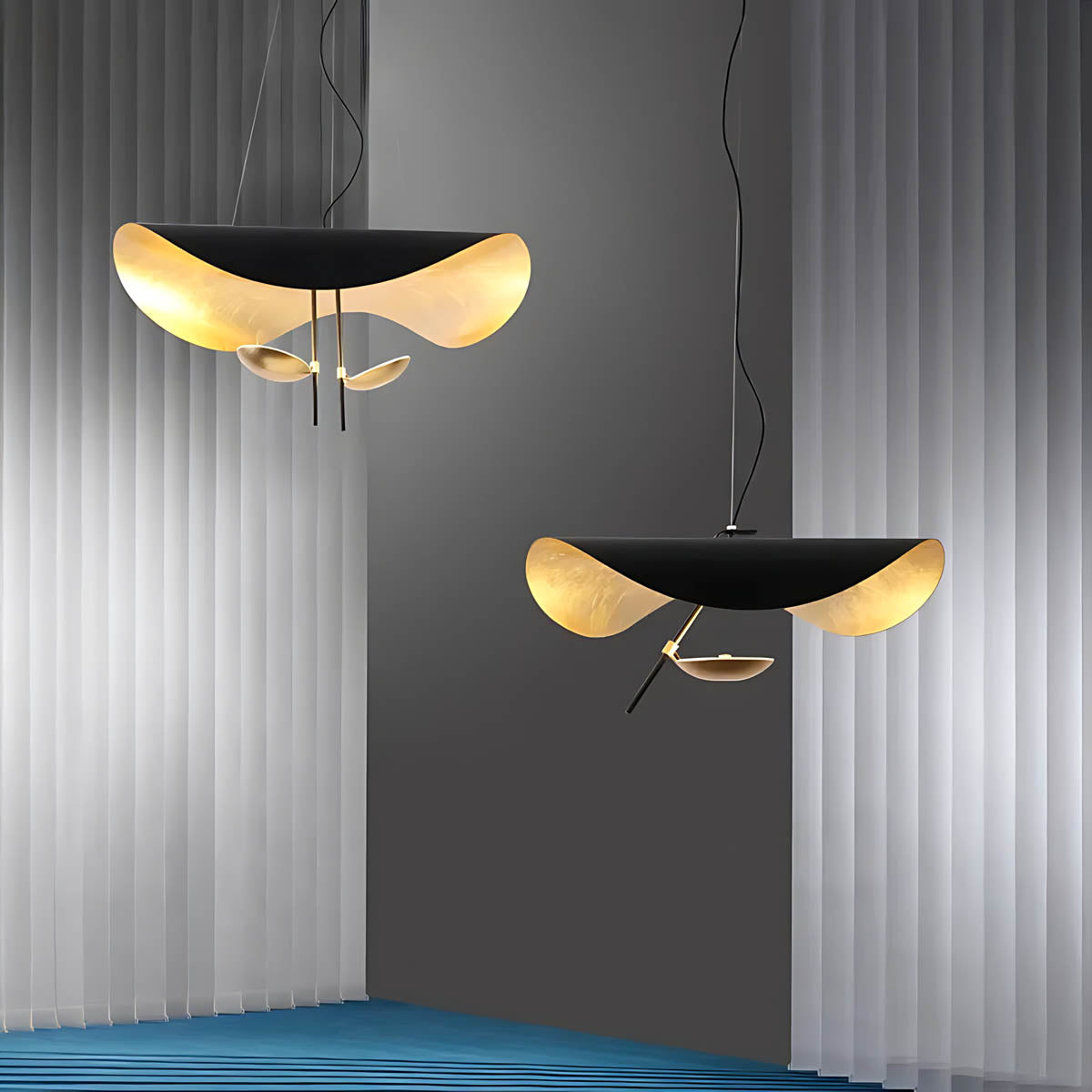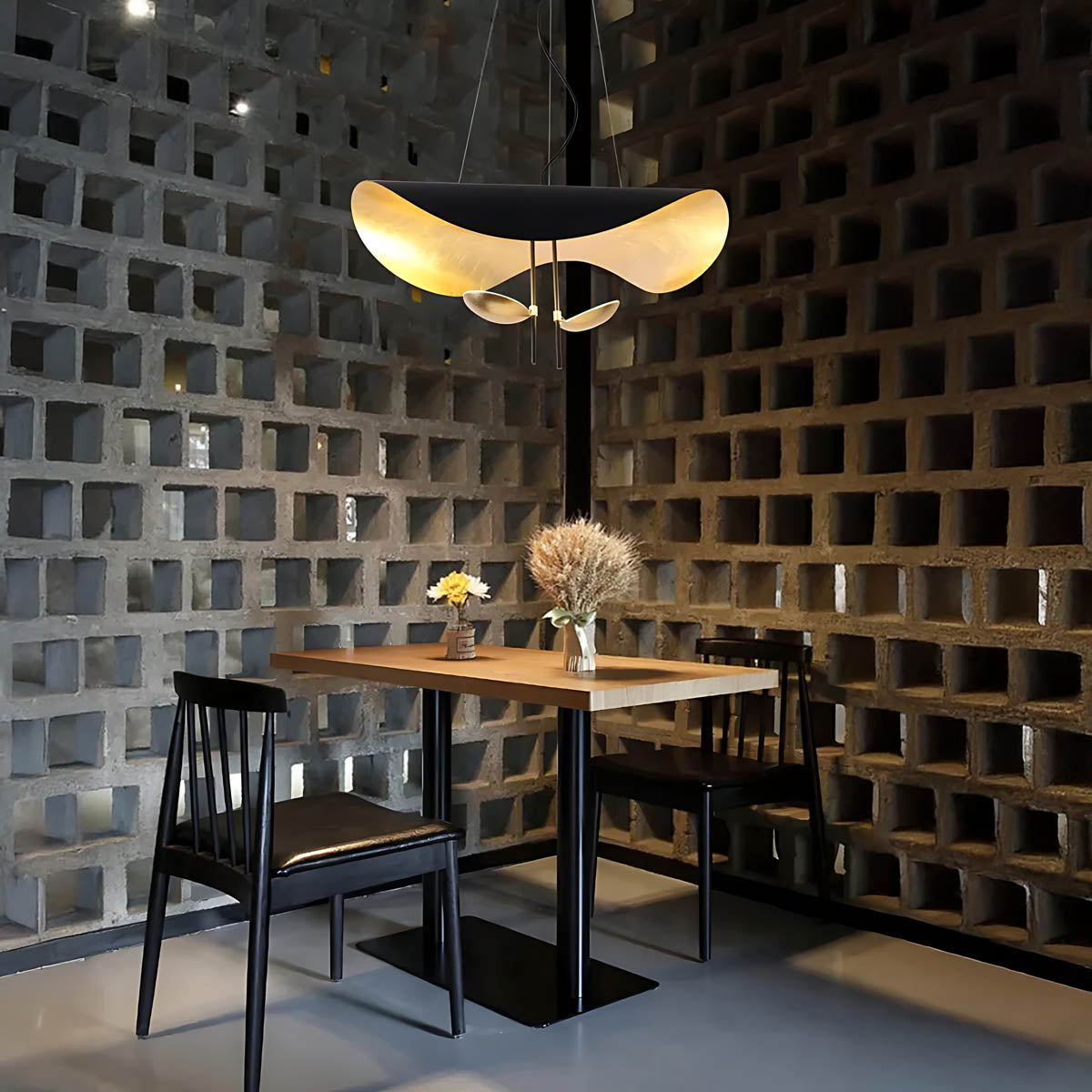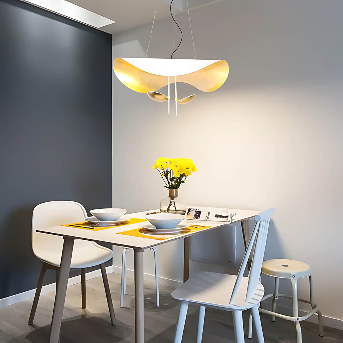 Its flowing, wing-like shades open to reveal a softly gilded interior that bounces light upward and outward, creating a warm, ambient glow with gentle downlight for dining tables, living rooms, or bedrooms.