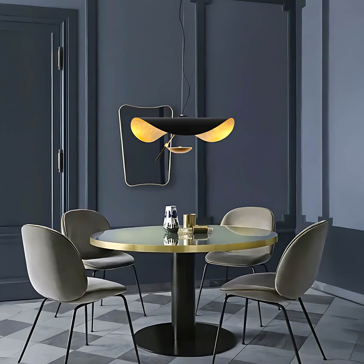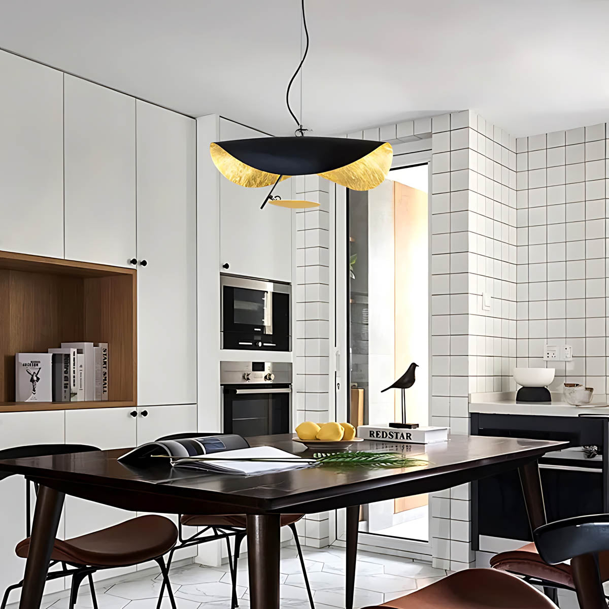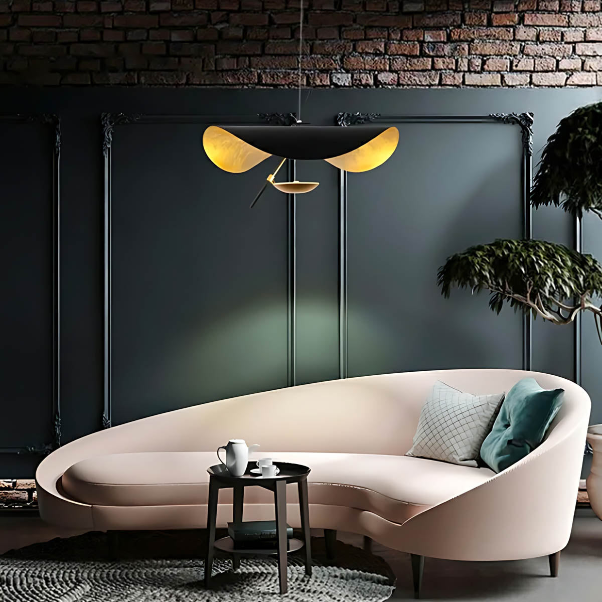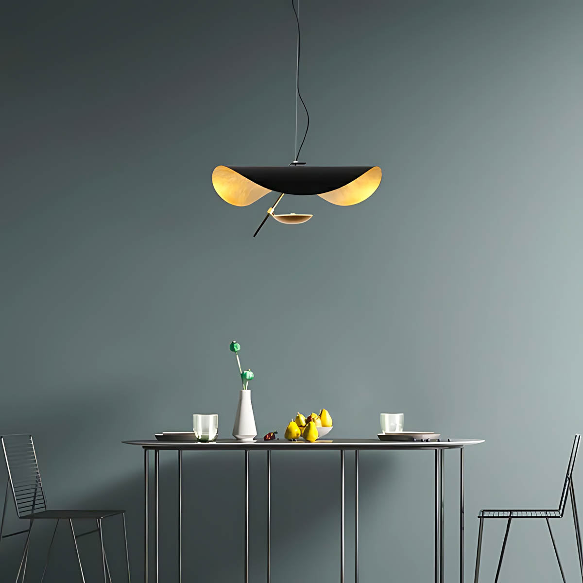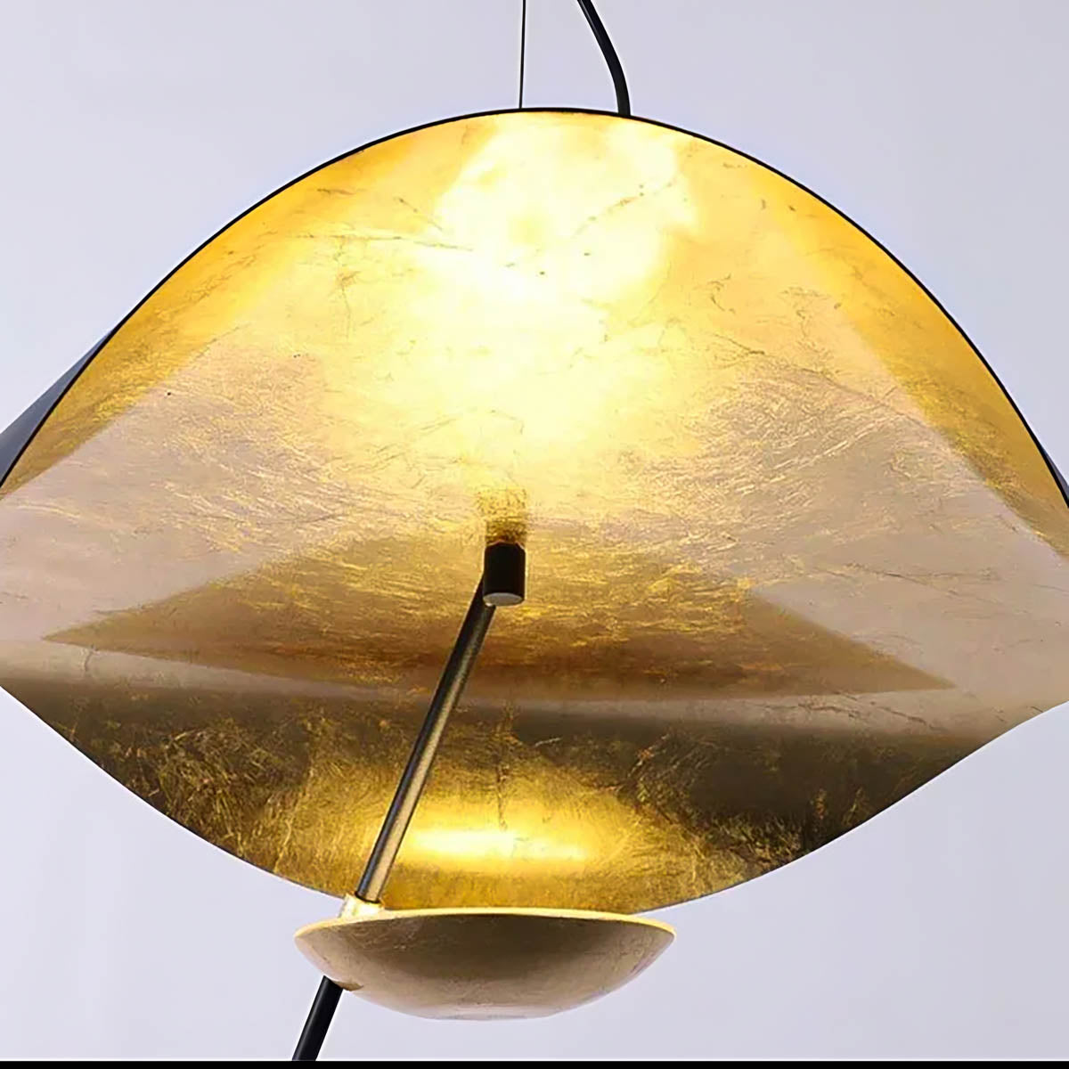 Its flowing, wing-like shades open to reveal a softly gilded interior that bounces light upward and outward, creating a warm, ambient glow with gentle downlight for dining tables, living rooms, or bedrooms.