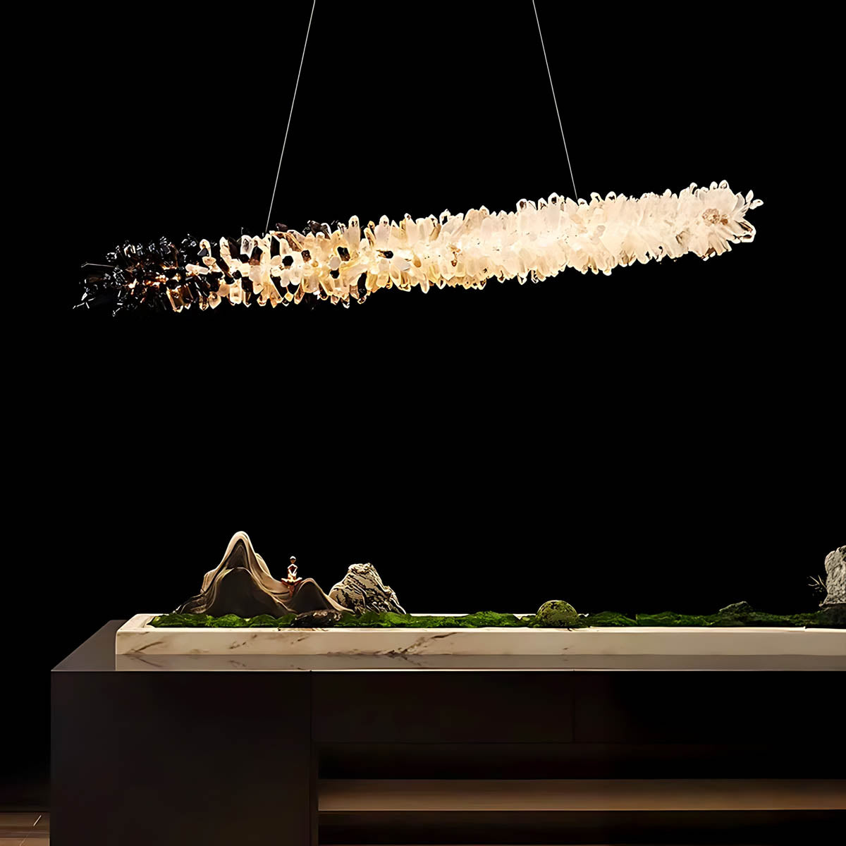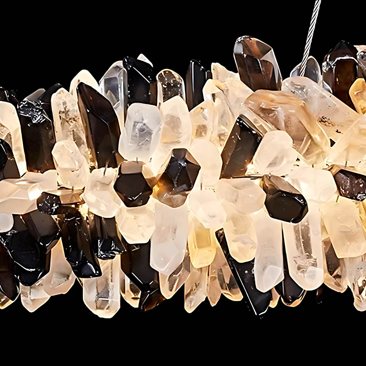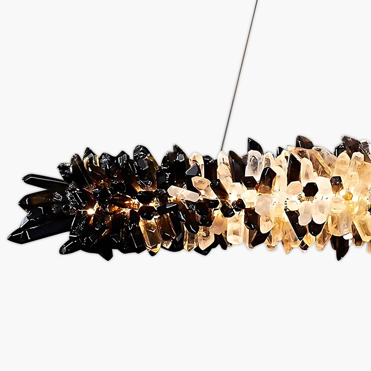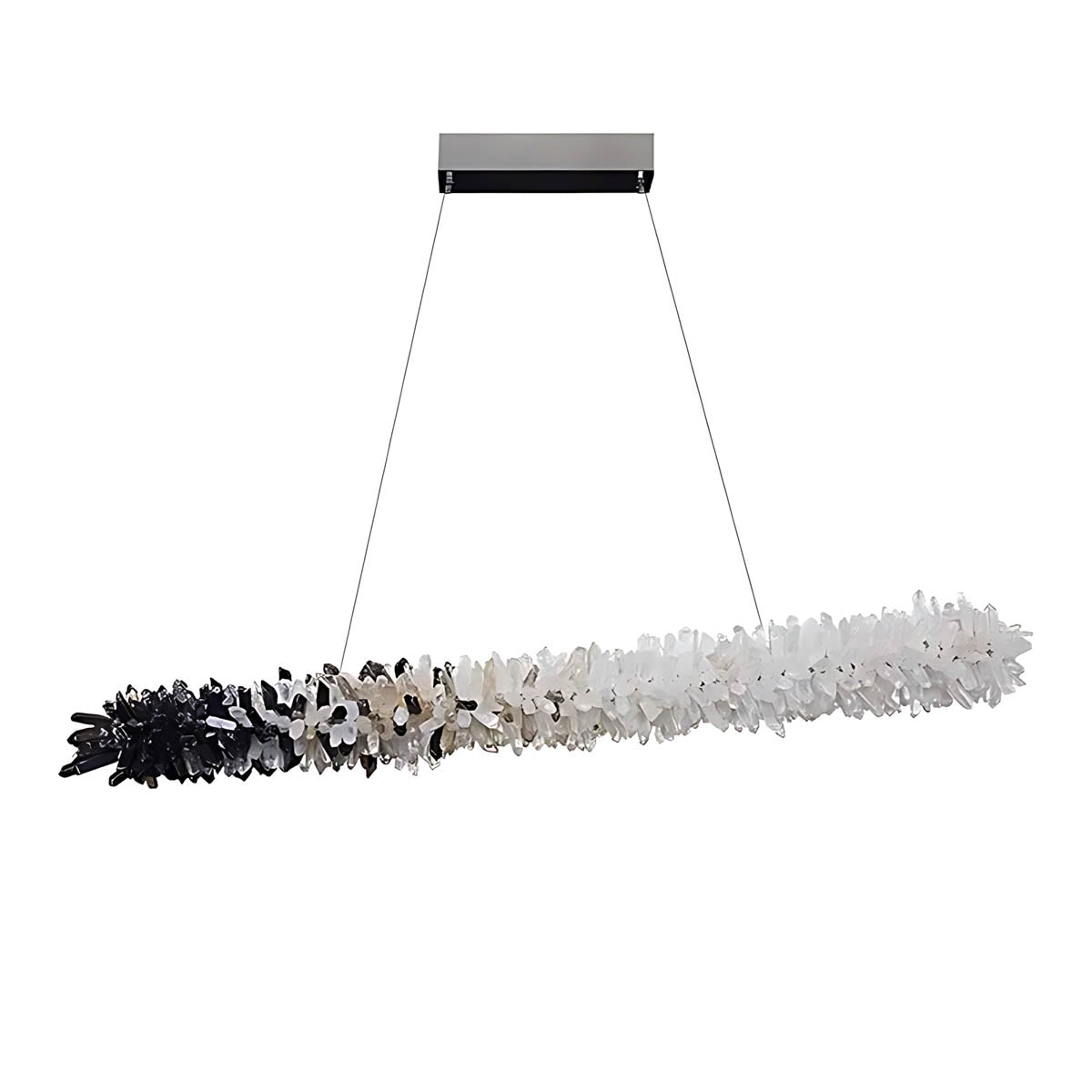 Dozens of hand-selected crystal points are clustered along a slim linear frame to create a raw, luminous “stalactite” effect that glows from within; choose from two styles—all-clear crystal for pure, icy sparkle or a striking black-to-clear gradient for high-contrast, modern glamour.