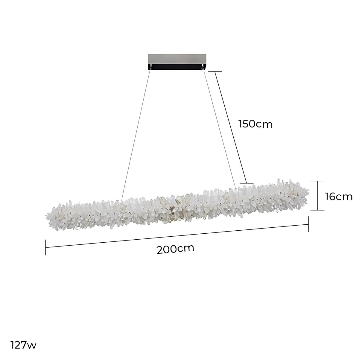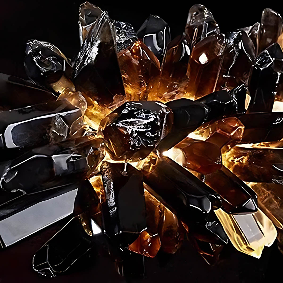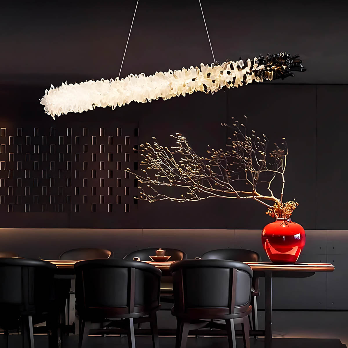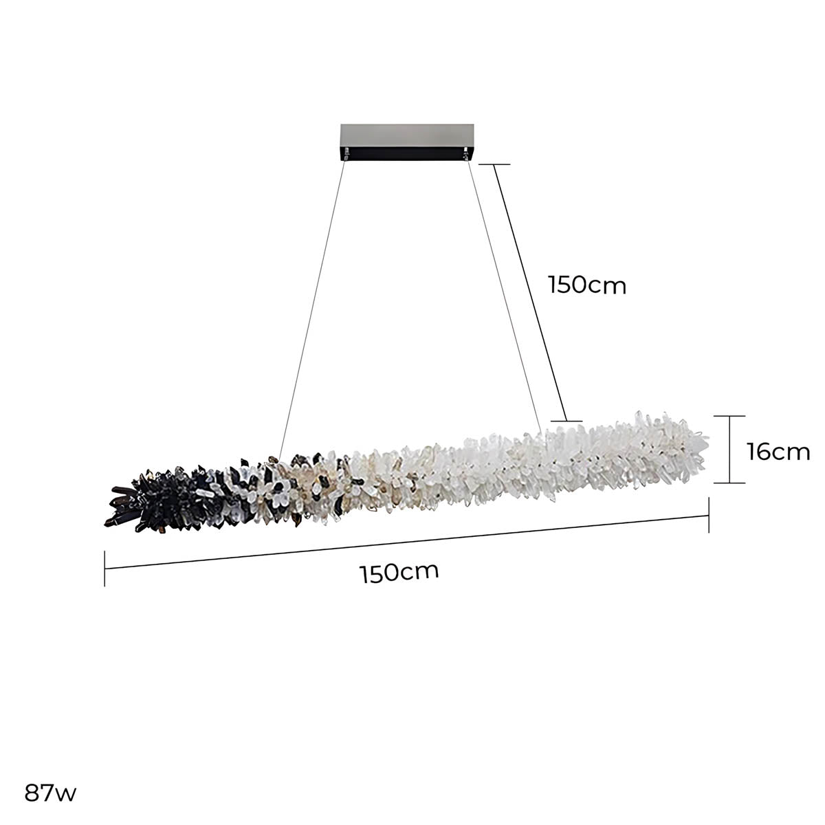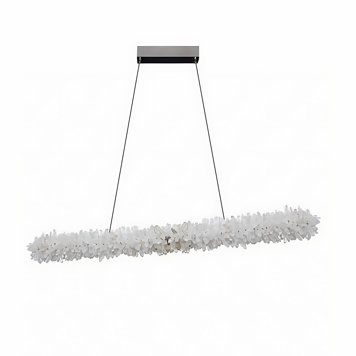 Dozens of hand-selected crystal points are clustered along a slim linear frame to create a raw, luminous “stalactite” effect that glows from within; choose from two styles—all-clear crystal for pure, icy sparkle or a striking black-to-clear gradient for high-contrast, modern glamour.