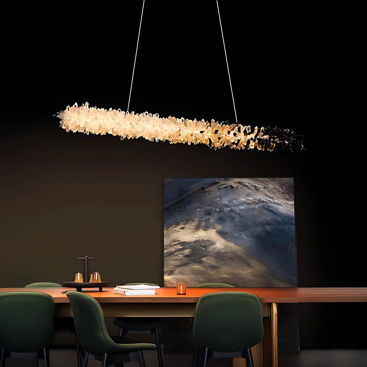 Equal parts art piece and functional lighting, this modern crystal linear chandelier is perfect for luxury interiors, contemporary dining rooms and sophisticated hospitality spaces.