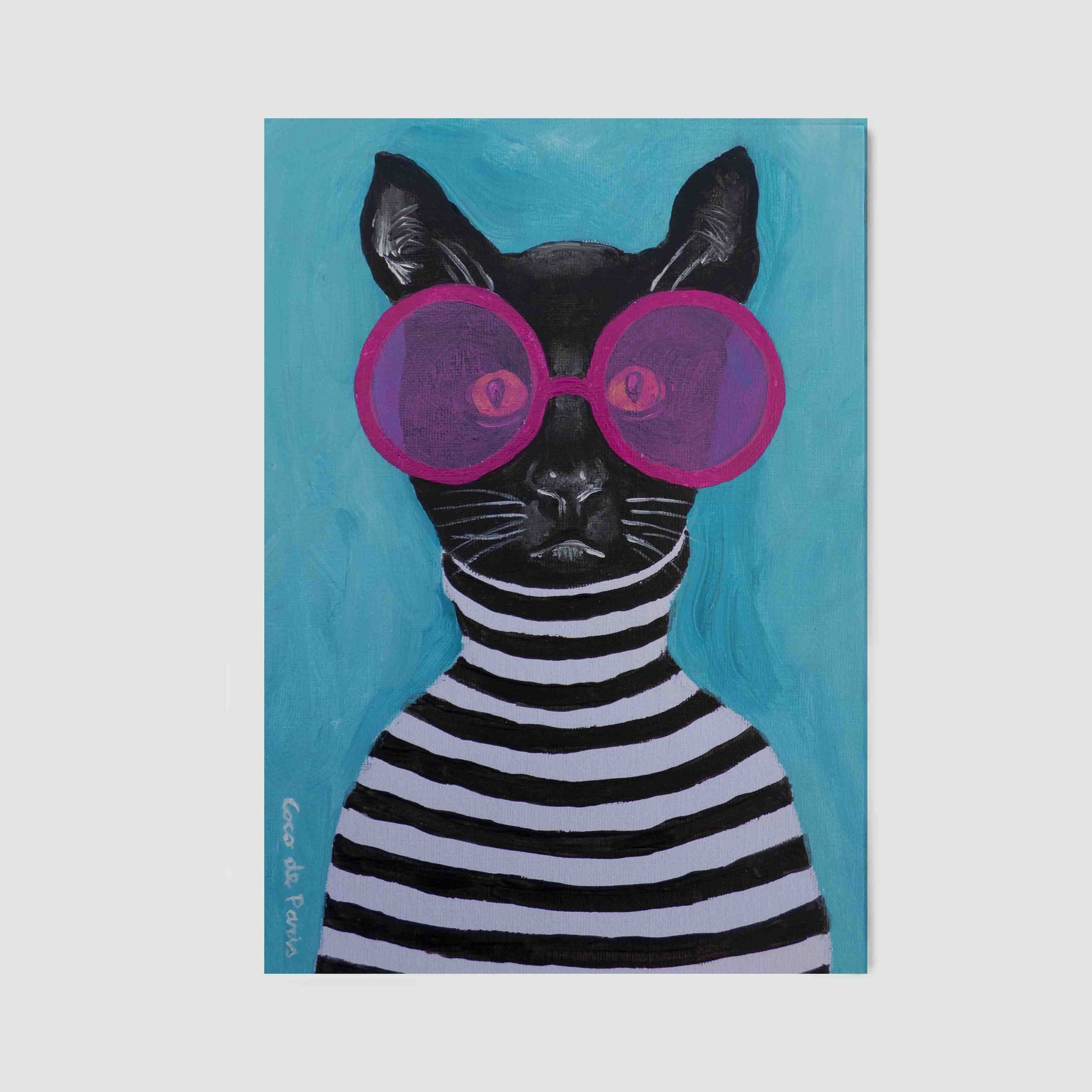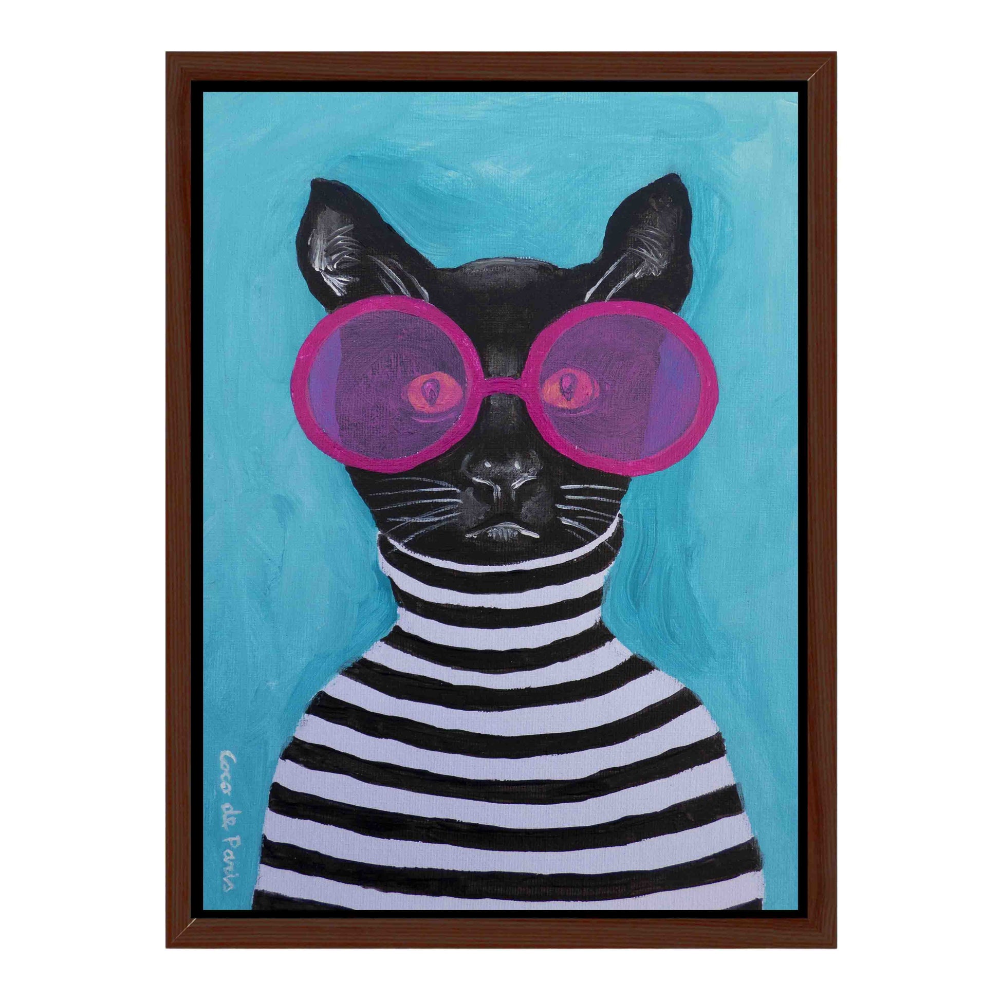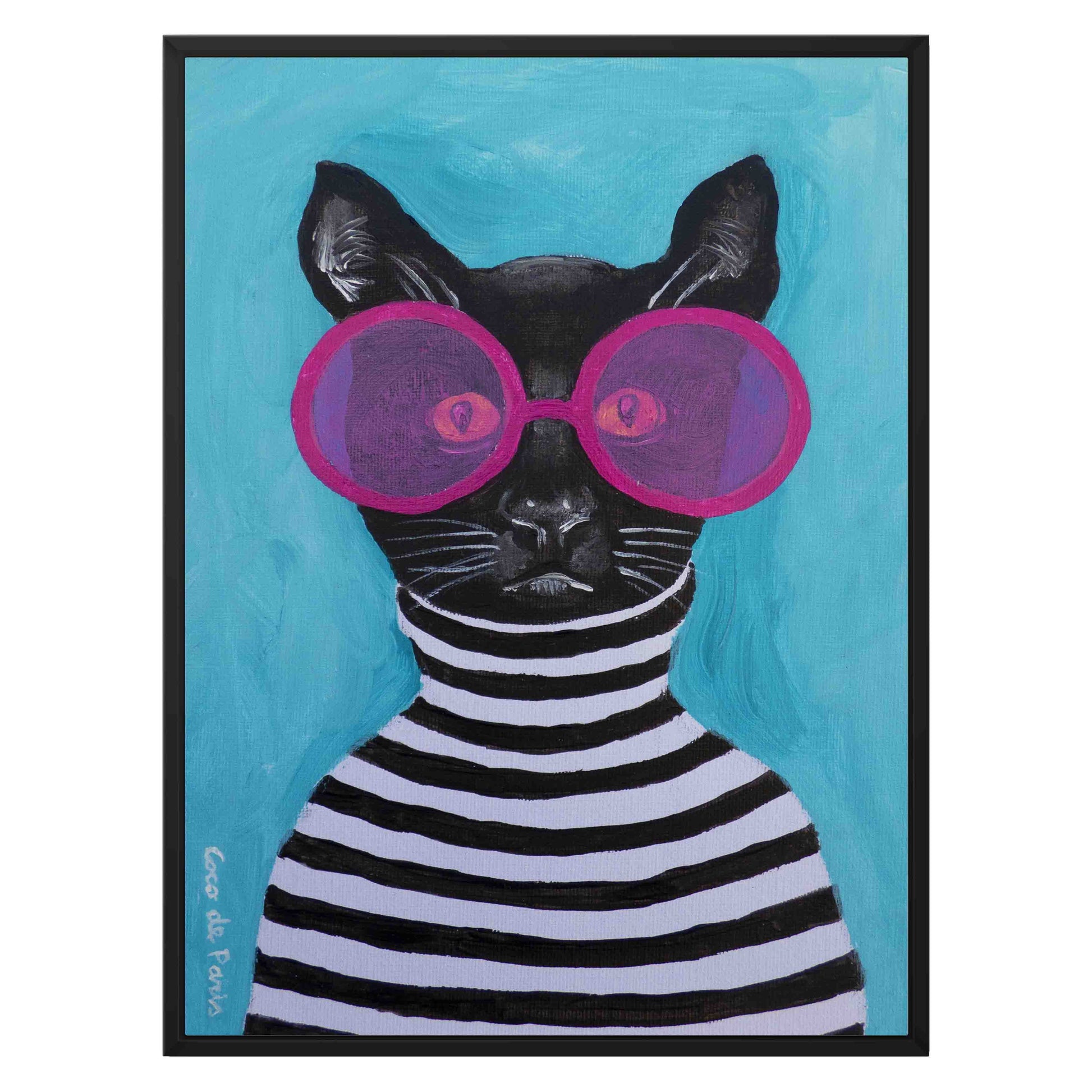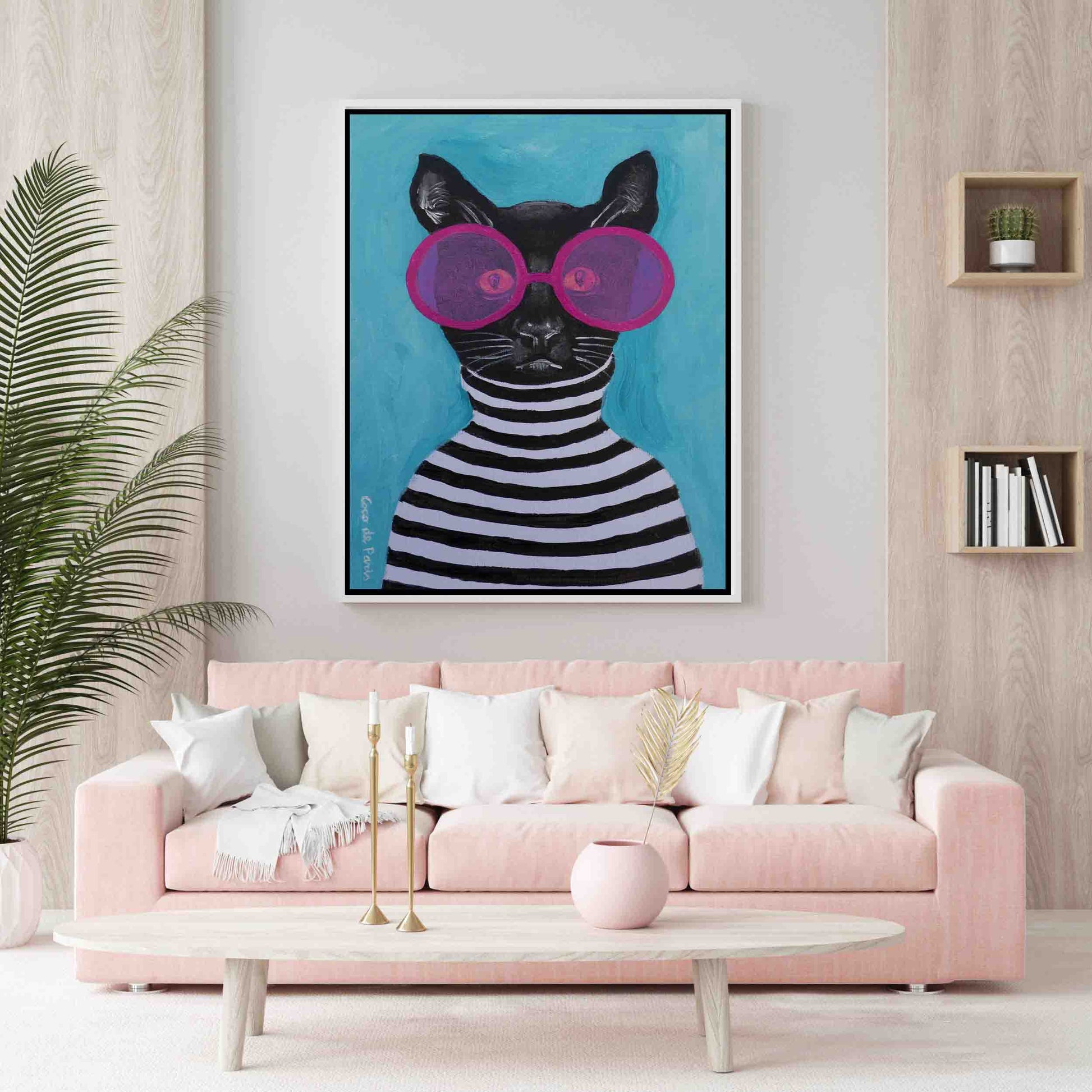 Whimsical canvas print of a black cat in a striped turtleneck and pink sunglasses. A playful, surreal wall art piece perfect for cat lovers and quirky home decor.