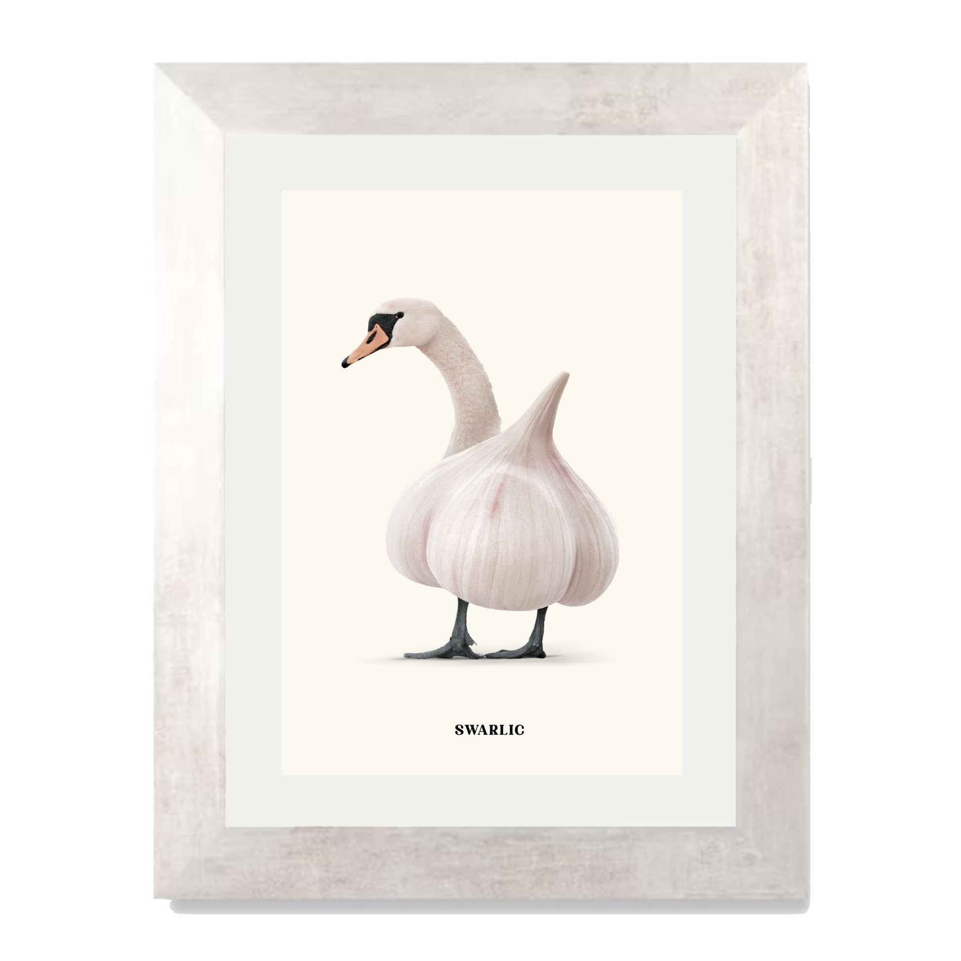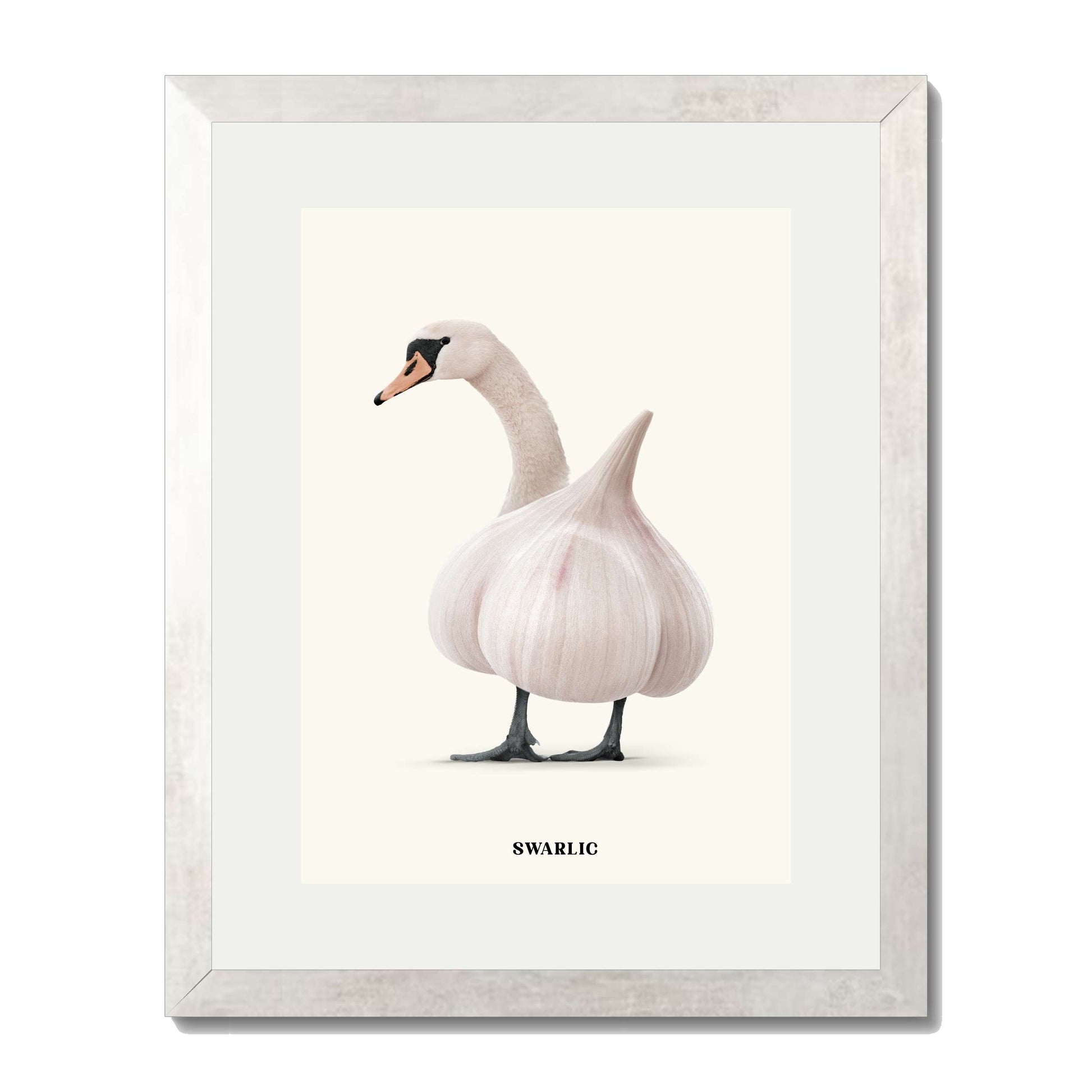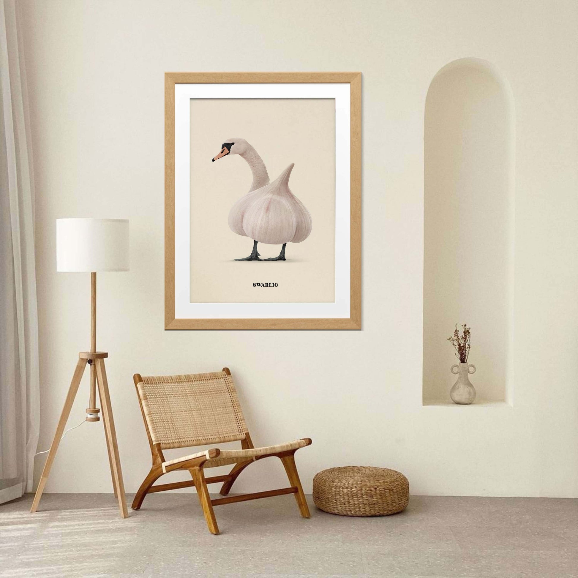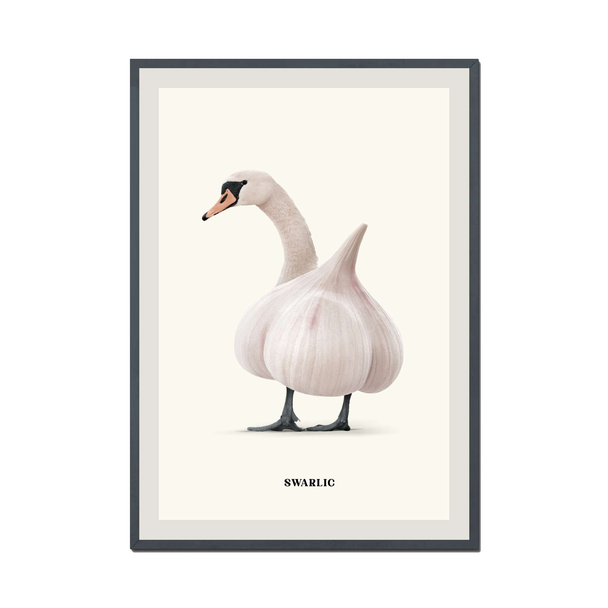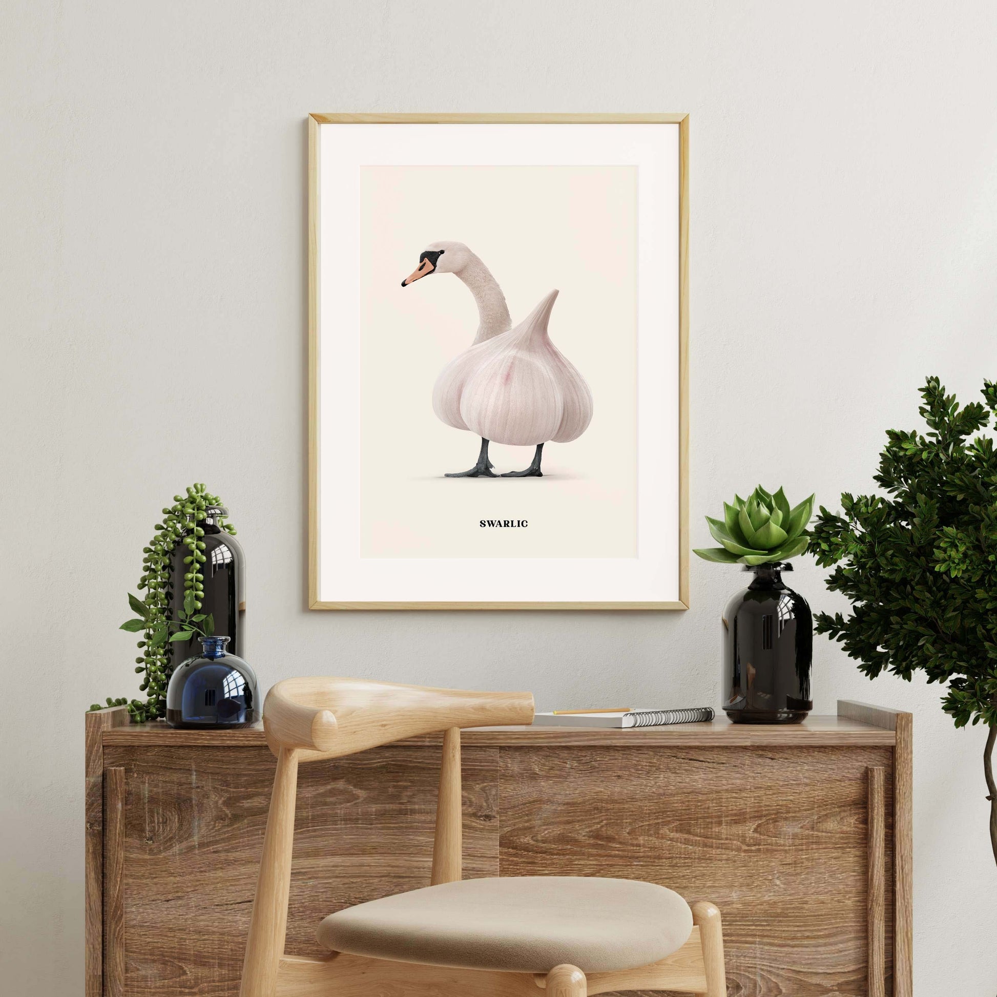 SWARLIC is a surreal and funny wall art print featuring a swan-garlic hybrid with bold text. This quirky piece adds humor and charm to any kitchen, dining area, or modern eclectic space.