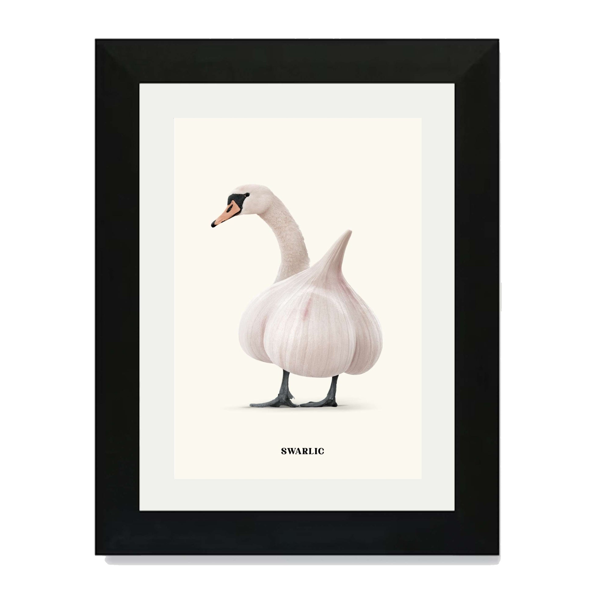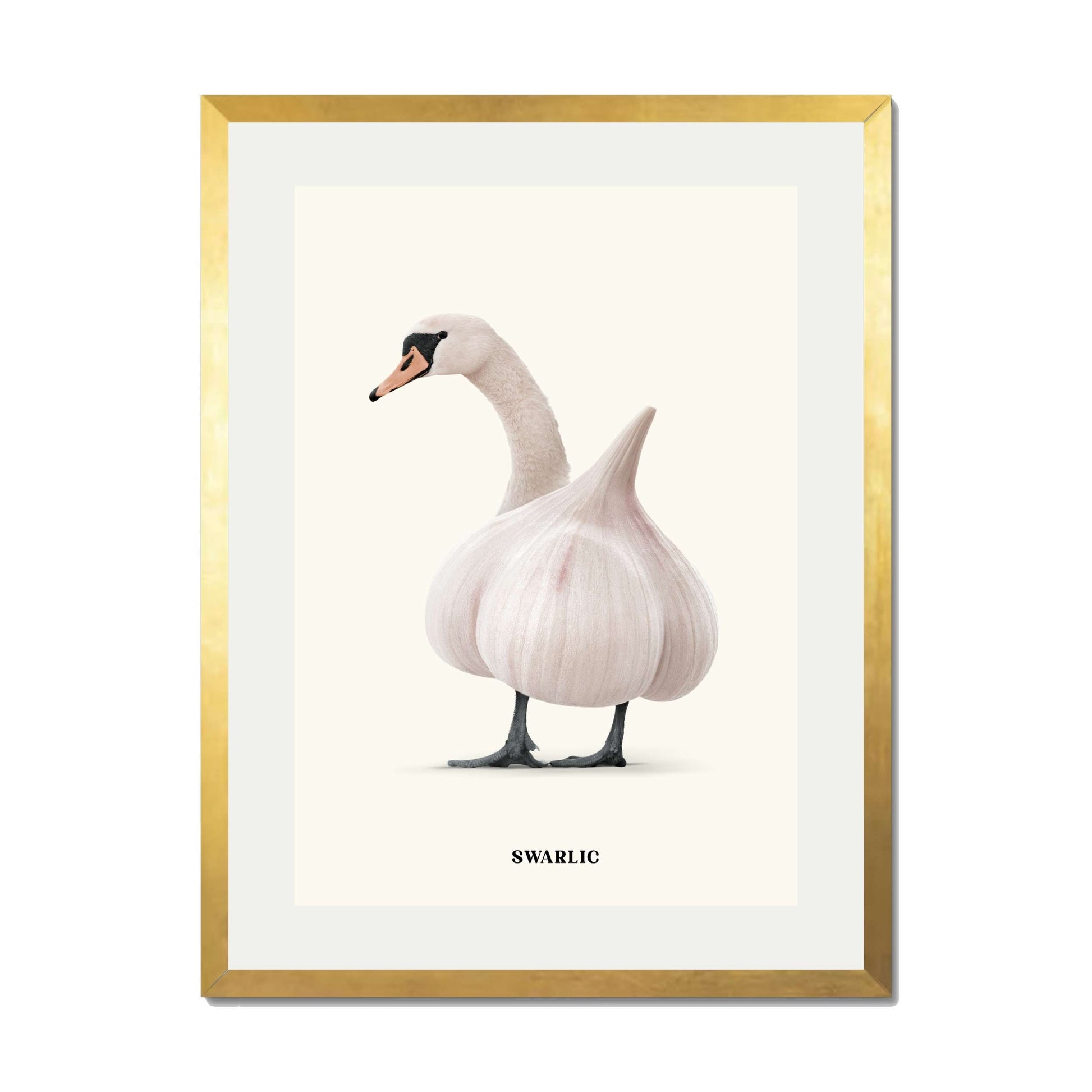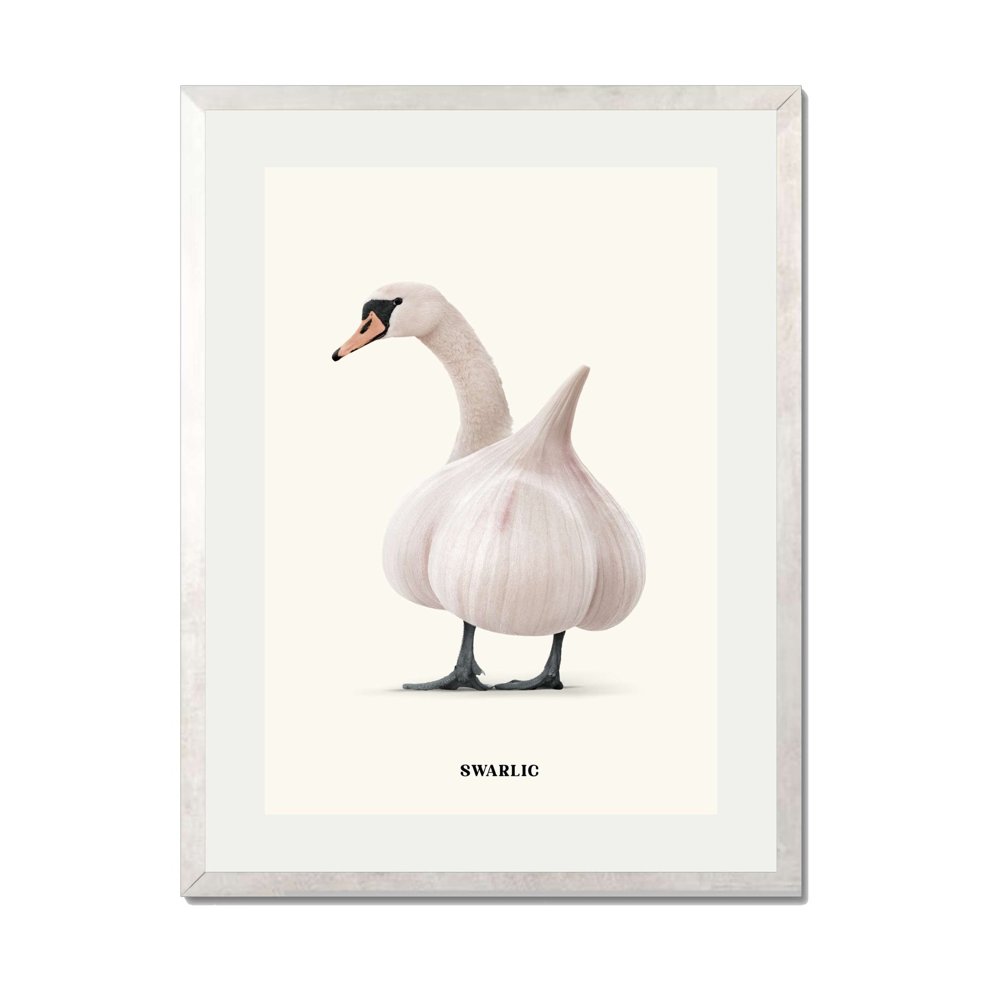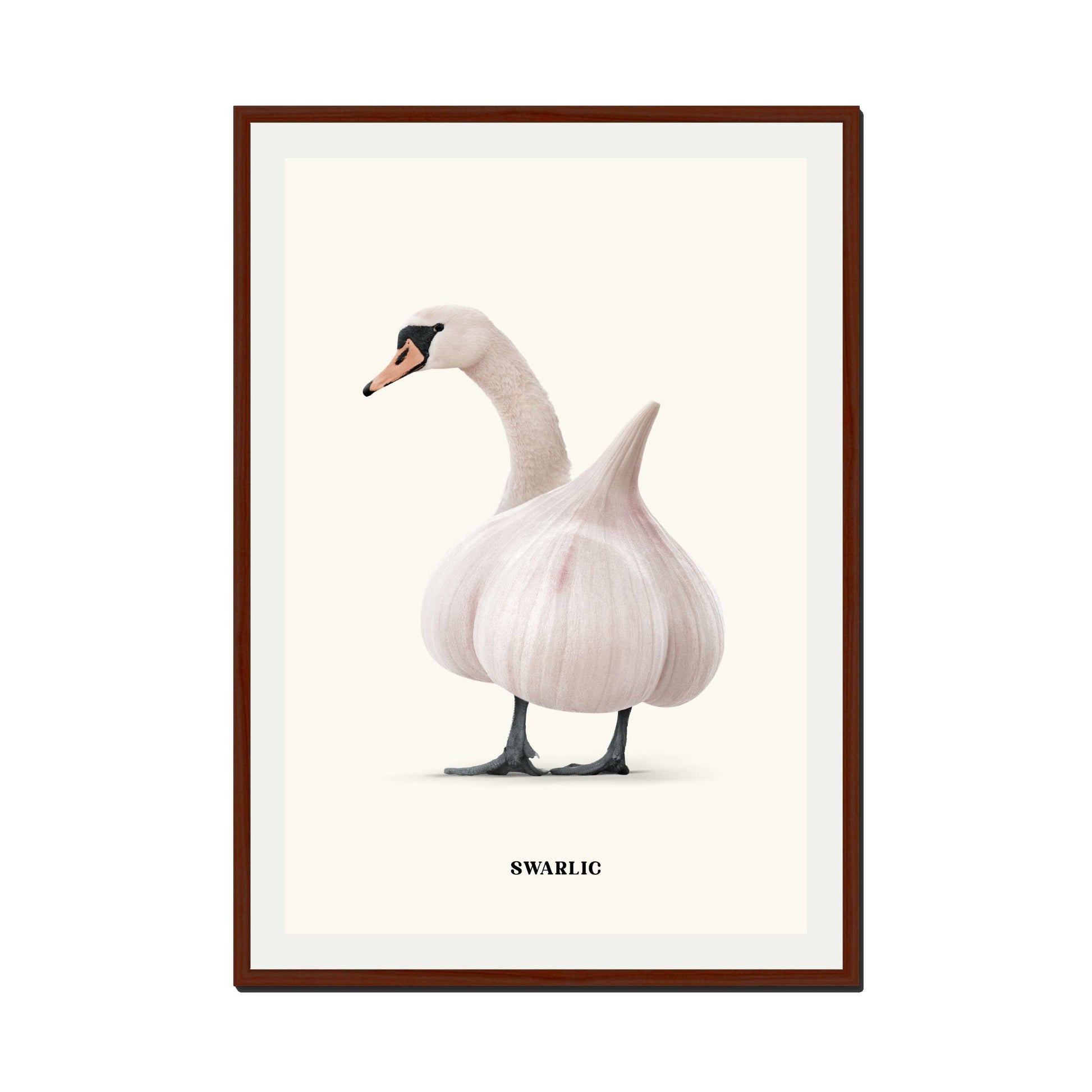 SWARLIC is a surreal and funny wall art print featuring a swan-garlic hybrid with bold text. This quirky piece adds humor and charm to any kitchen, dining area, or modern eclectic space.