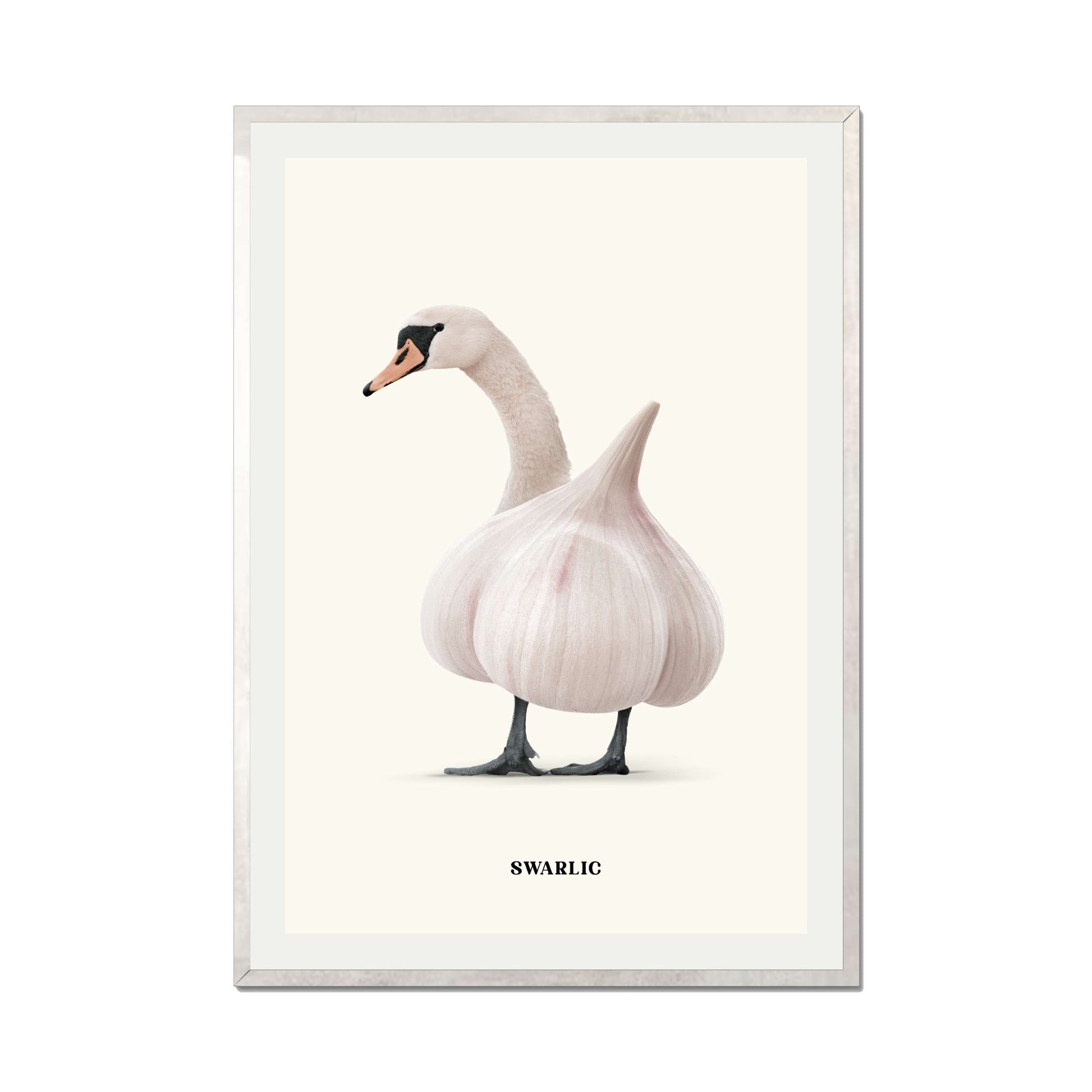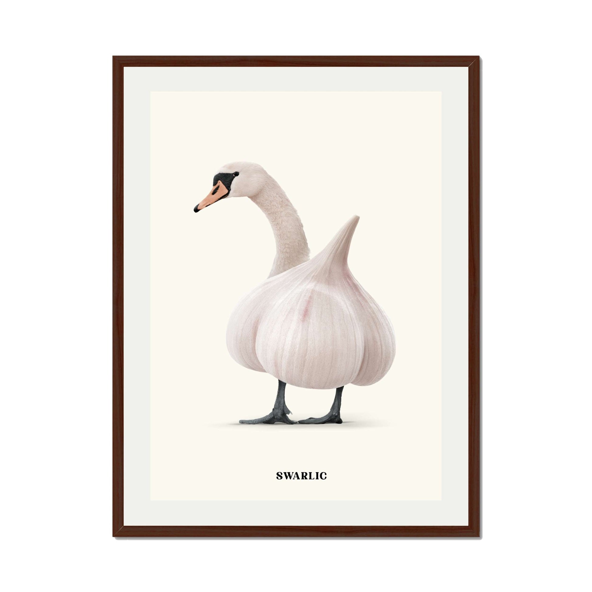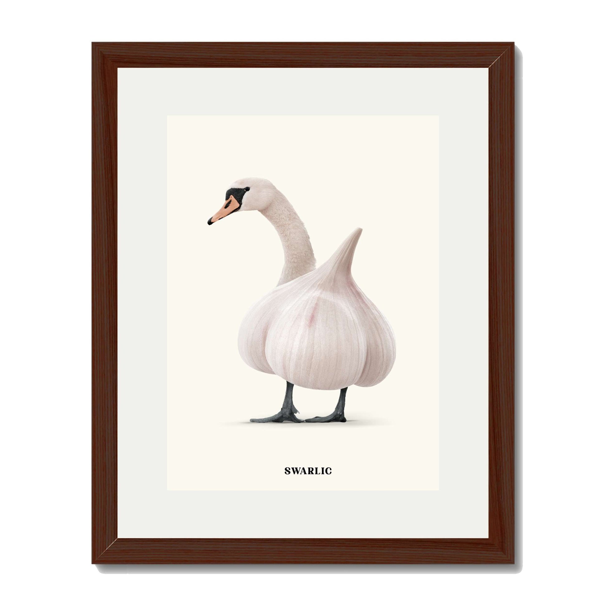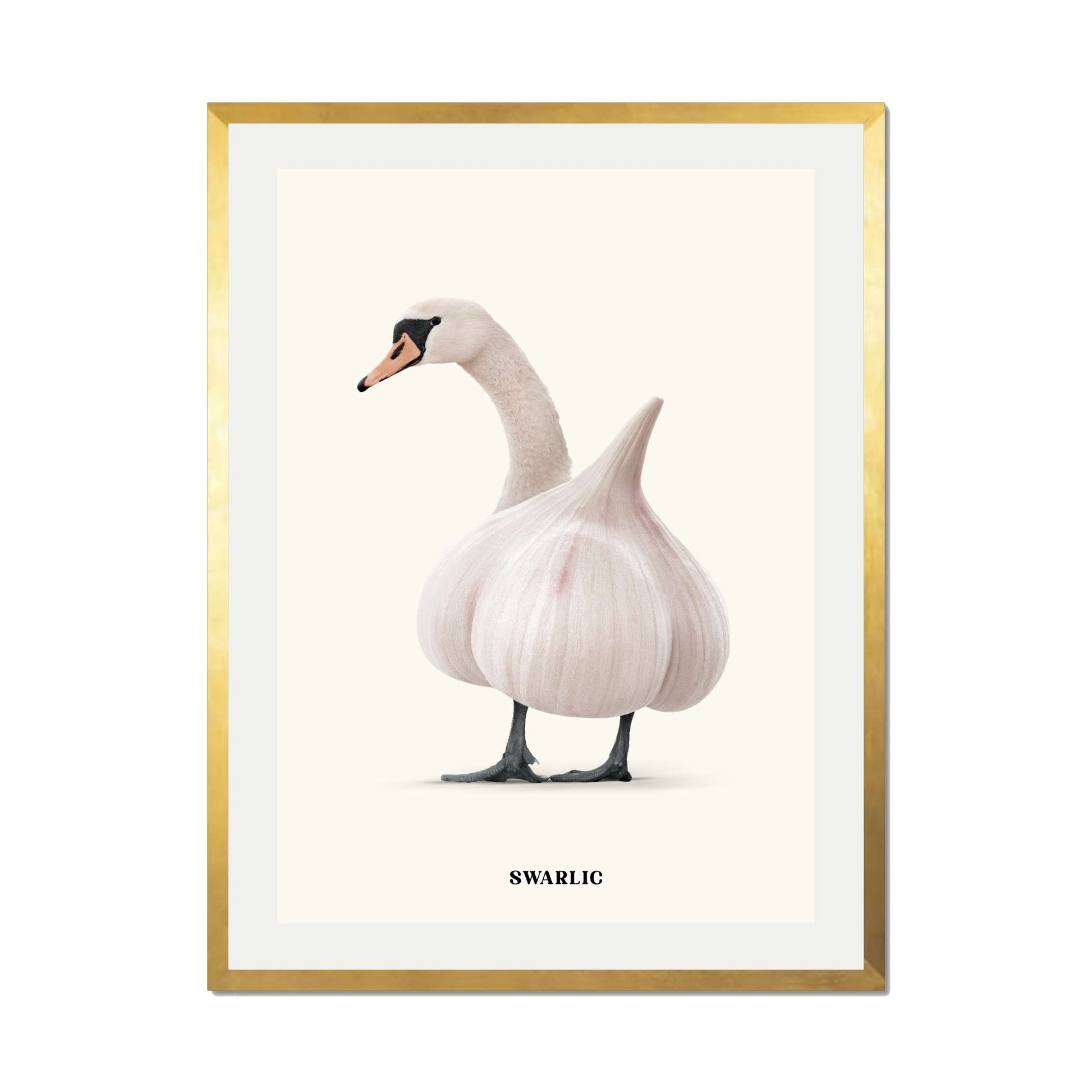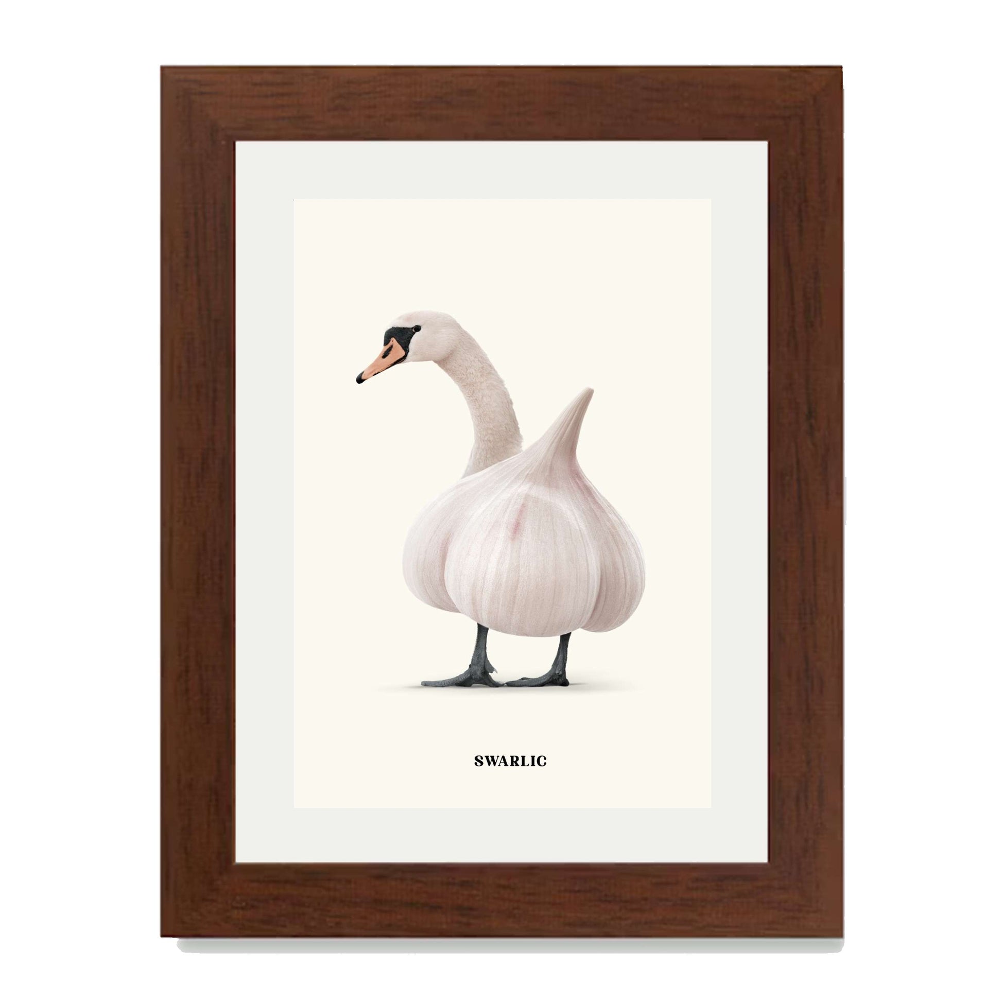 SWARLIC is a surreal and funny wall art print featuring a swan-garlic hybrid with bold text. This quirky piece adds humor and charm to any kitchen, dining area, or modern eclectic space.