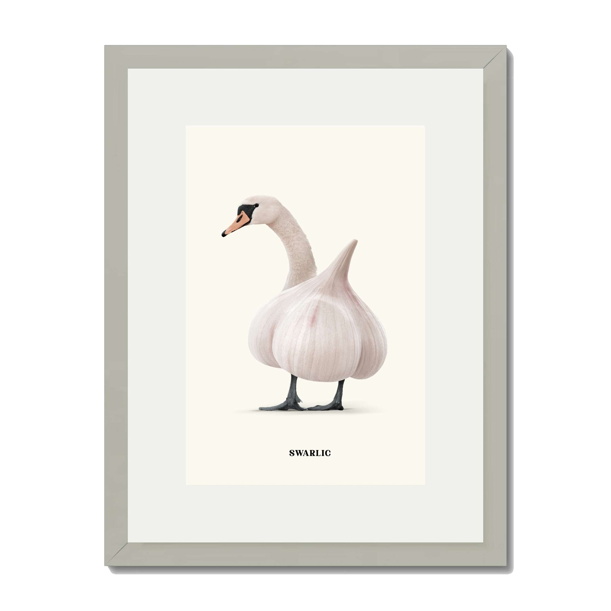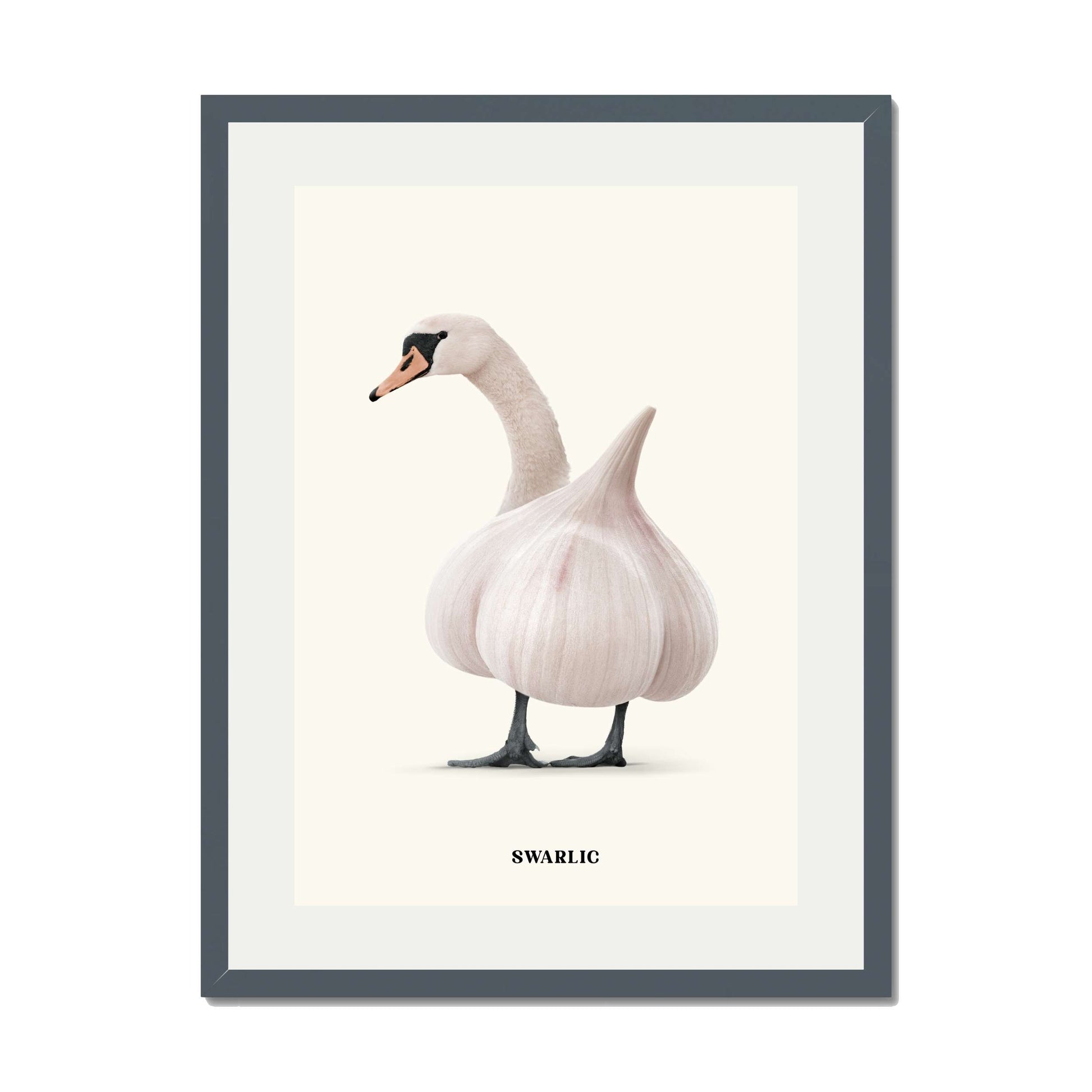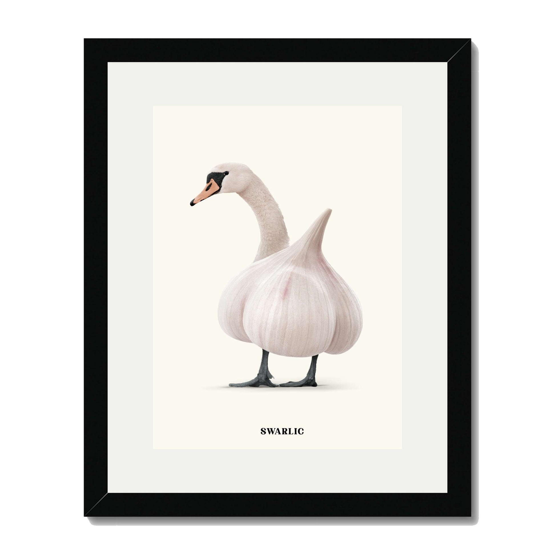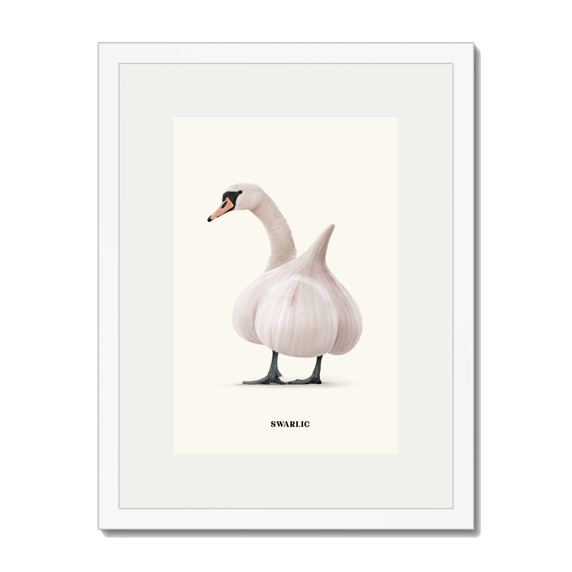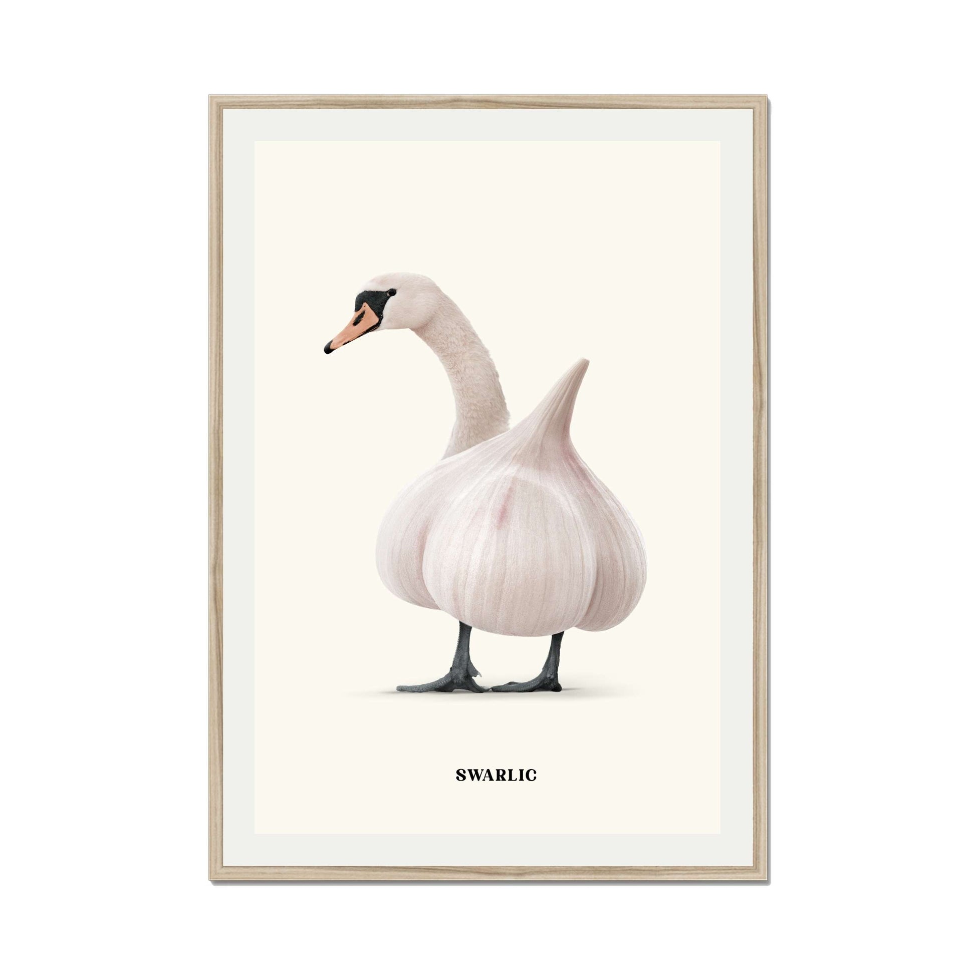 SWARLIC is a surreal and funny wall art print featuring a swan-garlic hybrid with bold text. This quirky piece adds humor and charm to any kitchen, dining area, or modern eclectic space.