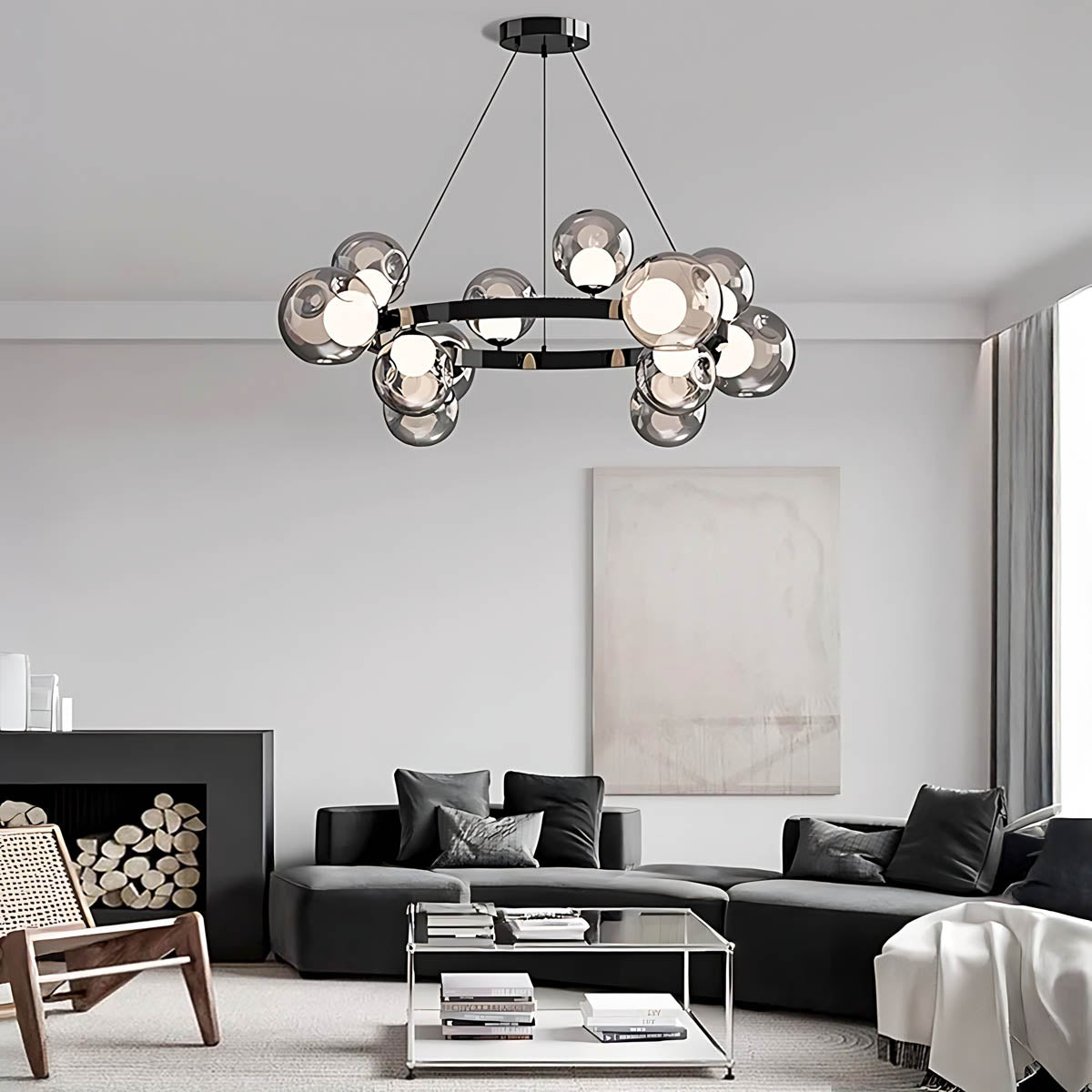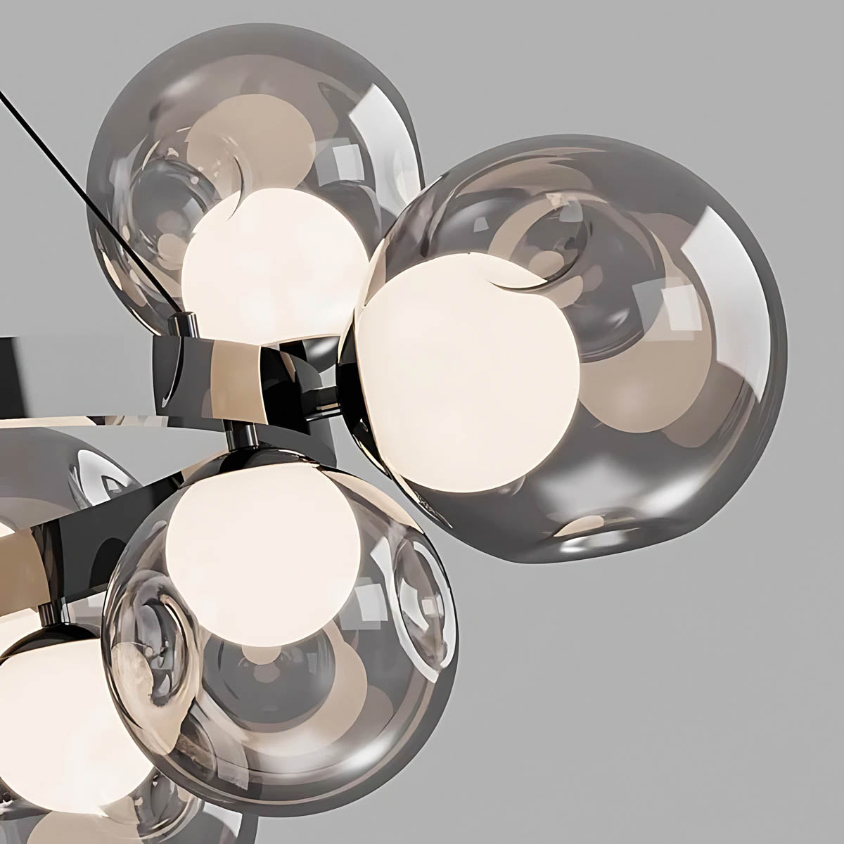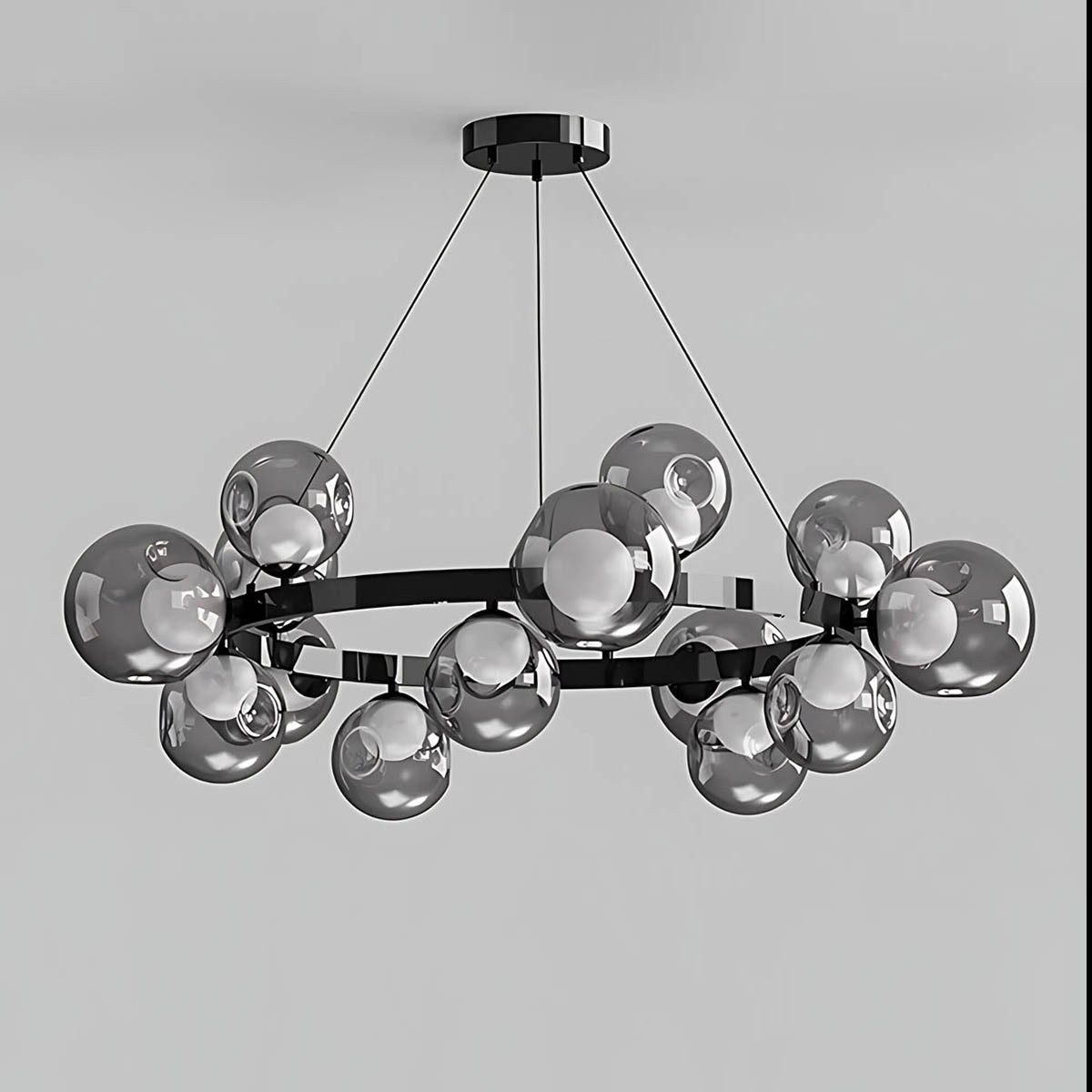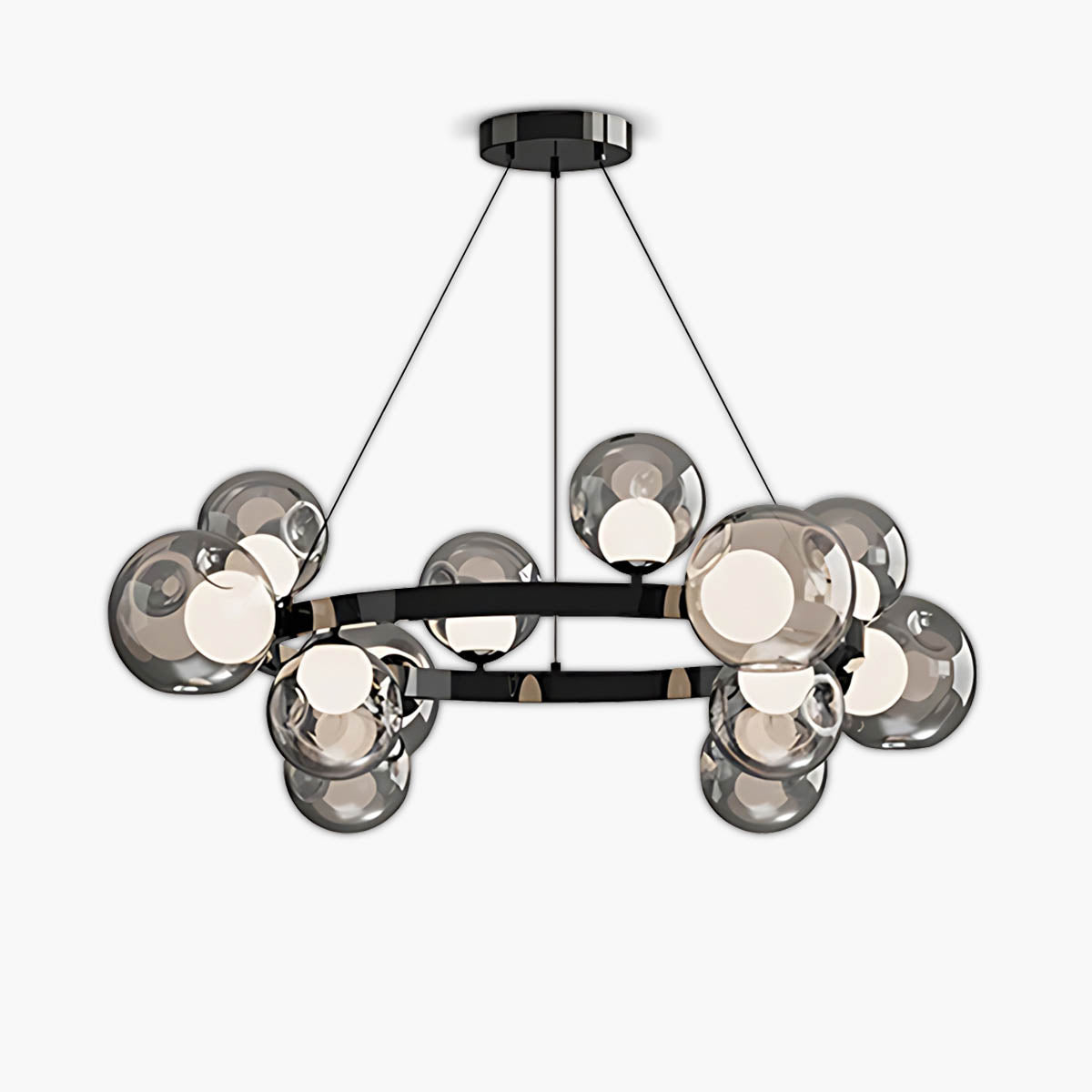 A circular metal band suspends a constellation of smoky glass spheres, each encasing a soft, opal-style light source that diffuses a warm, flattering glow across dining rooms, living areas or hotel-style foyers.