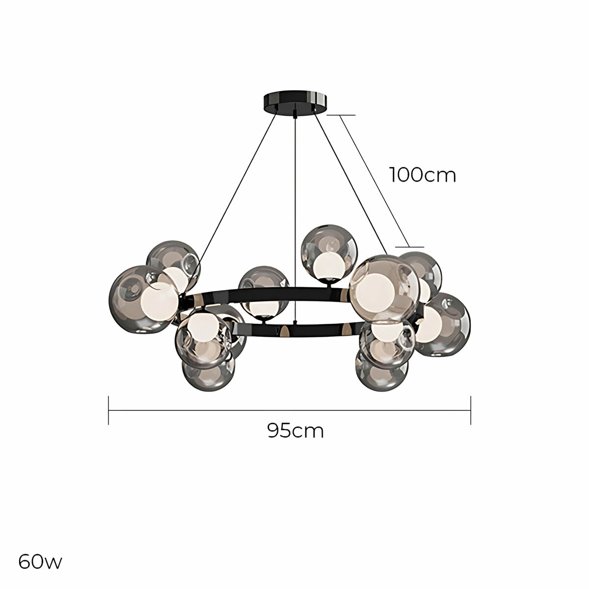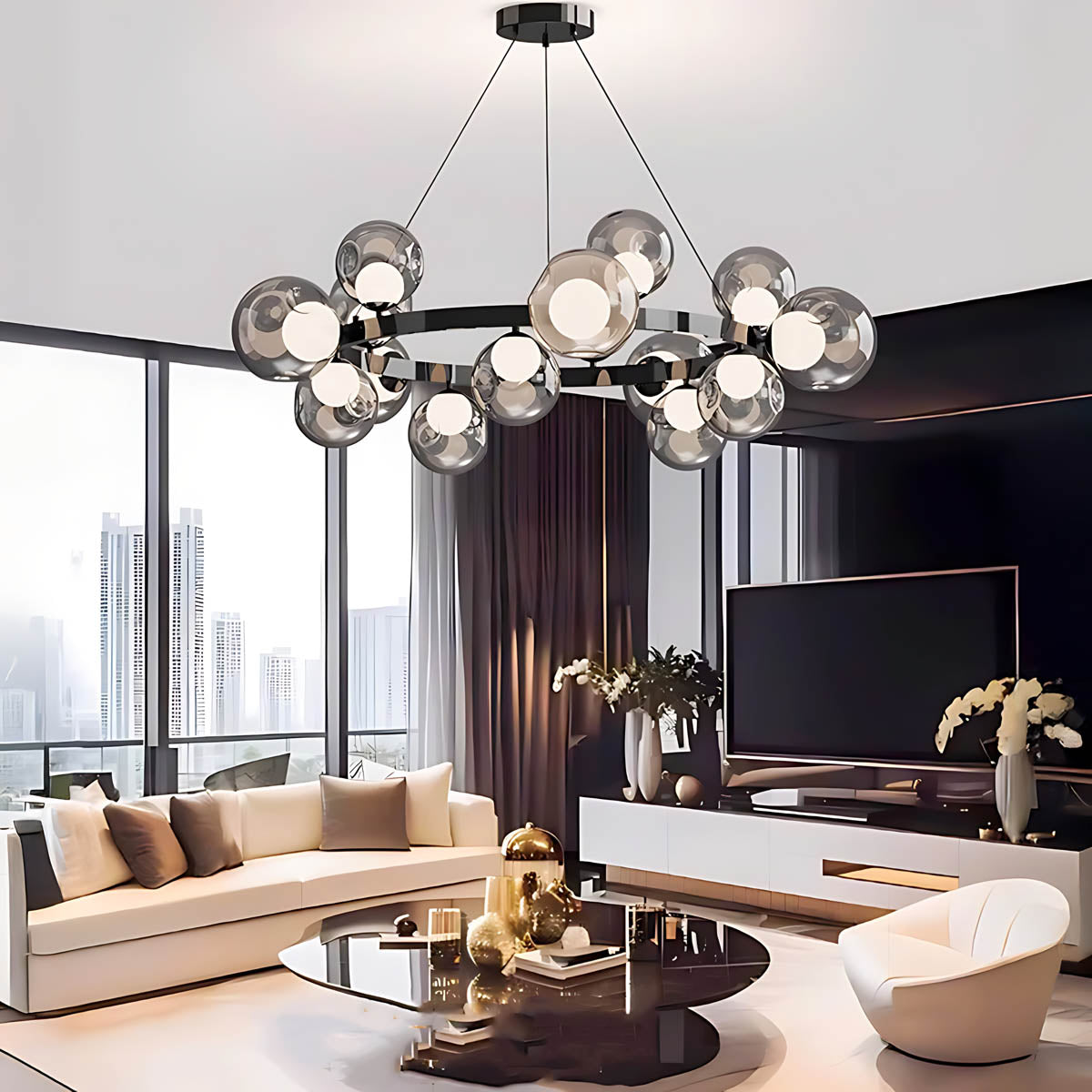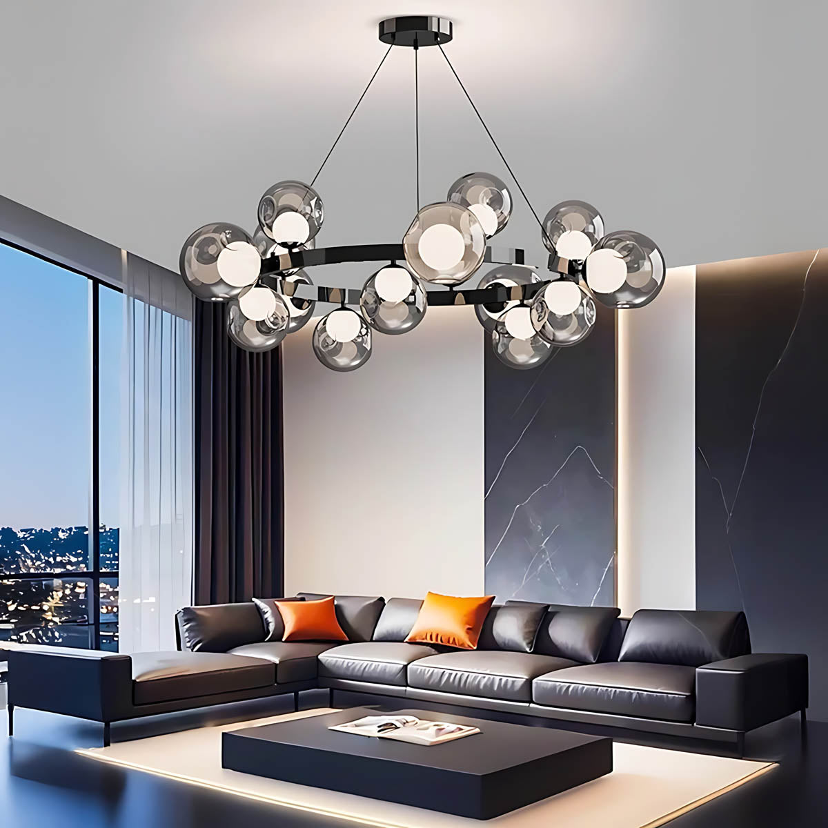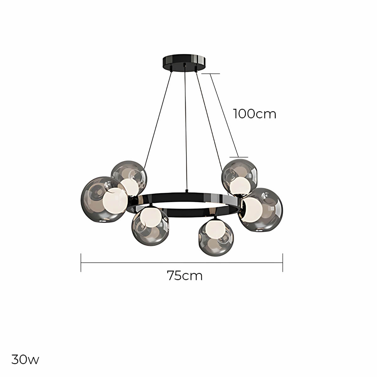 A circular metal band suspends a constellation of smoky glass spheres, each encasing a soft, opal-style light source that diffuses a warm, flattering glow across dining rooms, living areas or hotel-style foyers.