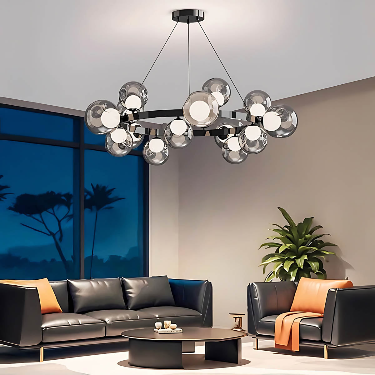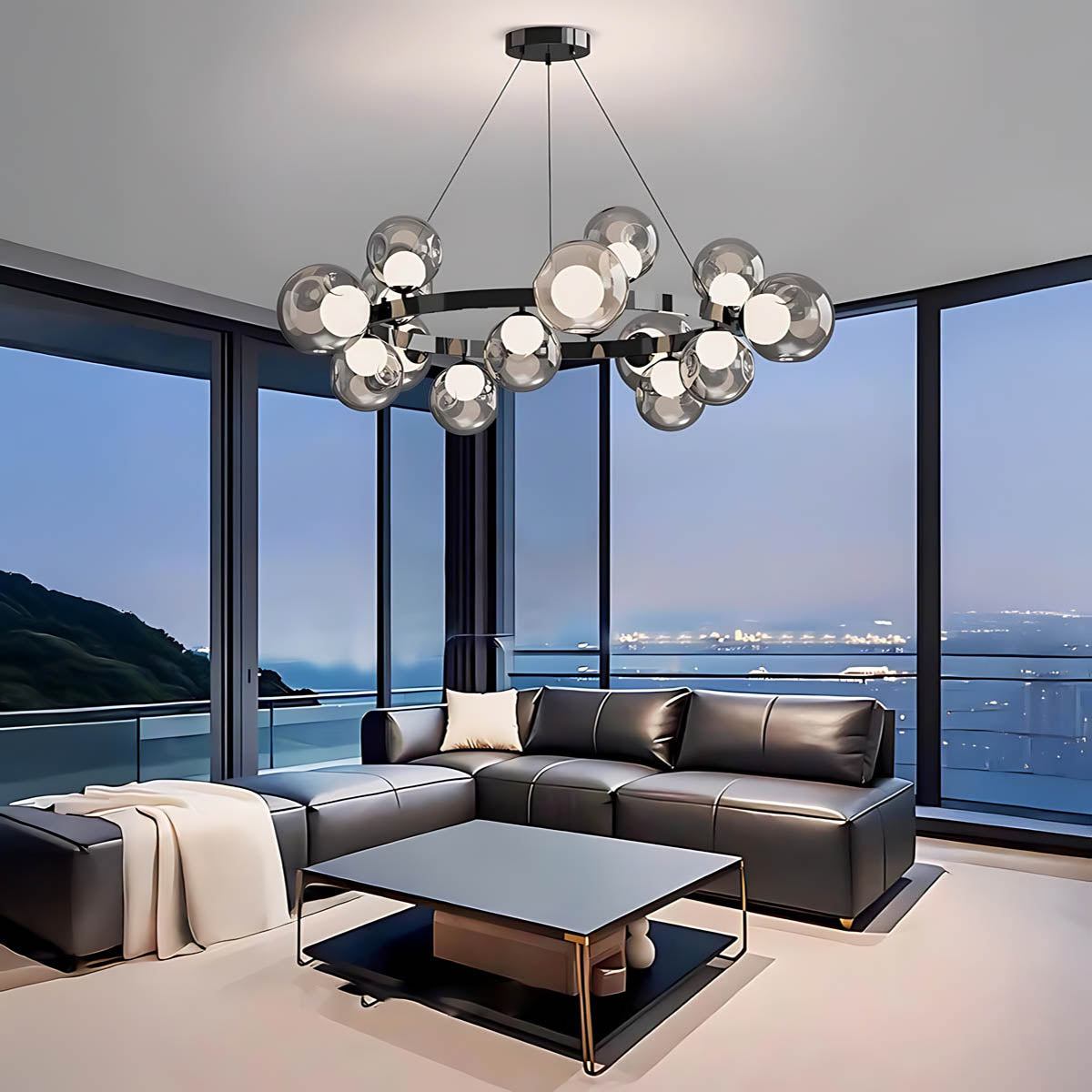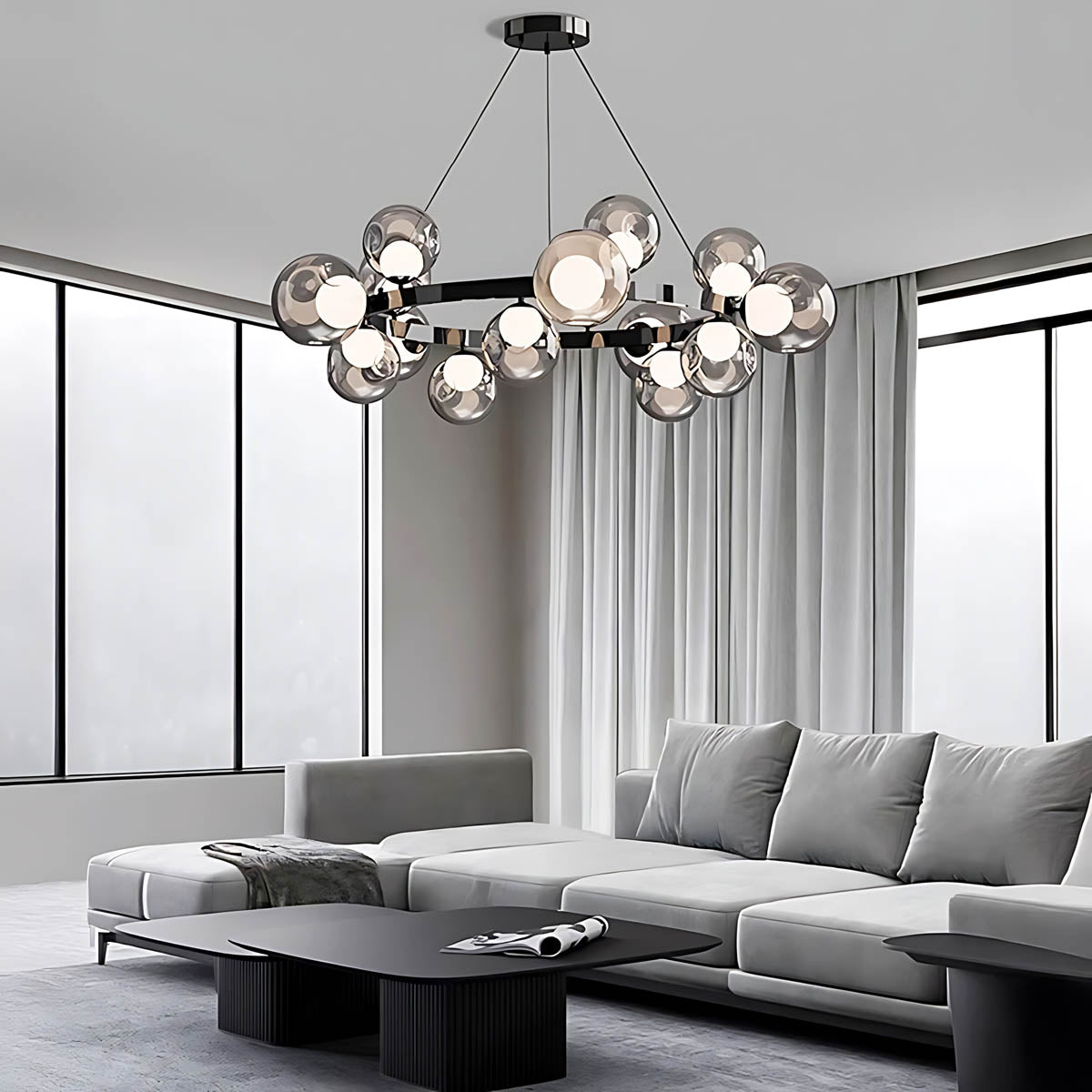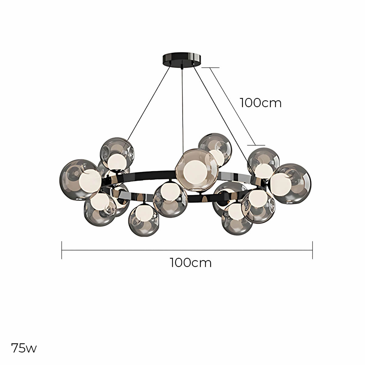 A circular metal band suspends a constellation of smoky glass spheres, each encasing a soft, opal-style light source that diffuses a warm, flattering glow across dining rooms, living areas or hotel-style foyers.