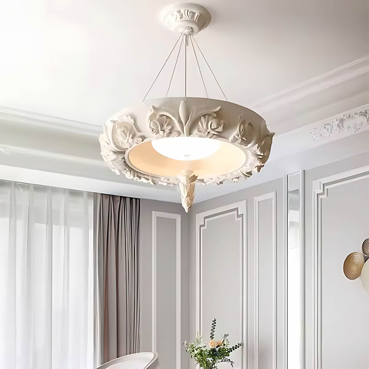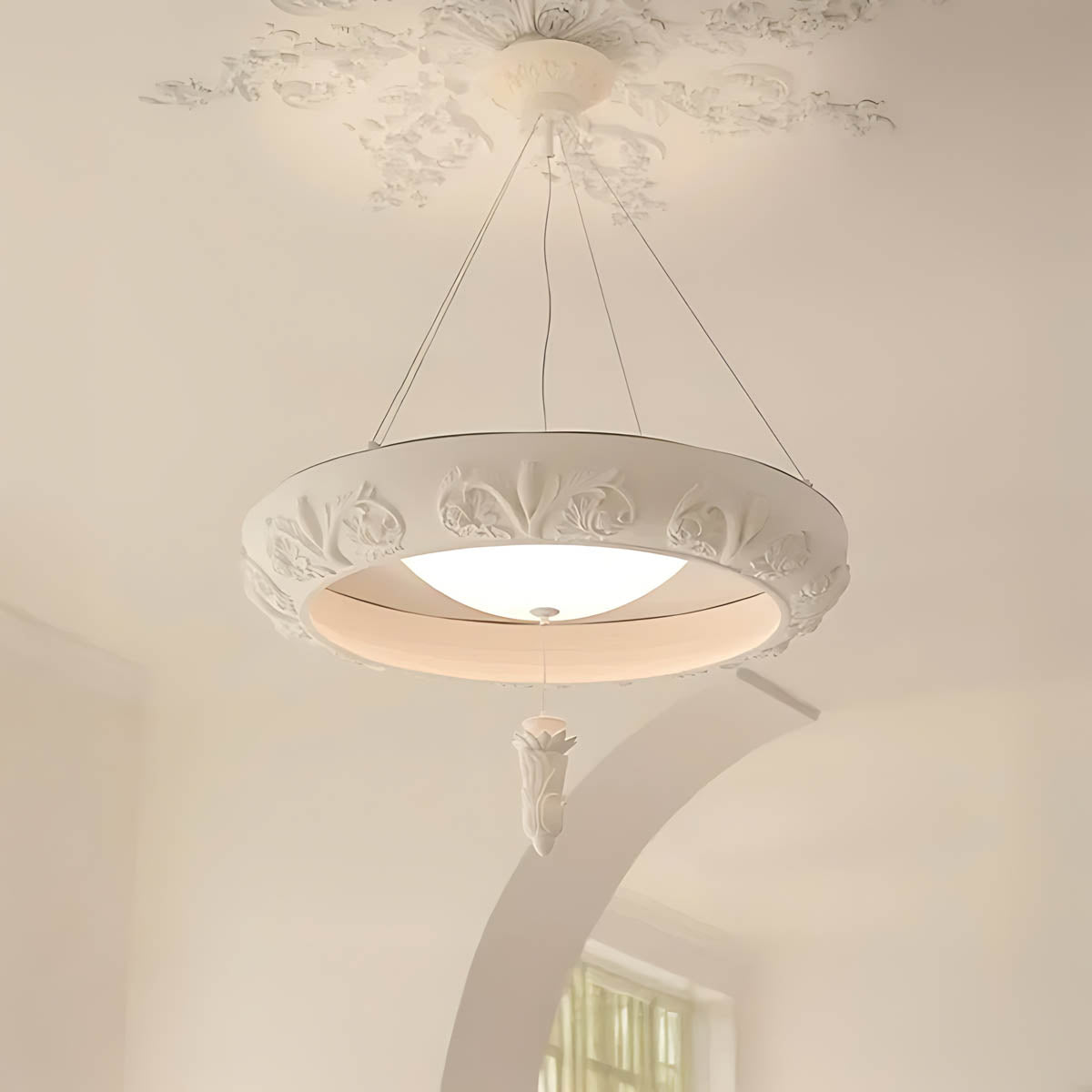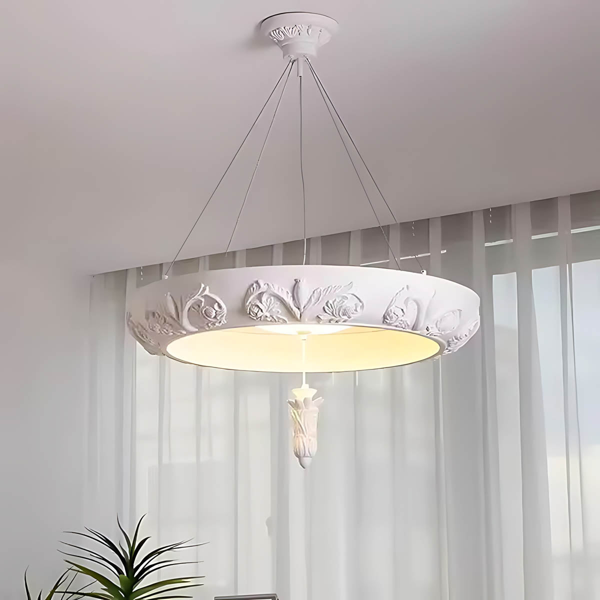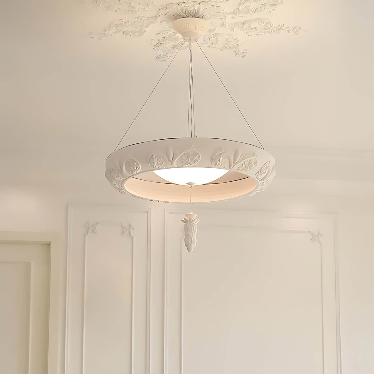 Its carved, neoclassical ring—complete with graceful floral reliefs and a refined drop finial—floats from discreet suspension cables, creating a light, architectural silhouette that complements Parisian, transitional, and contemporary interiors.