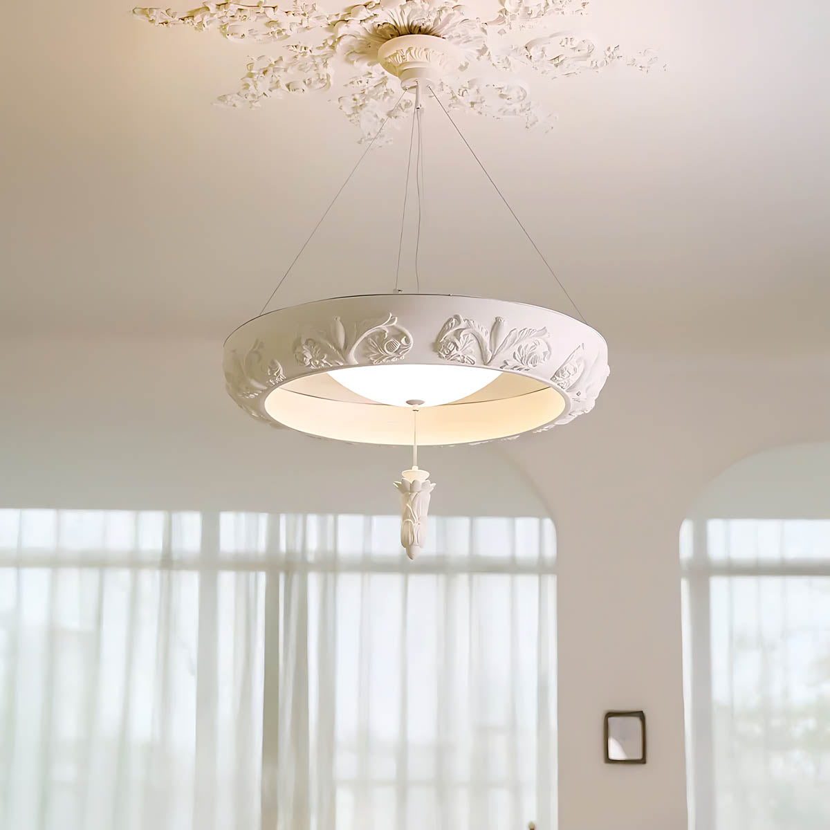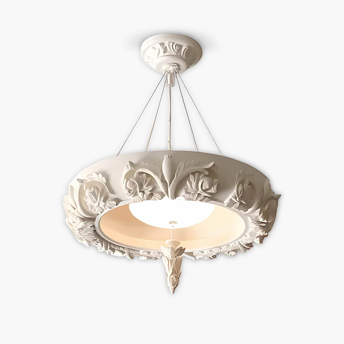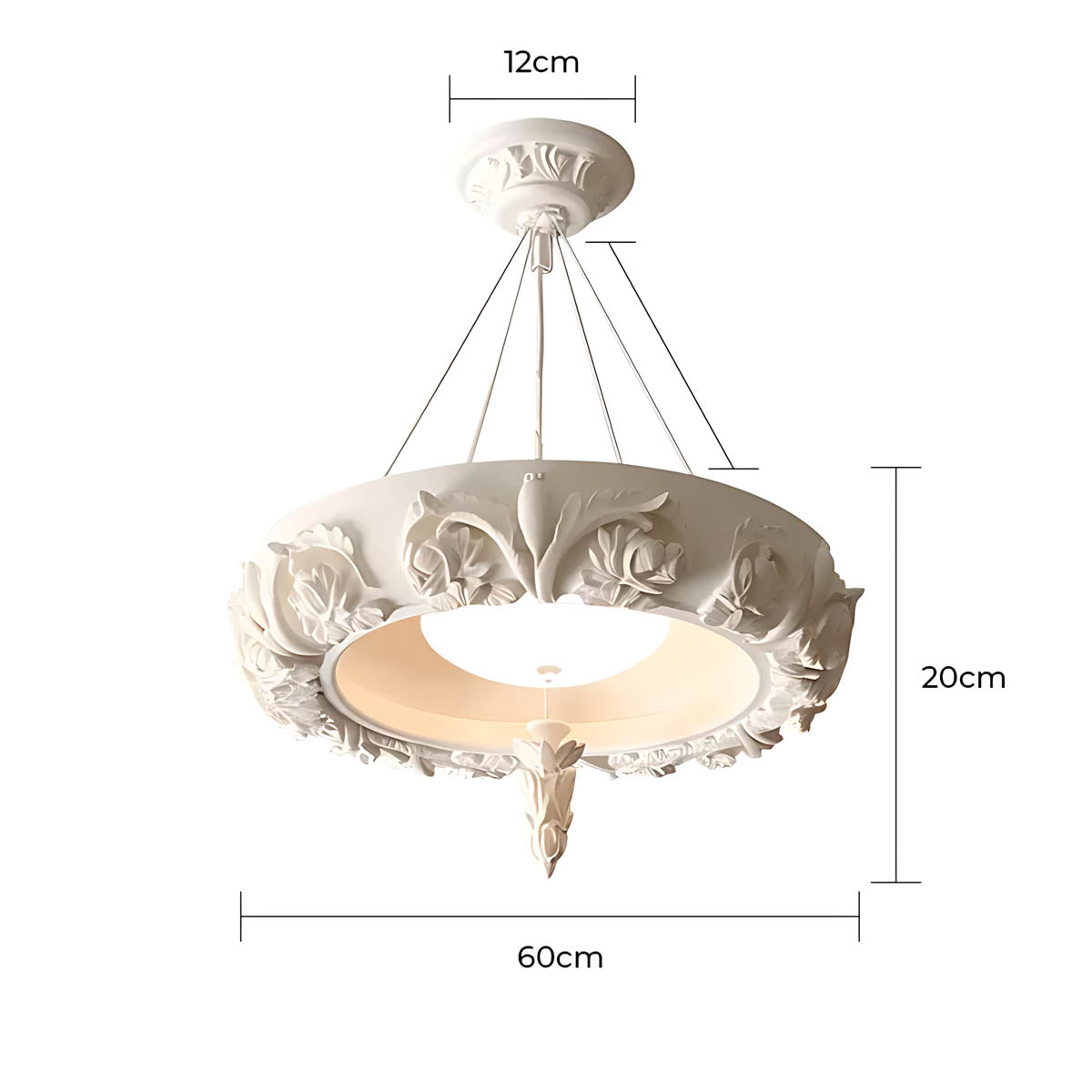 Its carved, neoclassical ring—complete with graceful floral reliefs and a refined drop finial—floats from discreet suspension cables, creating a light, architectural silhouette that complements Parisian, transitional, and contemporary interiors.