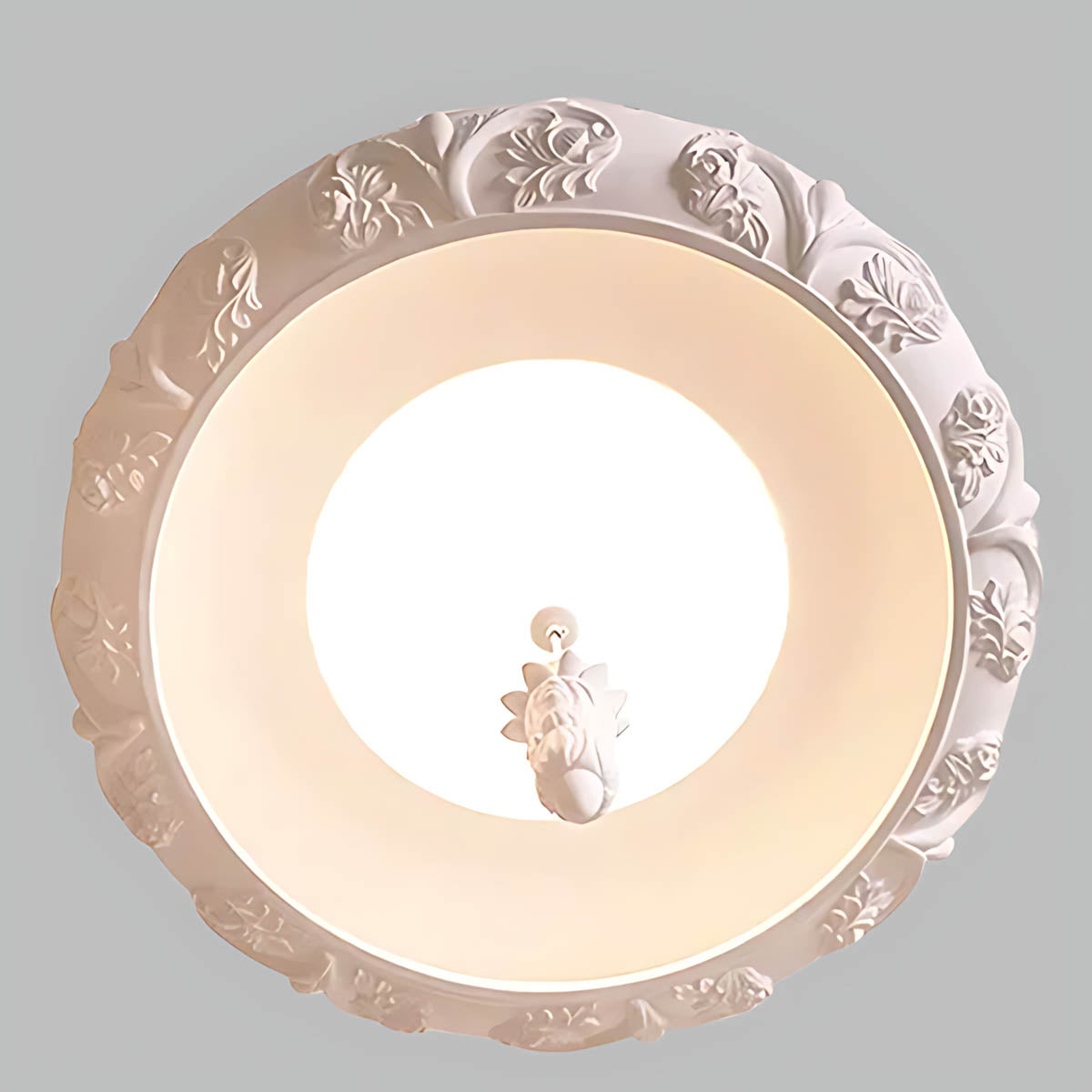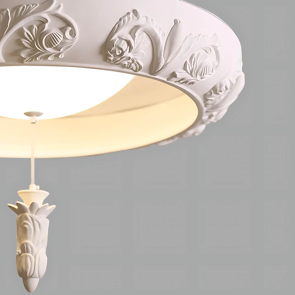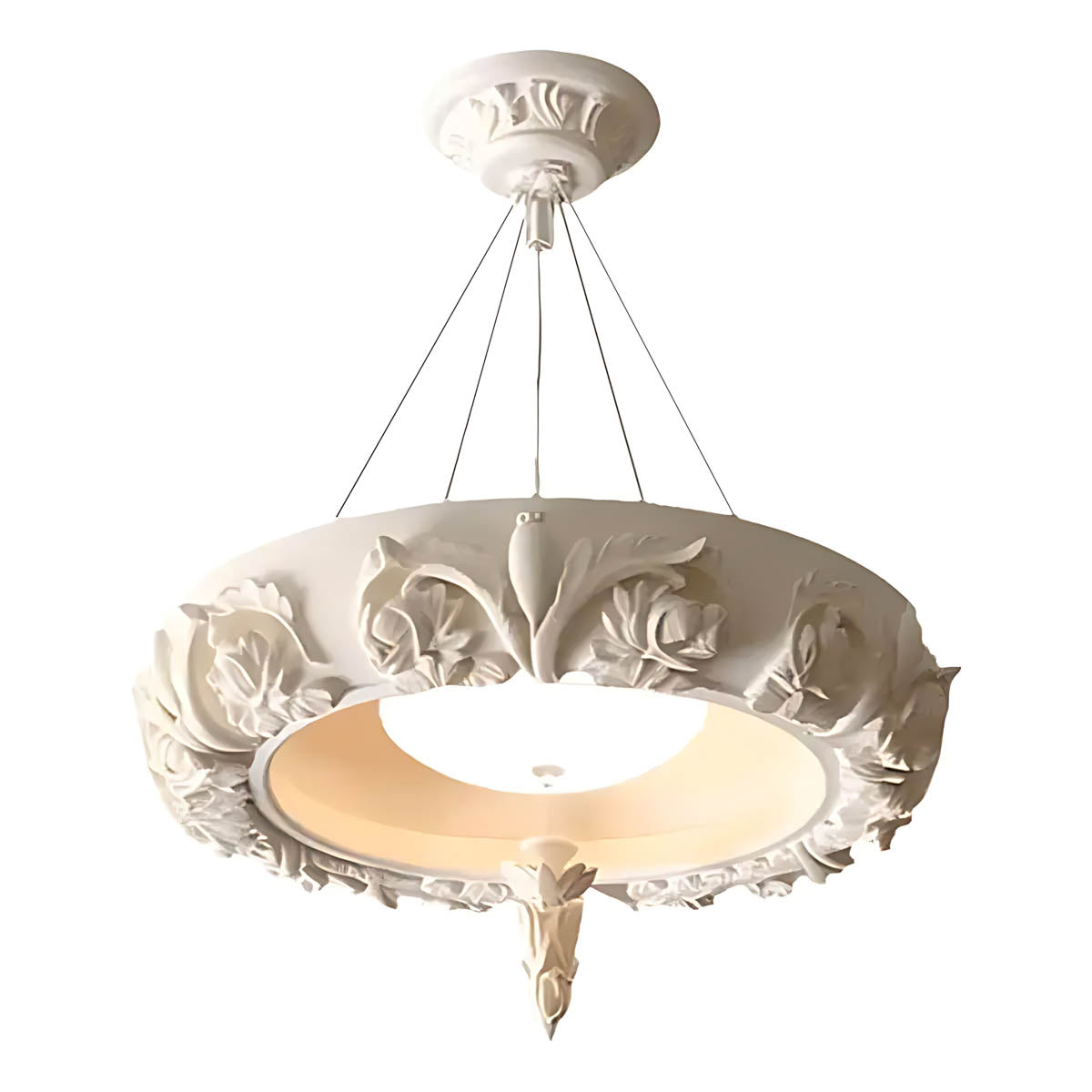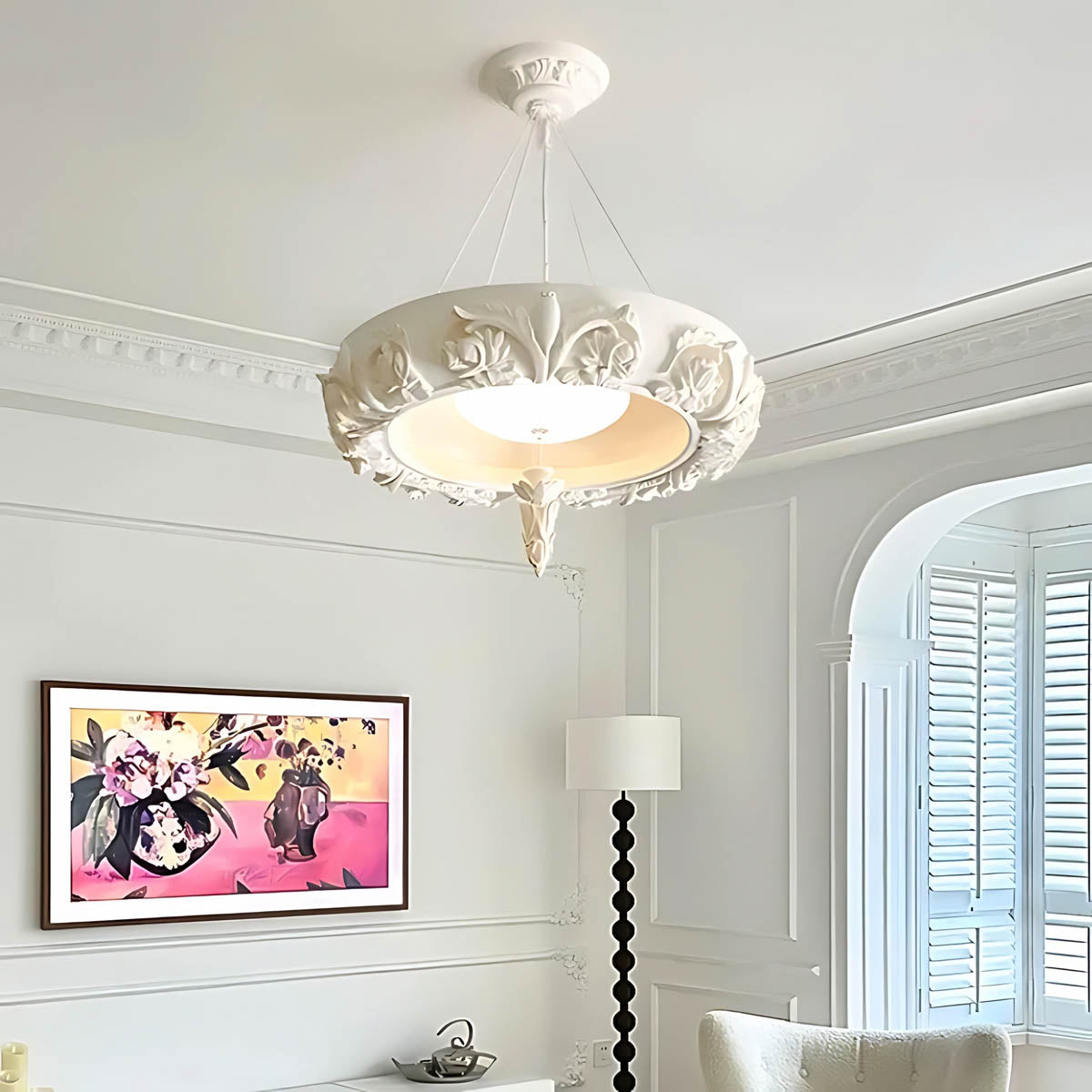 Its carved, neoclassical ring—complete with graceful floral reliefs and a refined drop finial—floats from discreet suspension cables, creating a light, architectural silhouette that complements Parisian, transitional, and contemporary interiors.