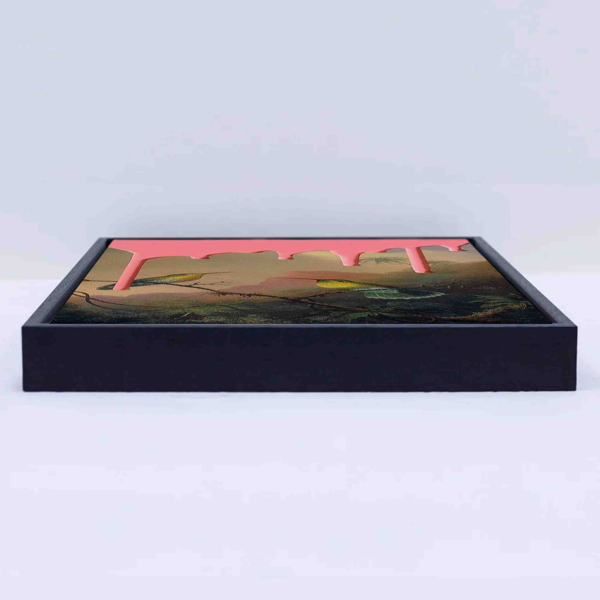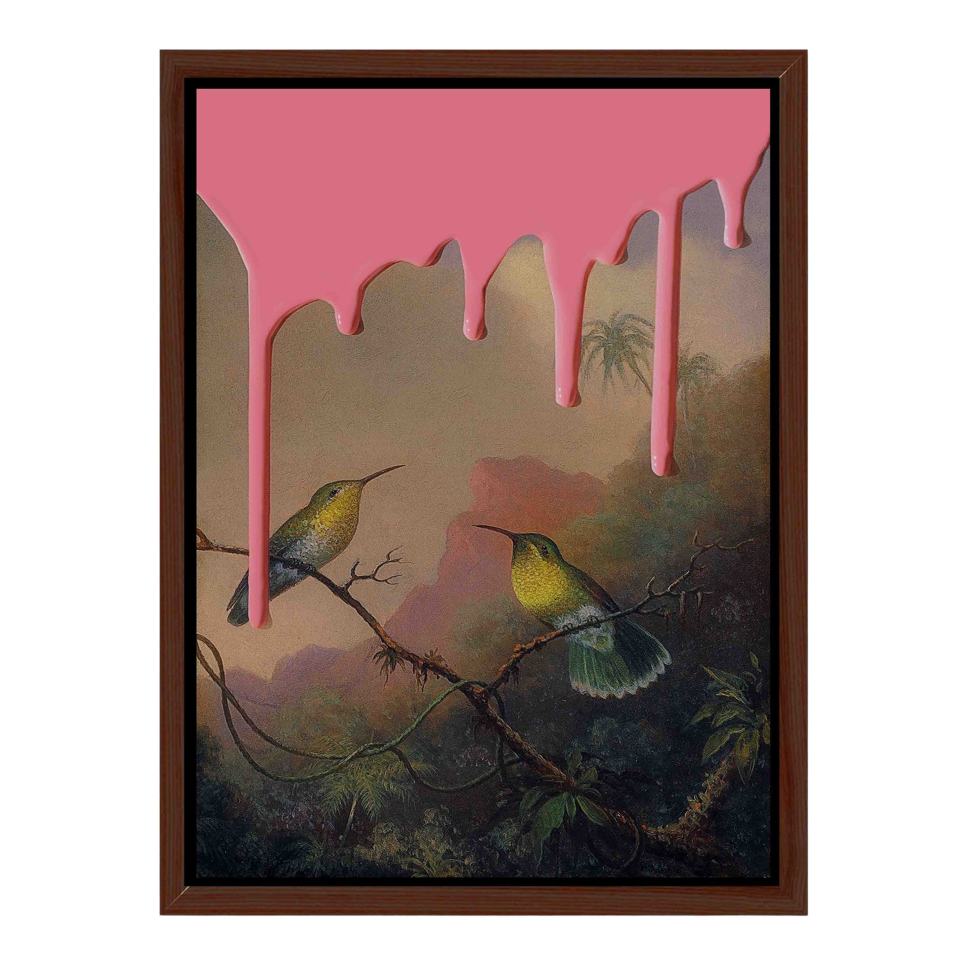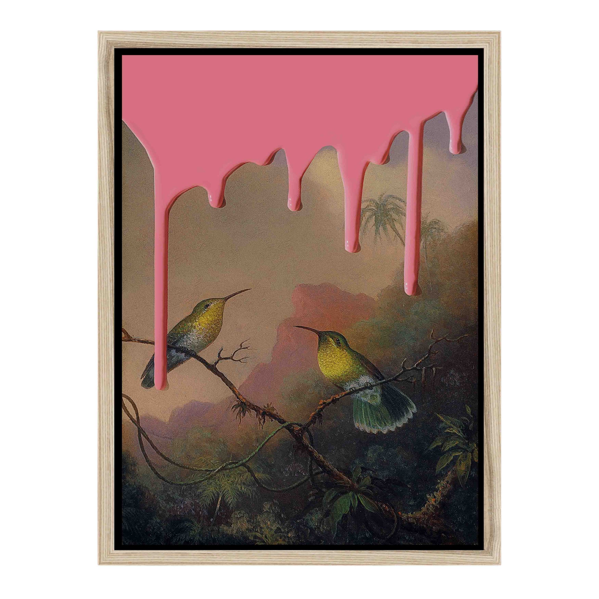 Vibrant canvas print featuring two vintage-style hummingbirds in a jungle scene with a bold neon pink paint drip overlay. A unique fusion of classic art and modern street art.