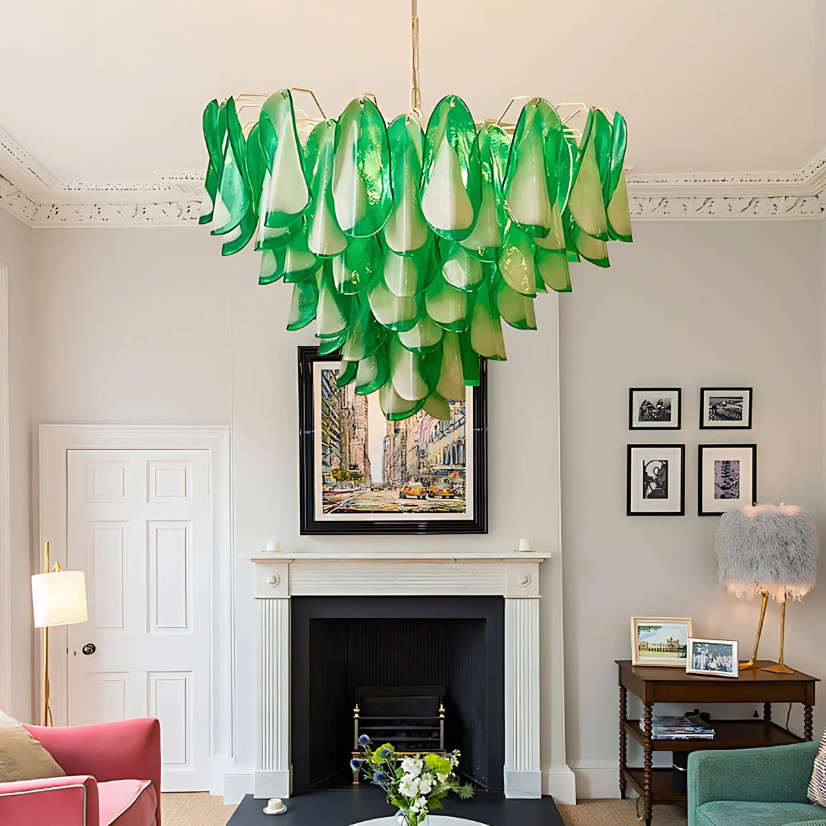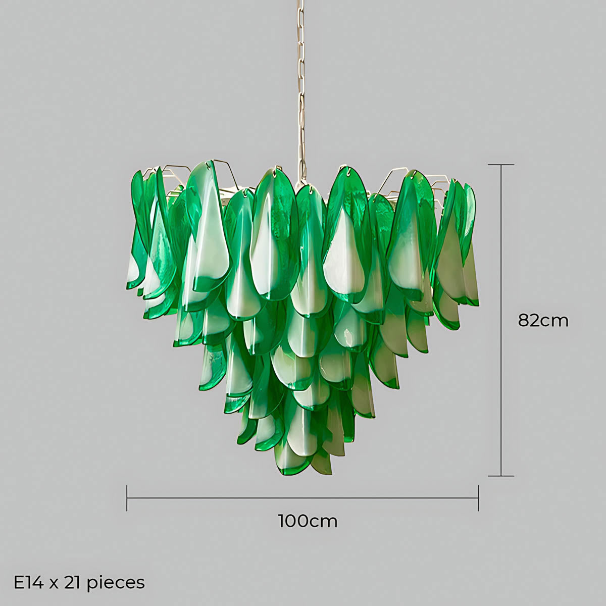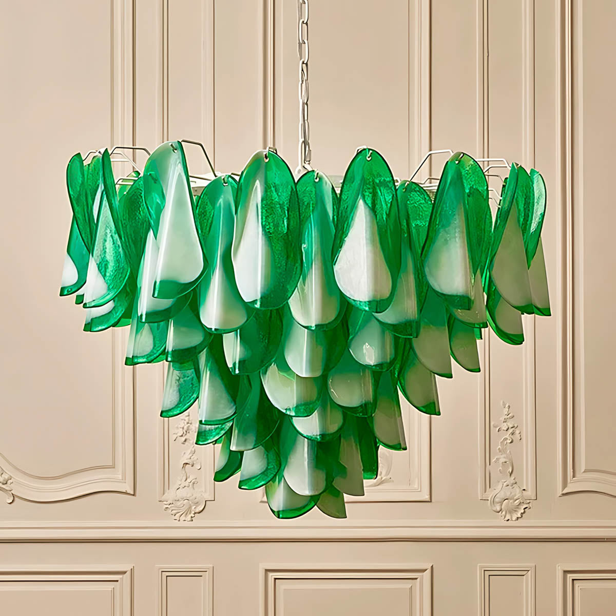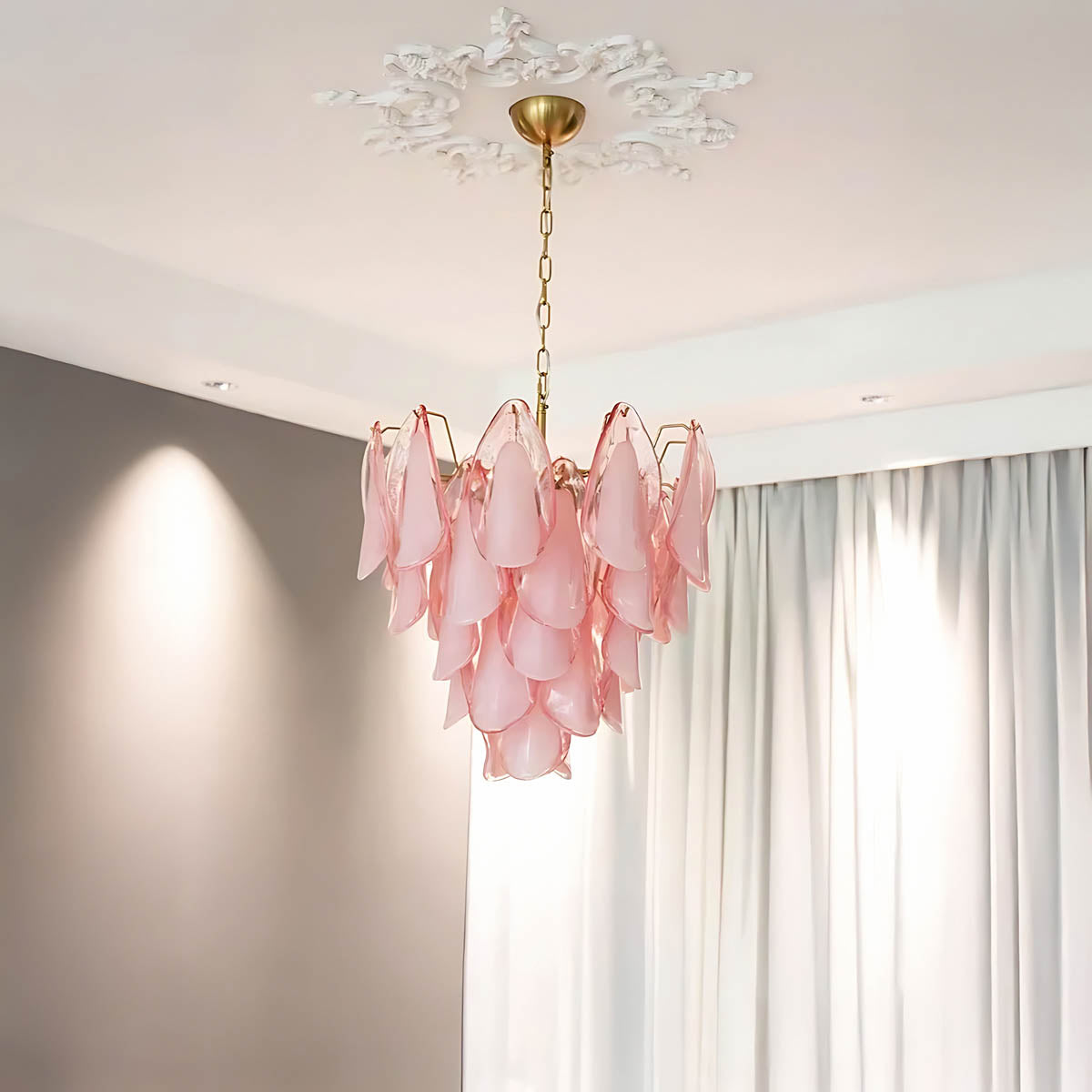 Featuring cascading hand-formed glass petals that shimmer with elegance, this chandelier captures the essence of modern luxury with a hint of organic charm.