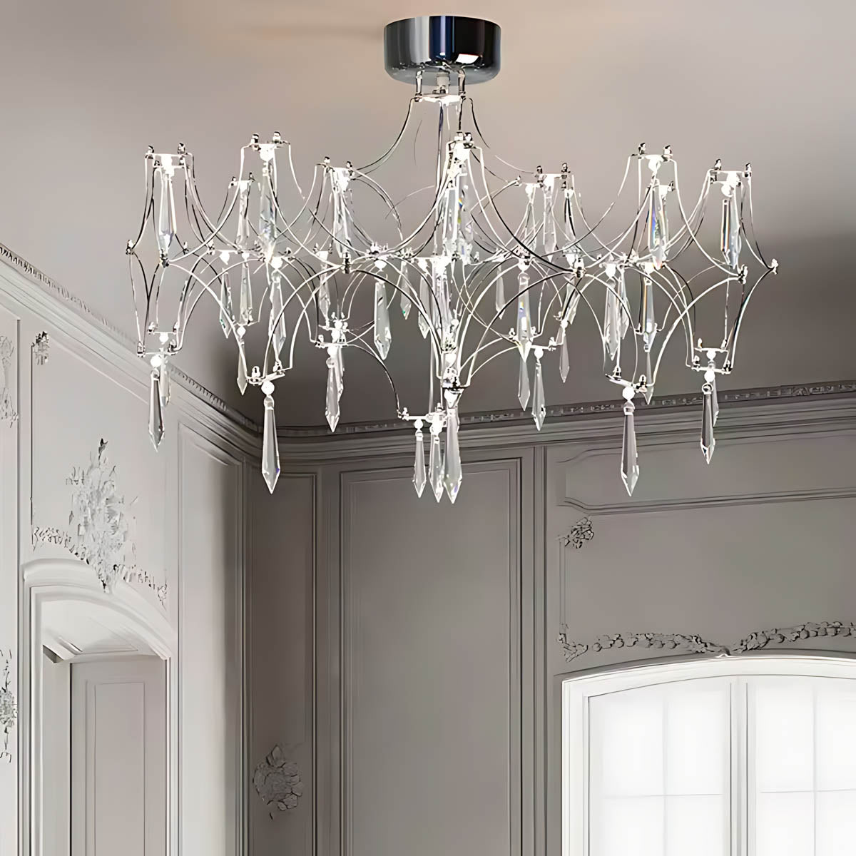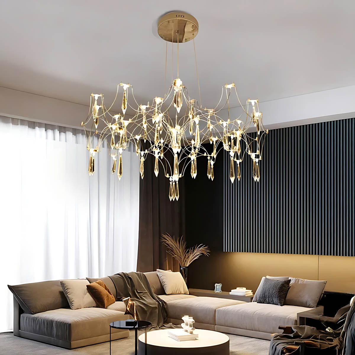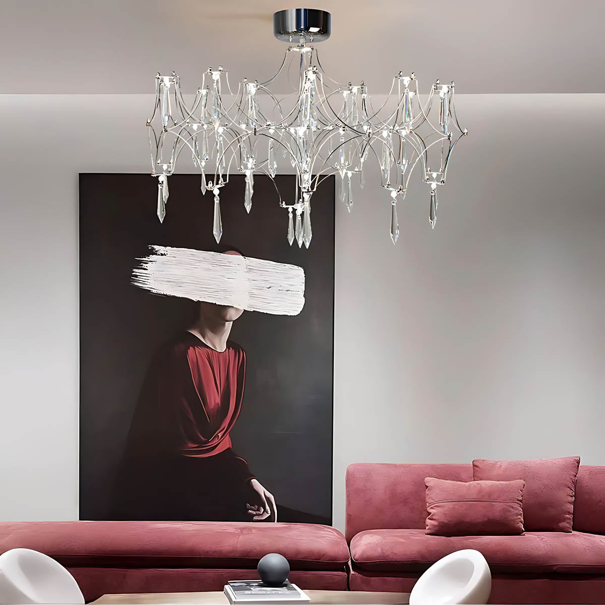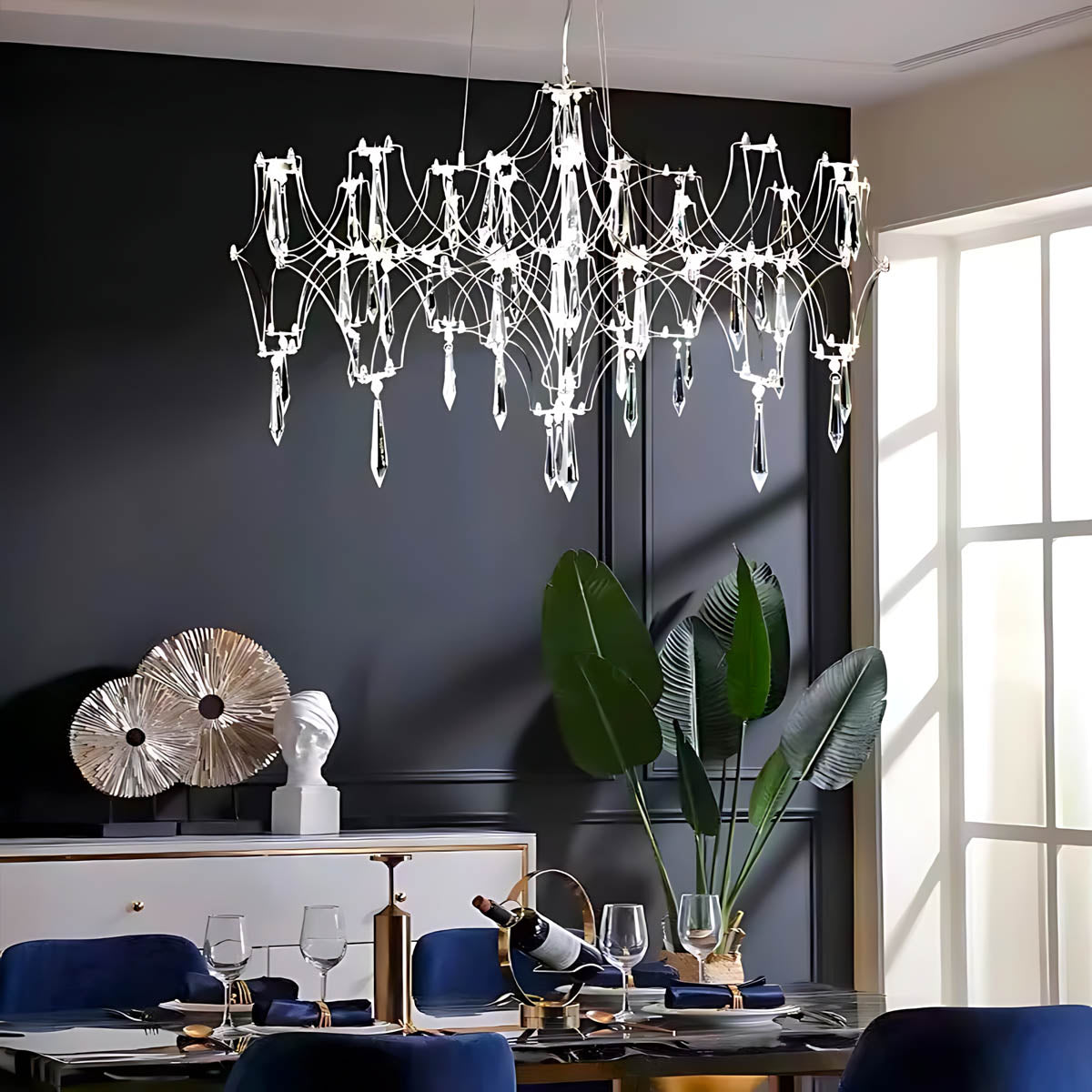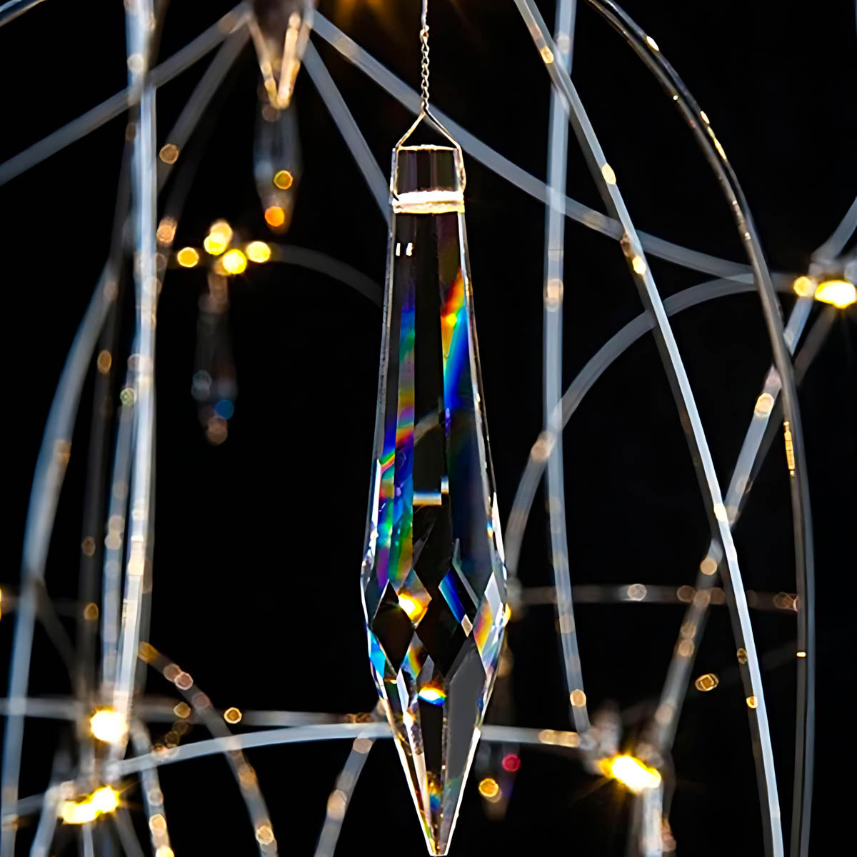 Hand-formed stainless steel branches cradle faceted crystal drops that catch and scatter light into a mesmerizing, prismatic glow, creating a statement centerpiece for living rooms, dining spaces, and grand entryways.
