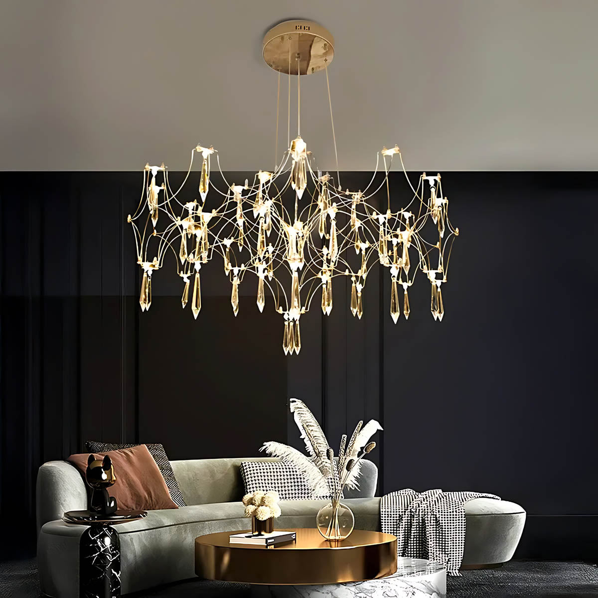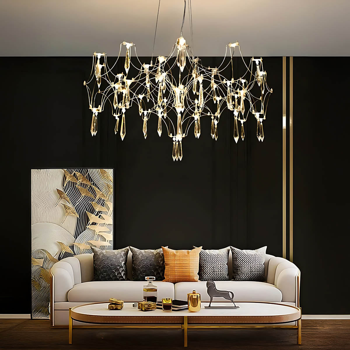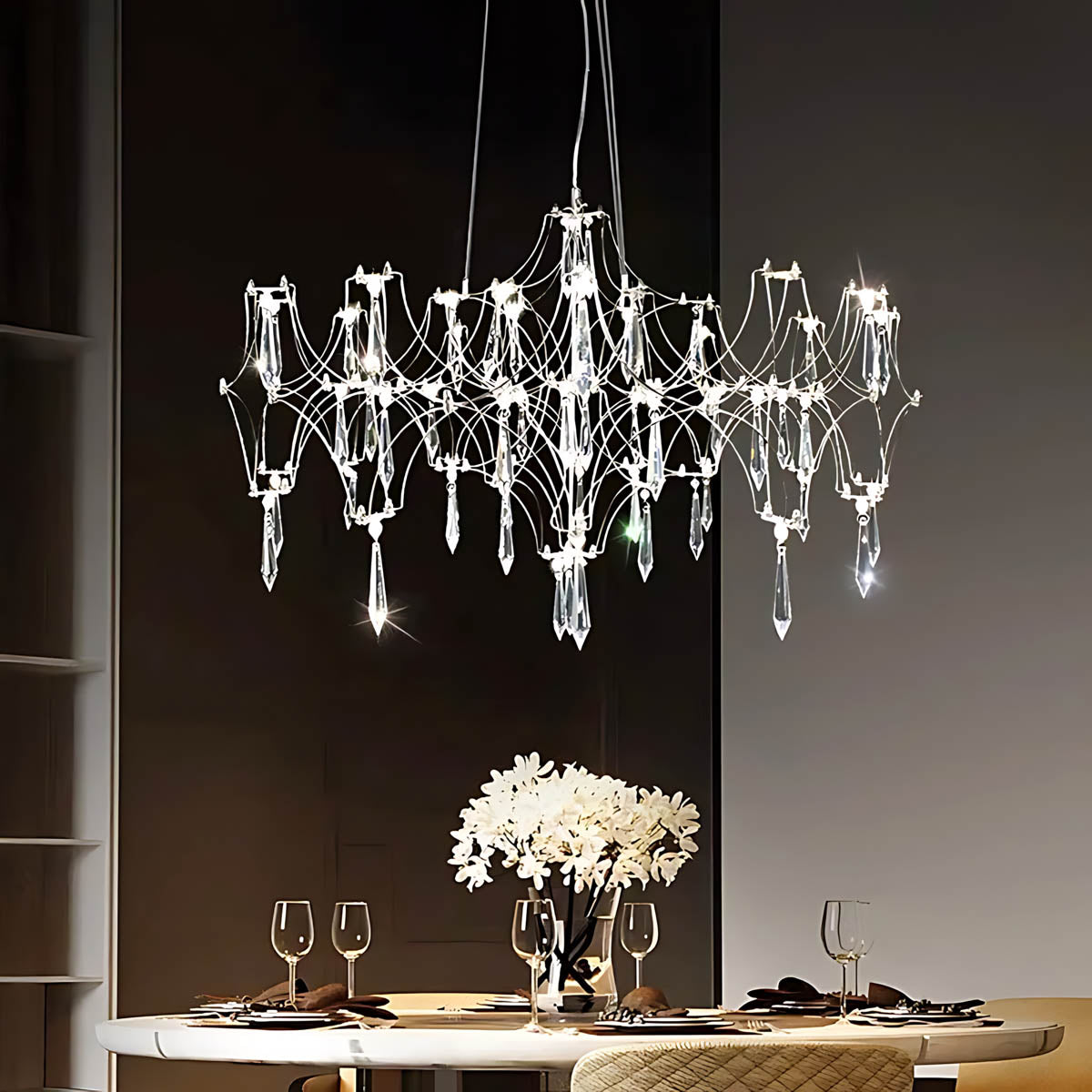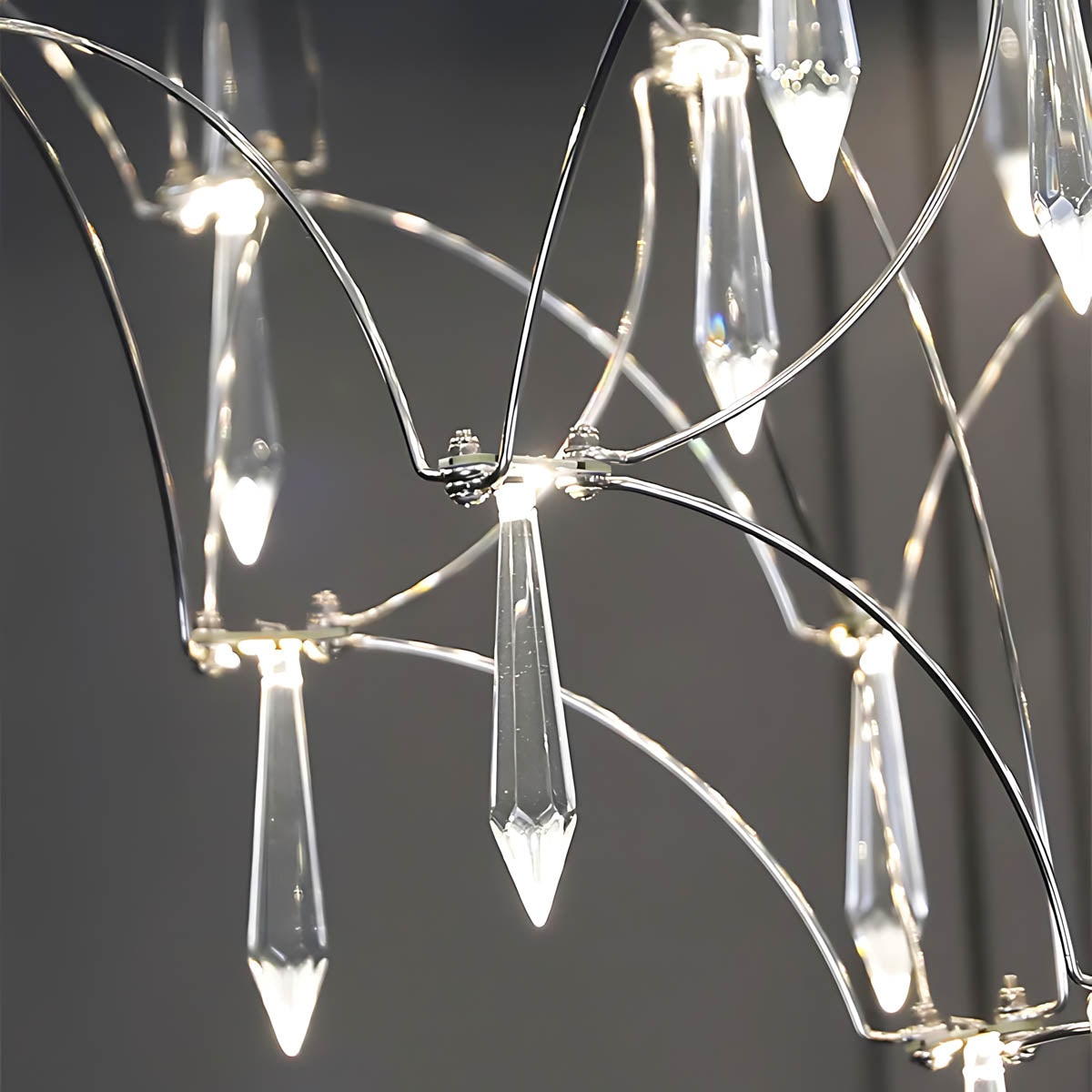 Hand-formed stainless steel branches cradle faceted crystal drops that catch and scatter light into a mesmerizing, prismatic glow, creating a statement centerpiece for living rooms, dining spaces, and grand entryways.
