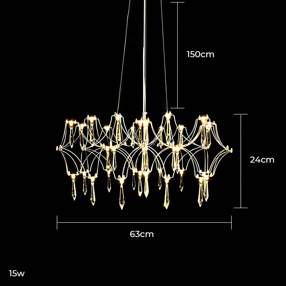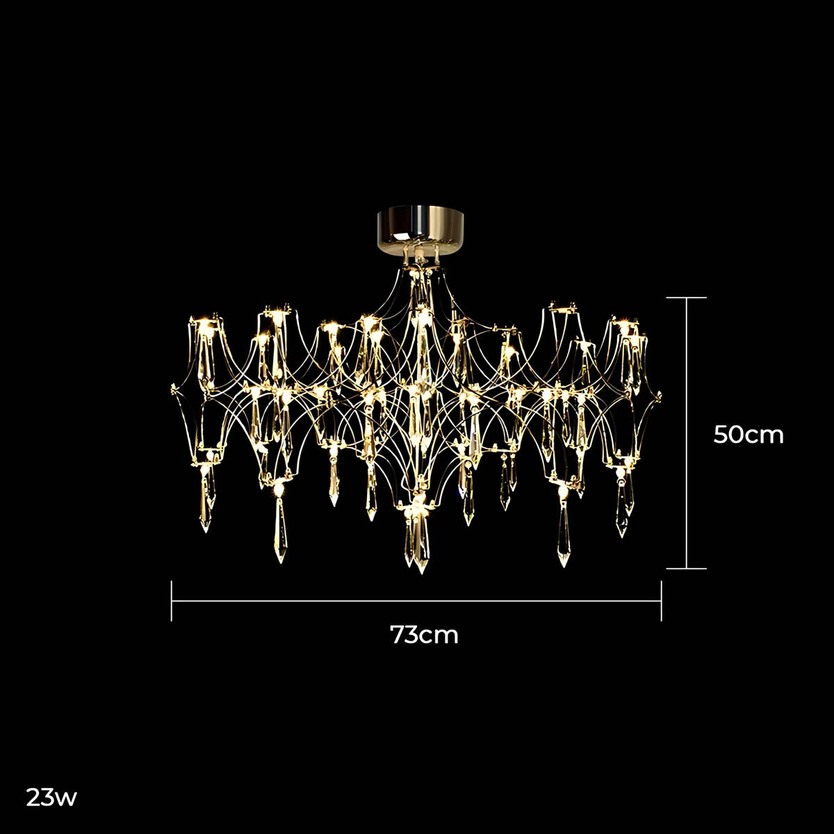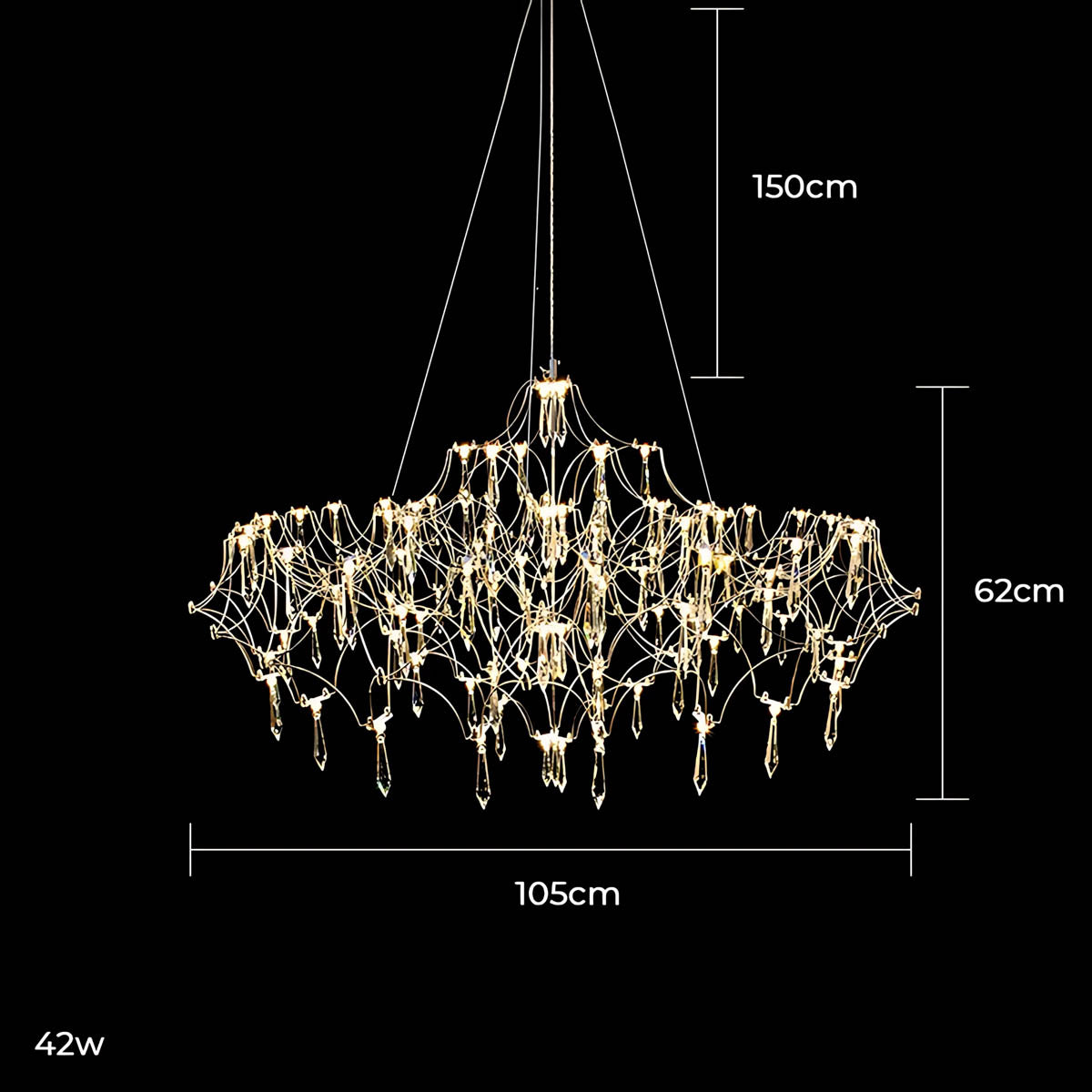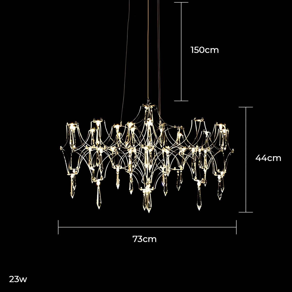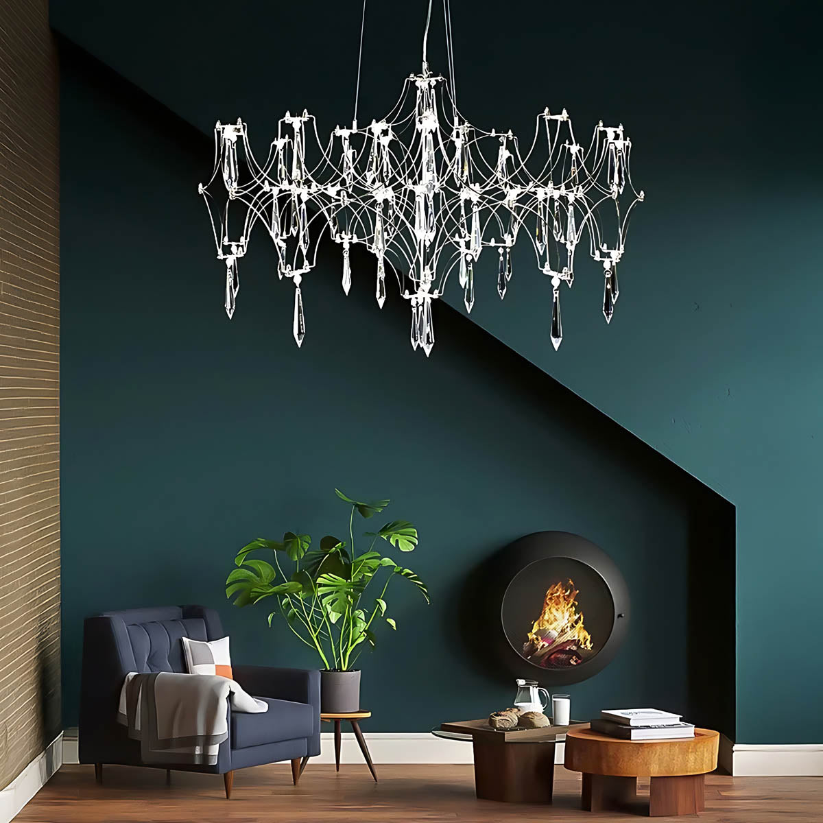 Hand-formed stainless steel branches cradle faceted crystal drops that catch and scatter light into a mesmerizing, prismatic glow, creating a statement centerpiece for living rooms, dining spaces, and grand entryways.