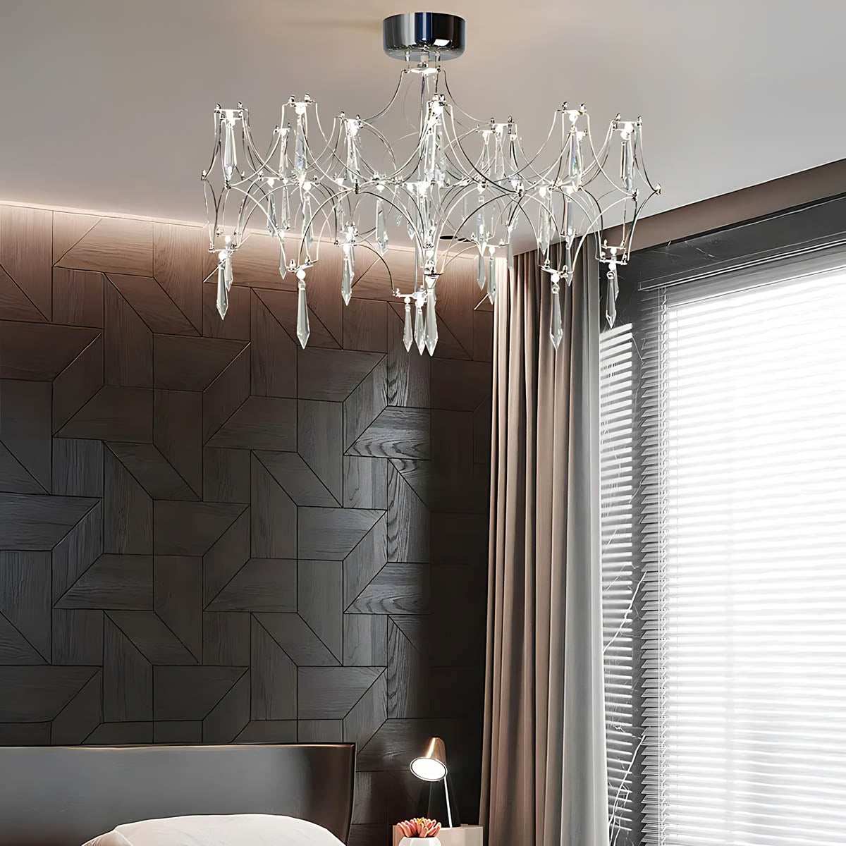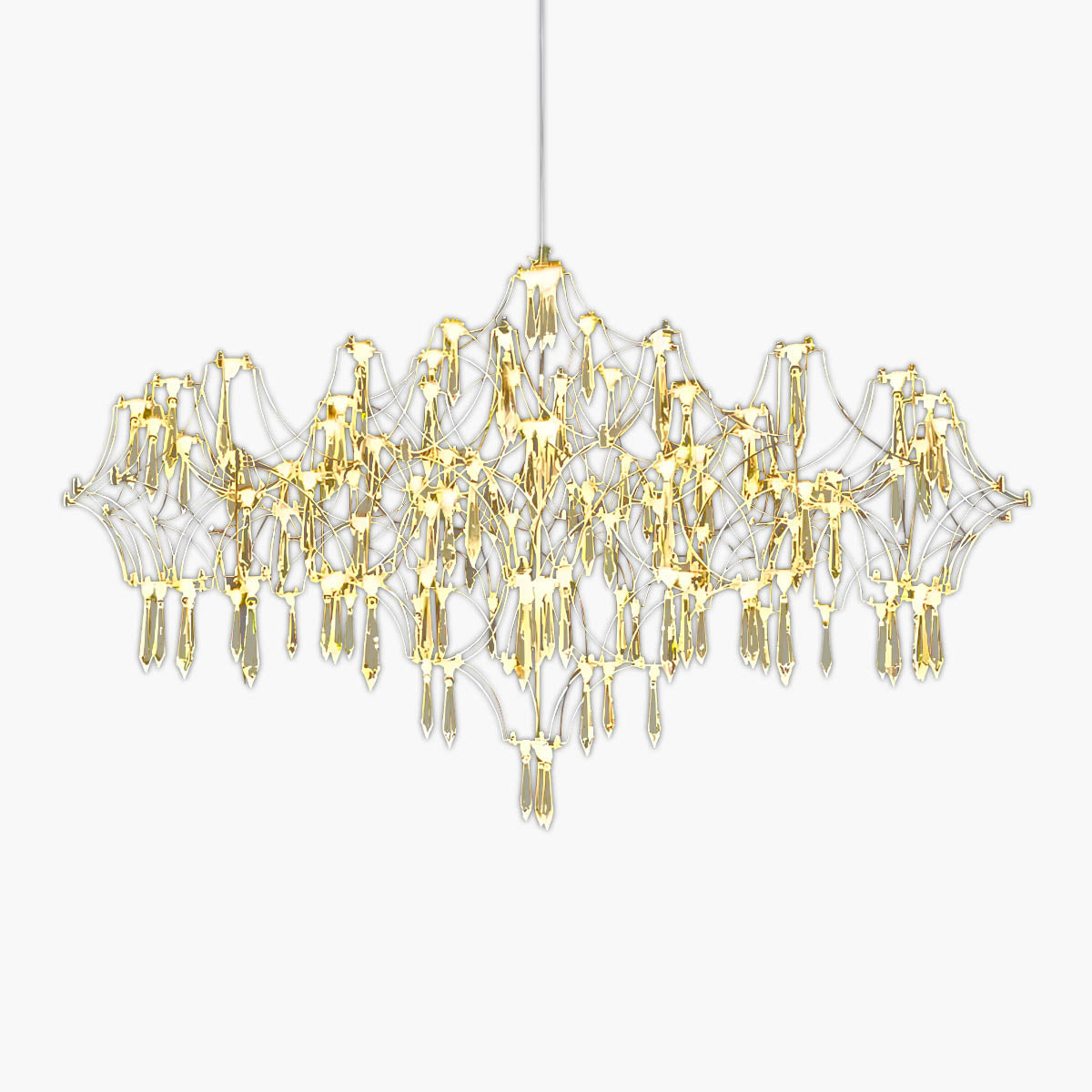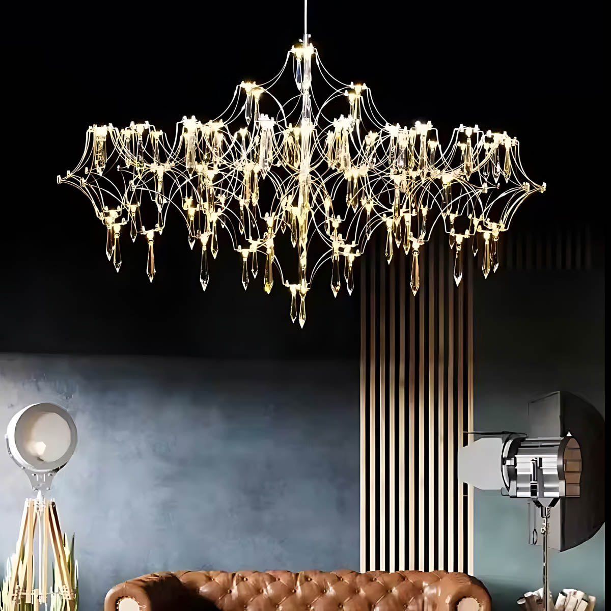 Its sculptural, cascading design reads like luminous jewelry for the ceiling, balancing airy transparency with crisp metal lines to complement both minimalist and luxe interiors.