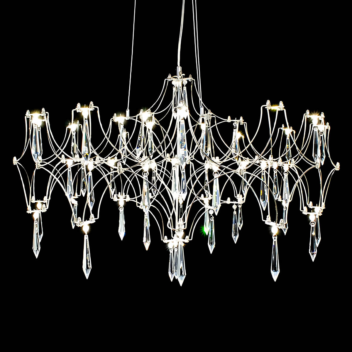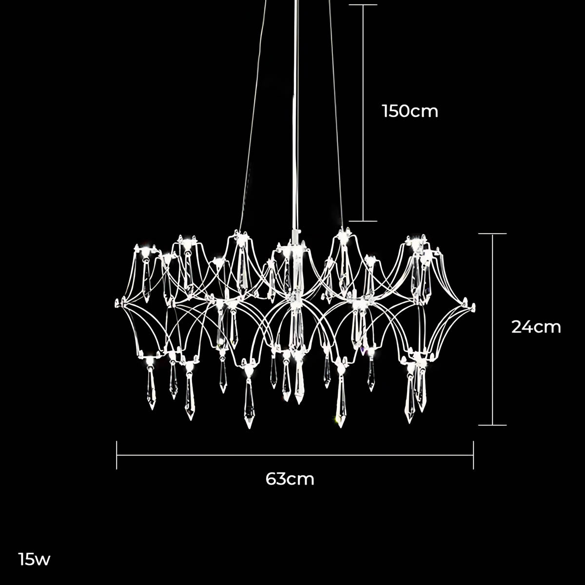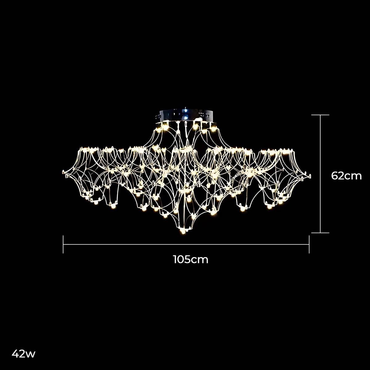 Its sculptural, cascading design reads like luminous jewelry for the ceiling, balancing airy transparency with crisp metal lines to complement both minimalist and luxe interiors.