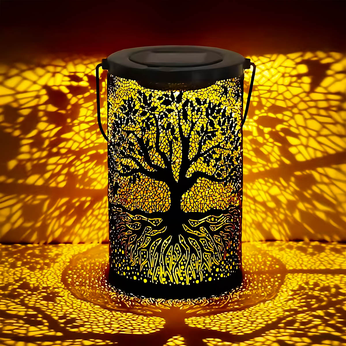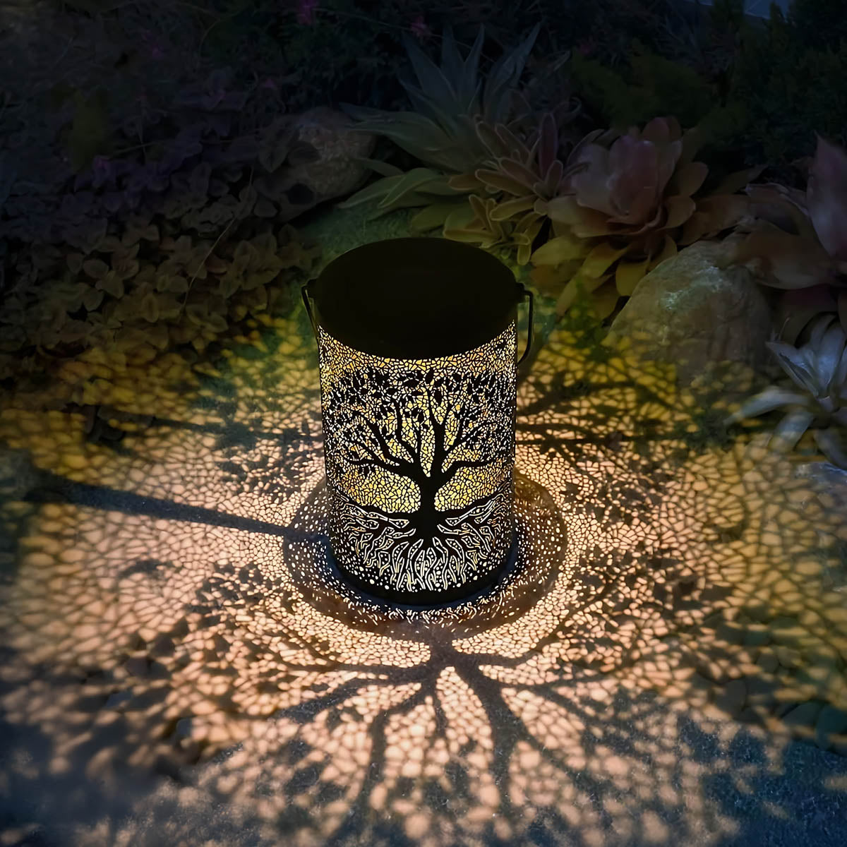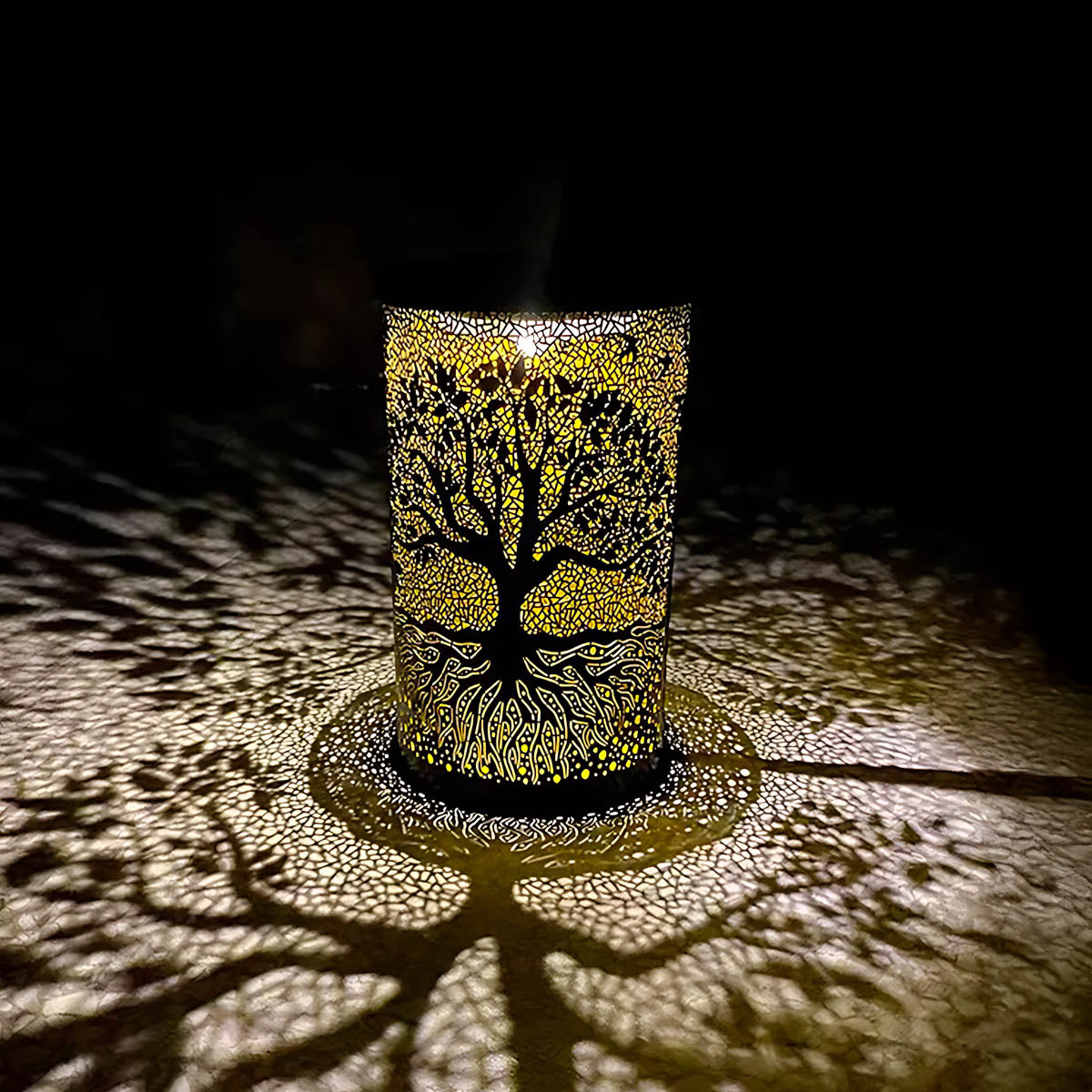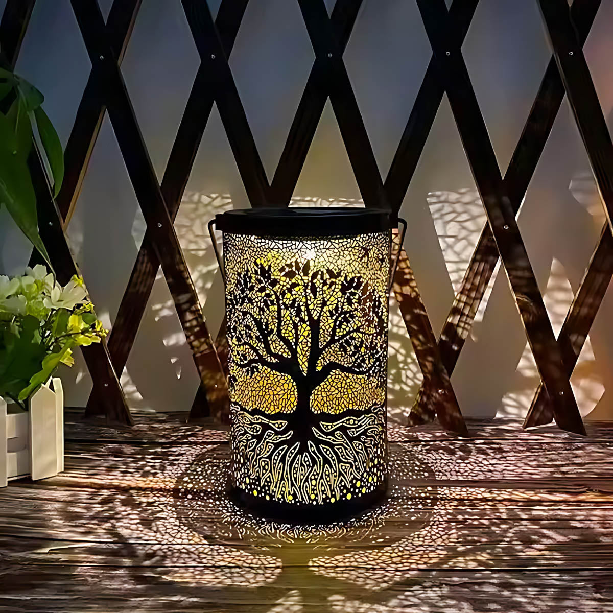 Featuring an intricate Tree of Life cutout, it casts mesmerizing patterns of warm light across patios, pathways, and decks, instantly elevating outdoor ambiance.