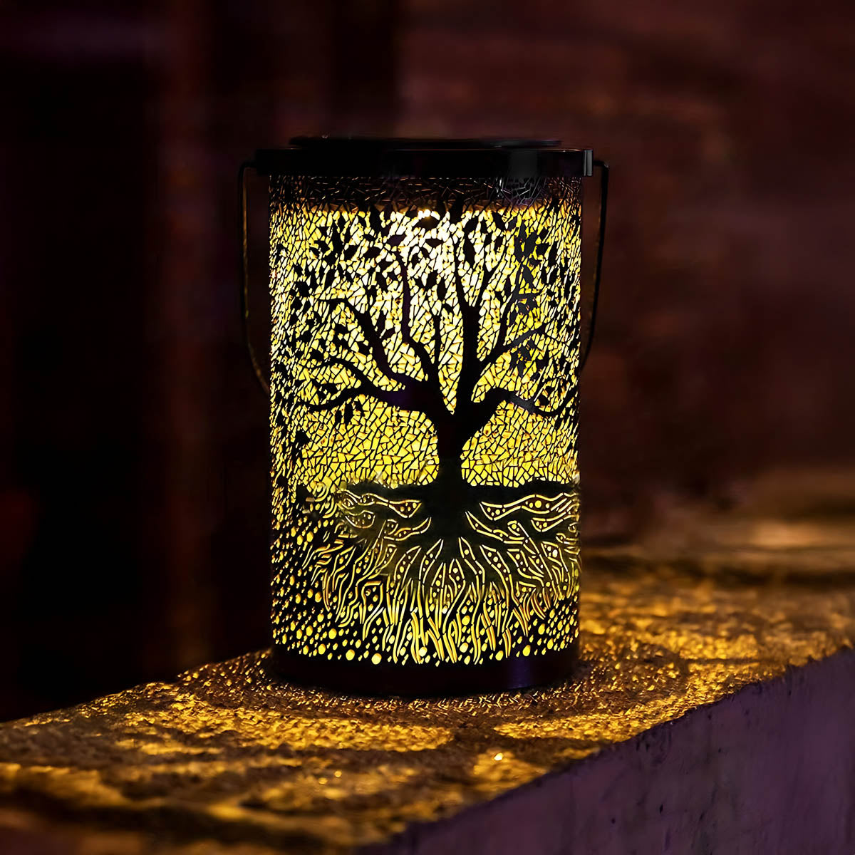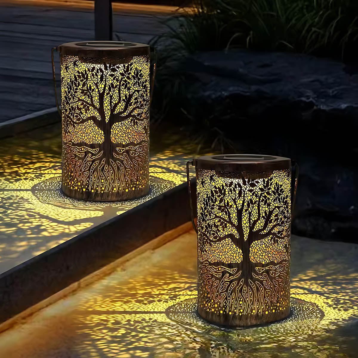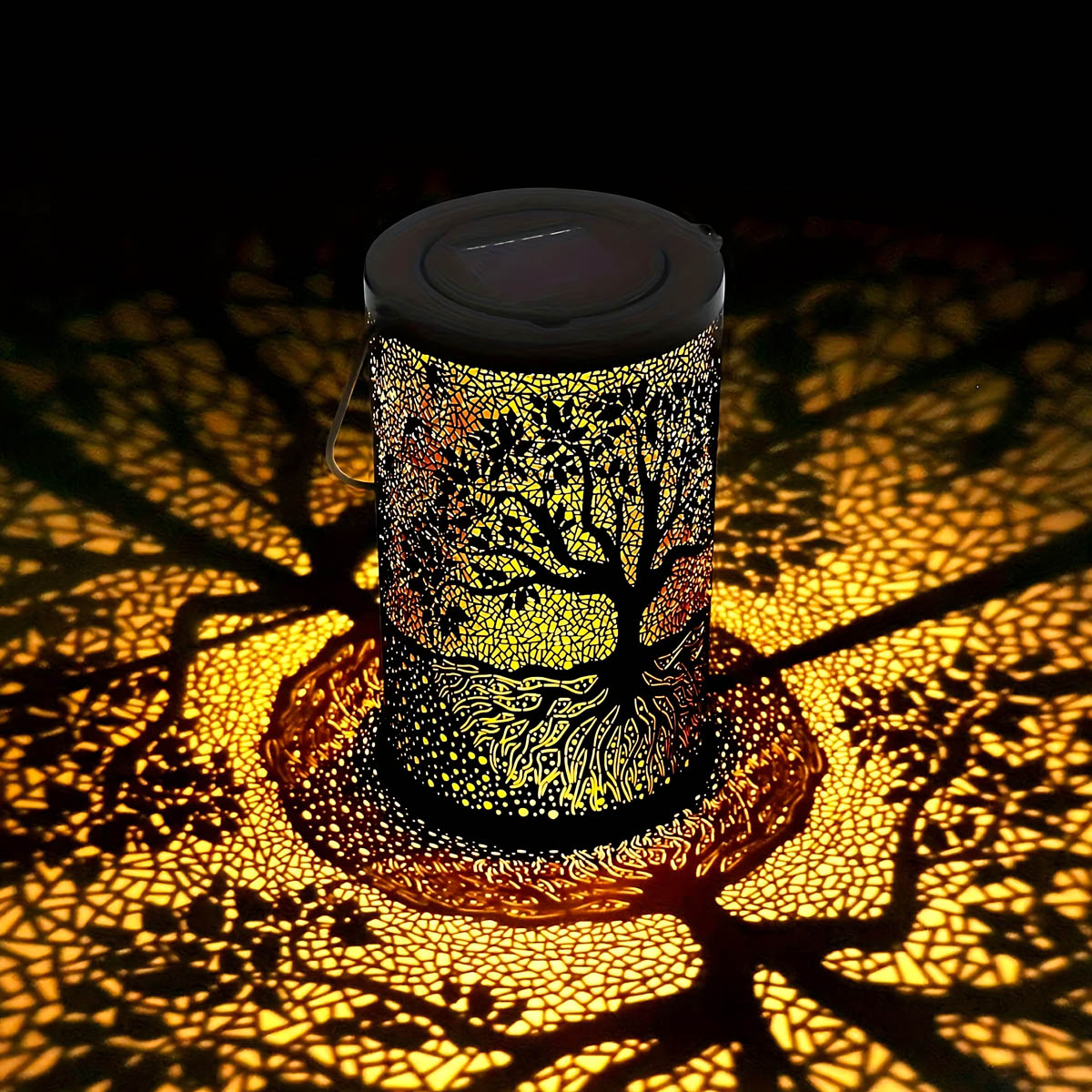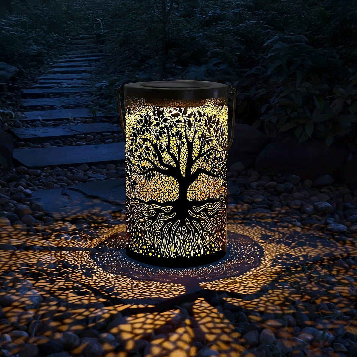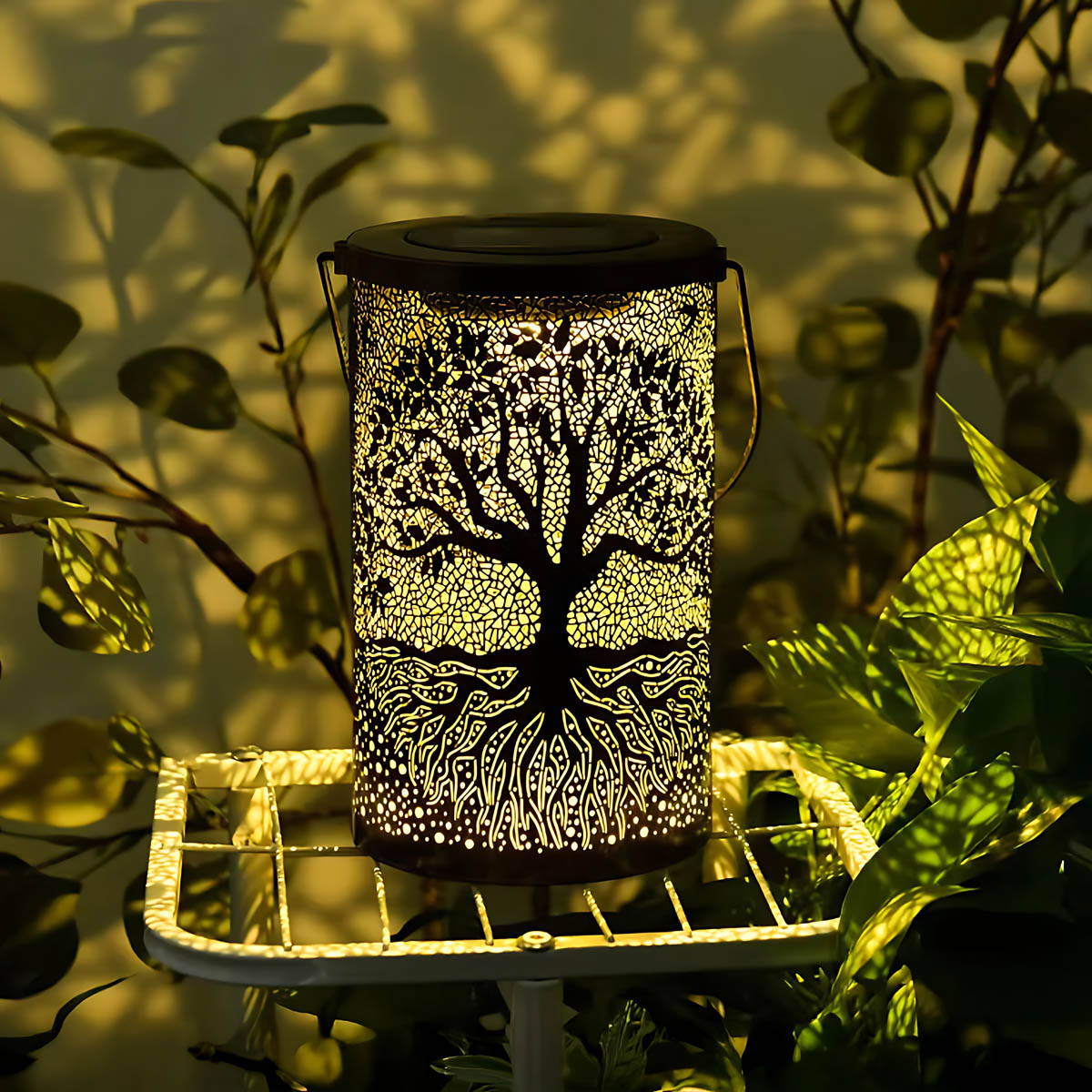 Featuring an intricate Tree of Life cutout, it casts mesmerizing patterns of warm light across patios, pathways, and decks, instantly elevating outdoor ambiance.