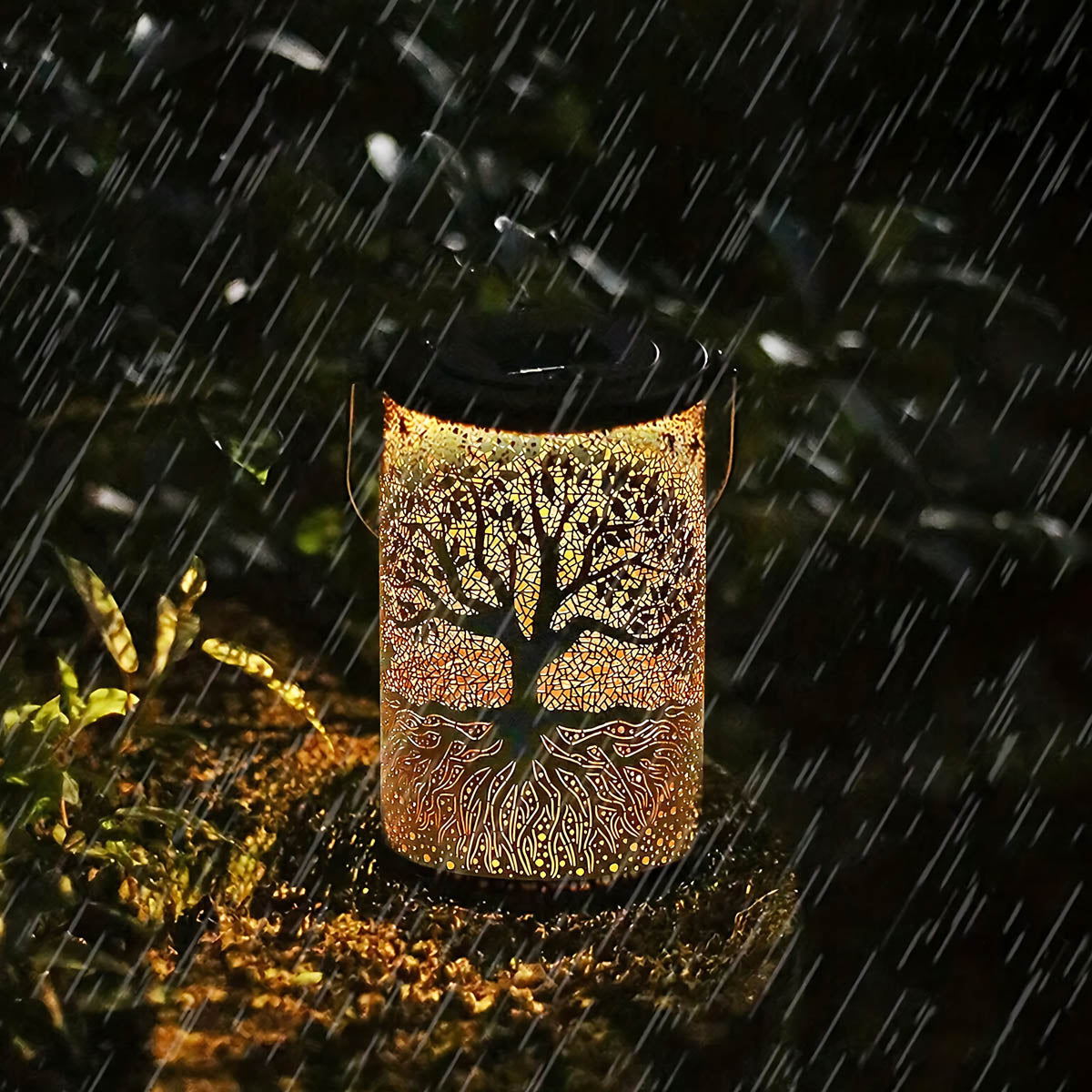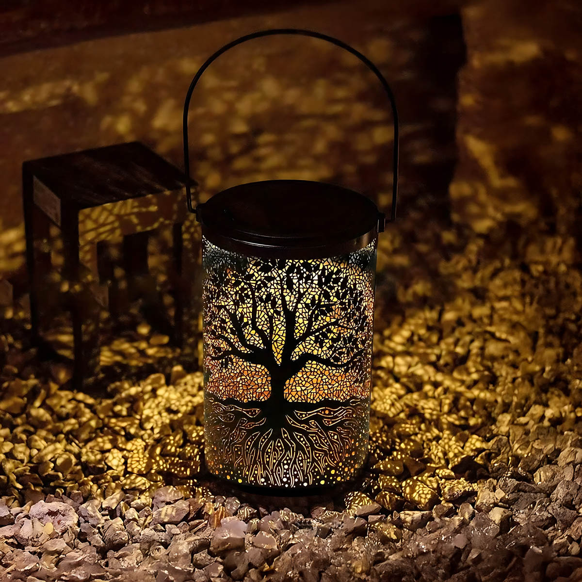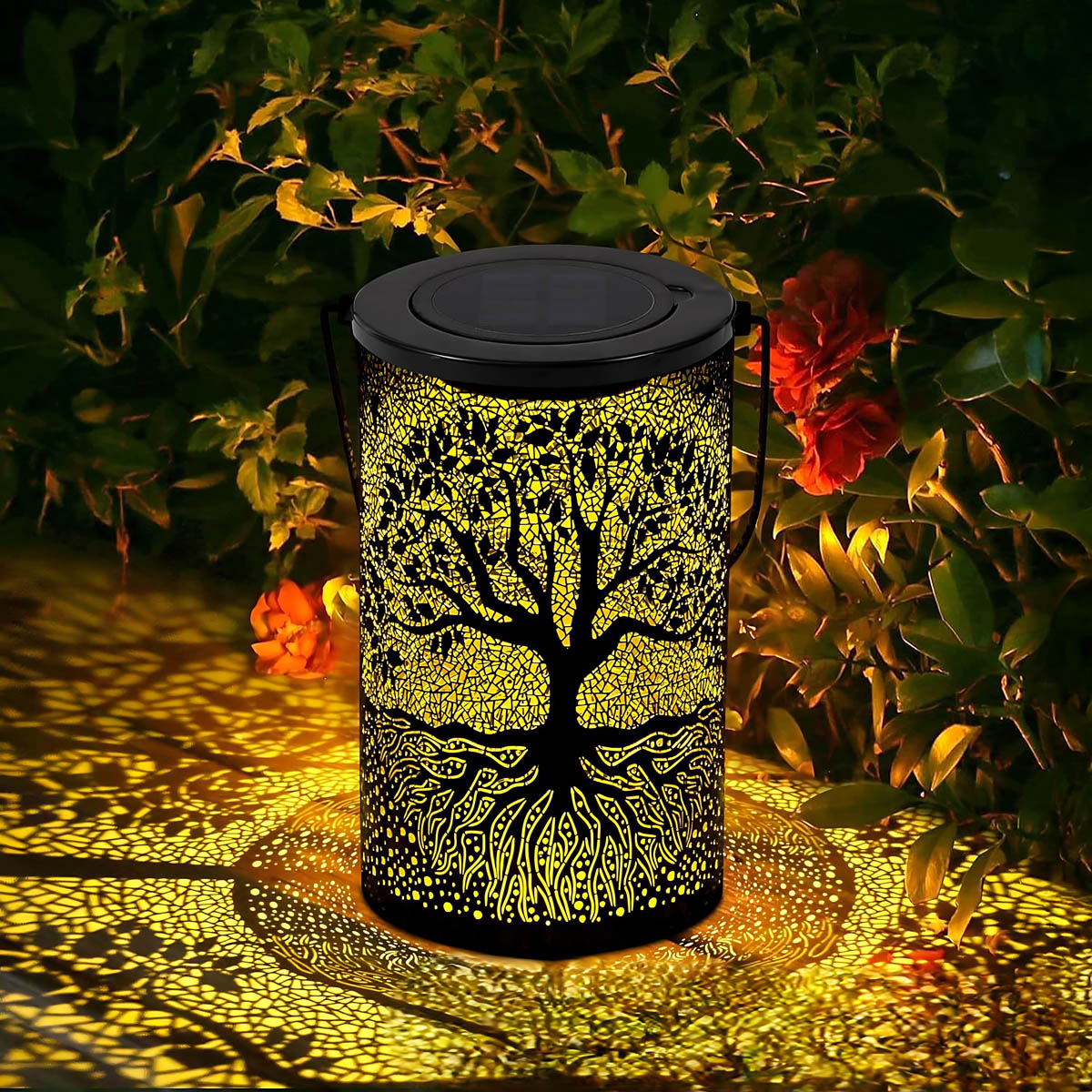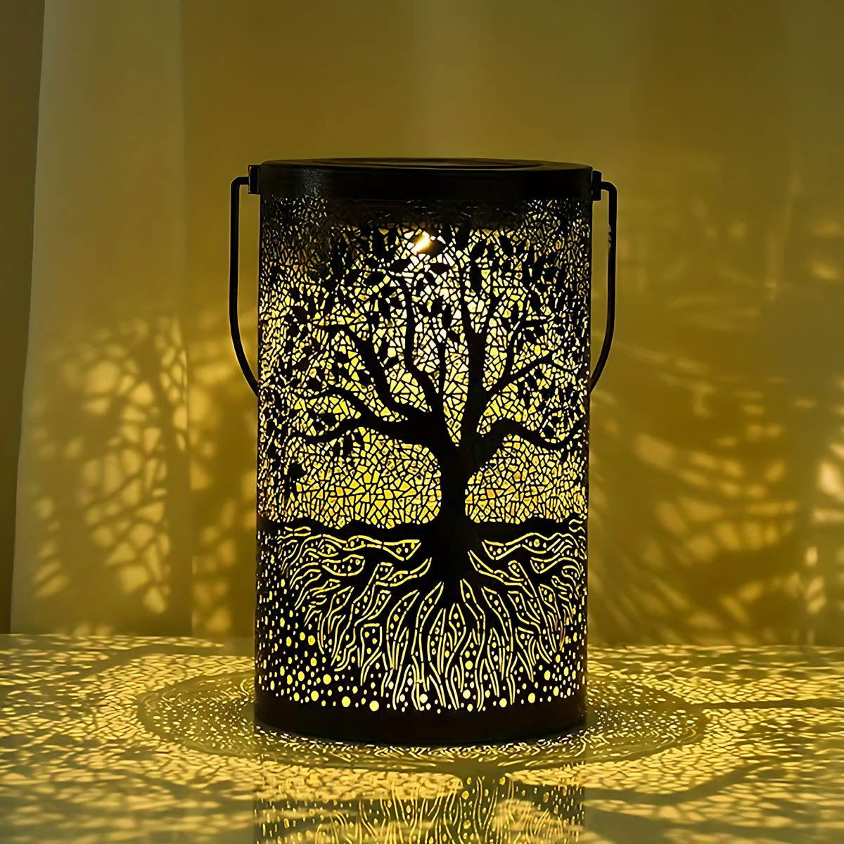 Featuring an intricate Tree of Life cutout, it casts mesmerizing patterns of warm light across patios, pathways, and decks, instantly elevating outdoor ambiance.