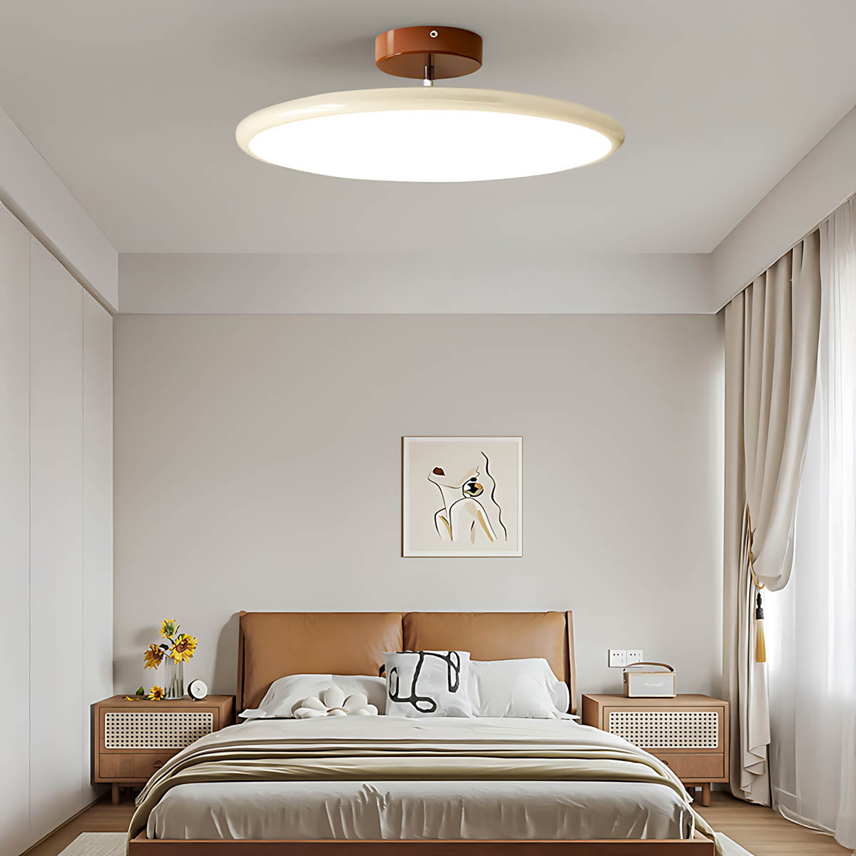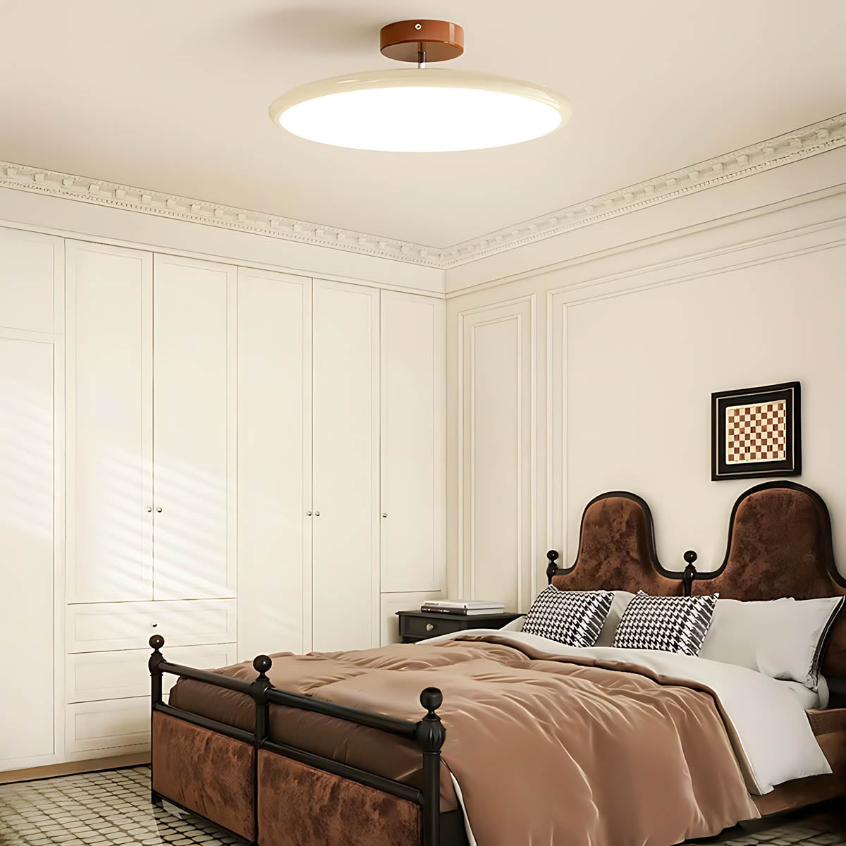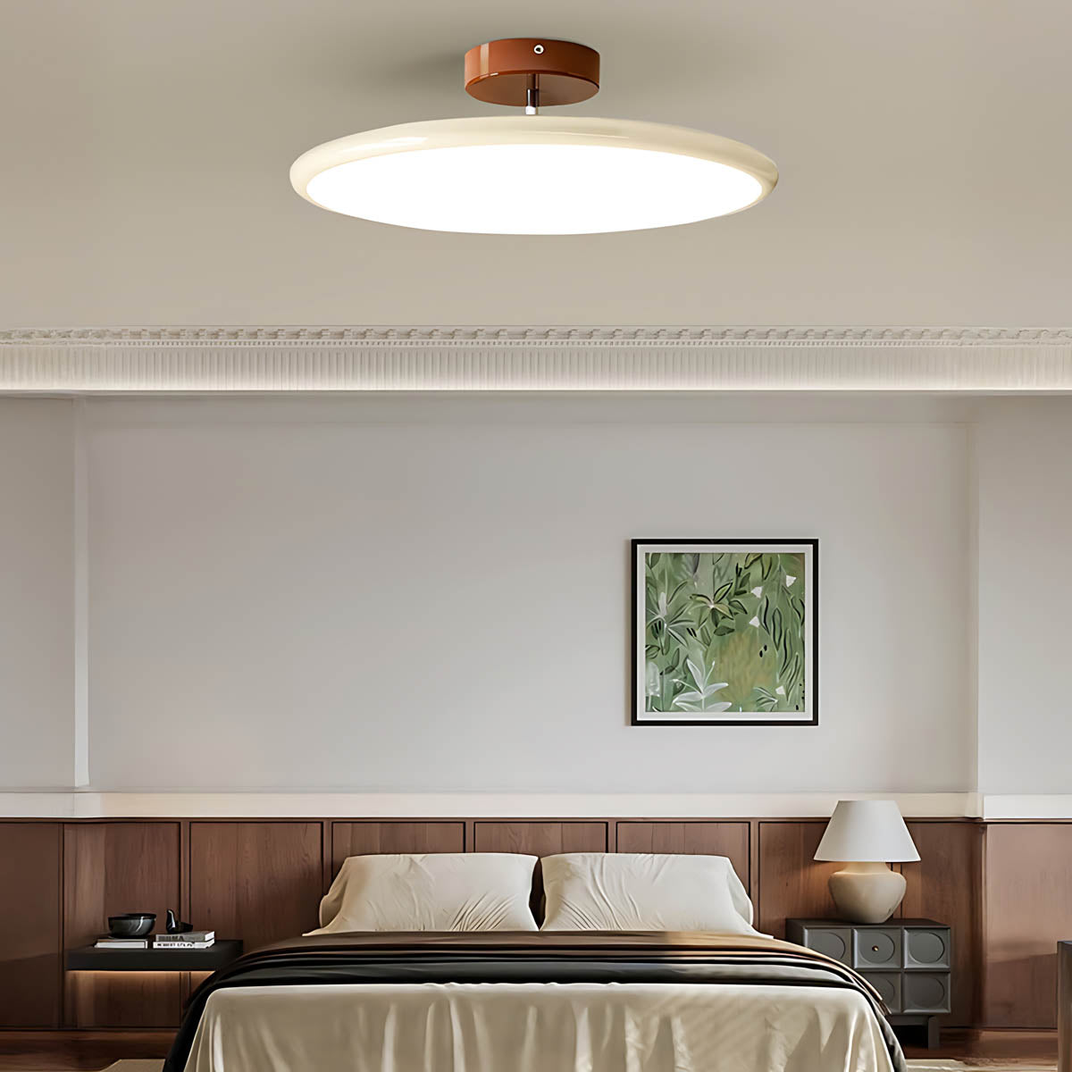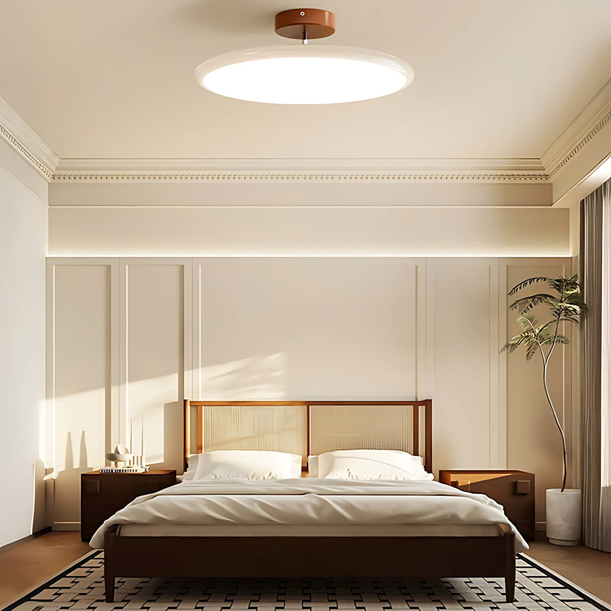 Crafted from durable iron and aluminum with a high-quality acrylic diffuser, this slim disc-style fixture floats just below the ceiling, creating a clean semi–flush mount silhouette that feels both minimalist and warm.