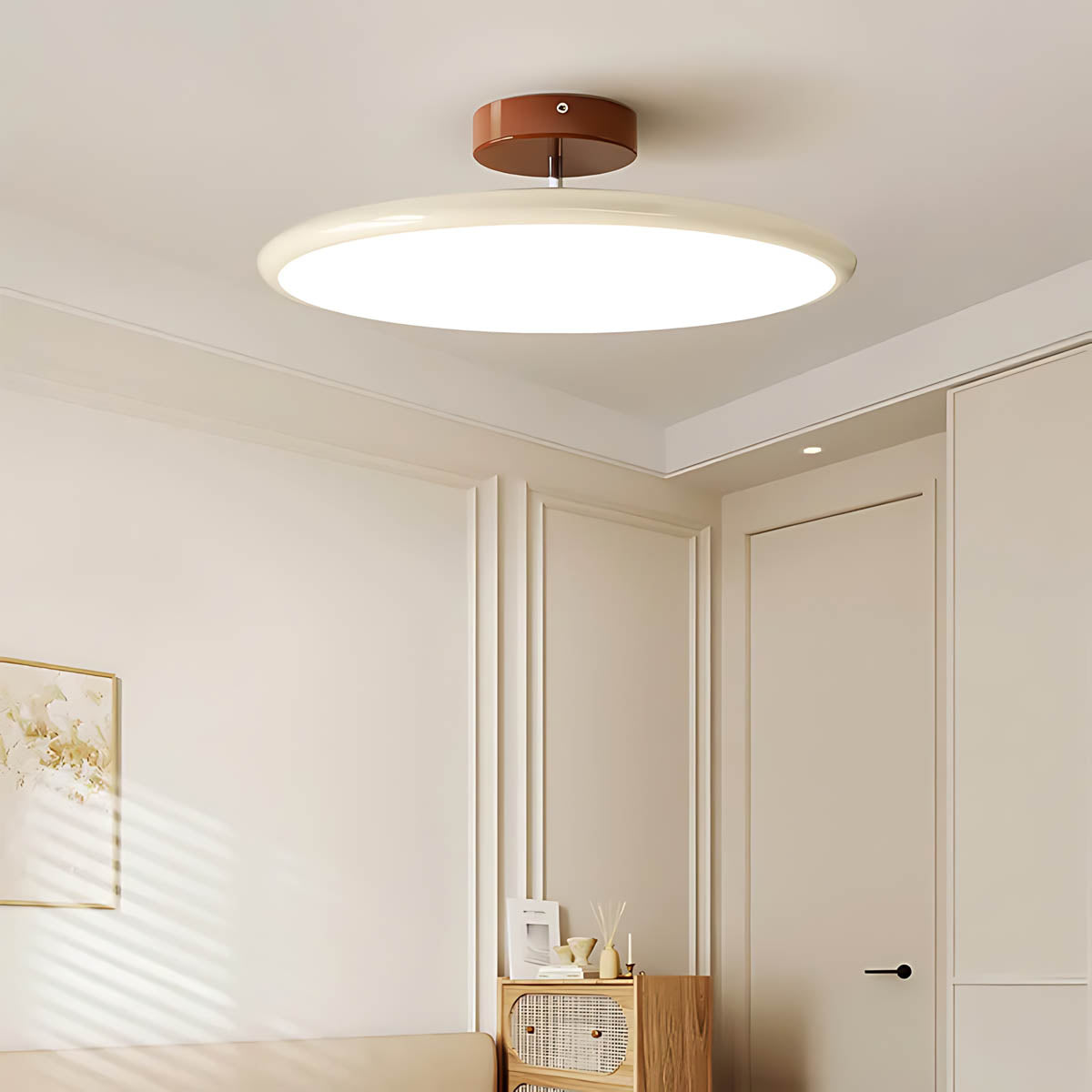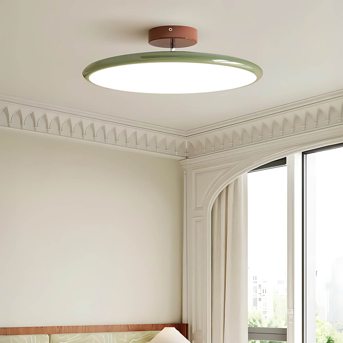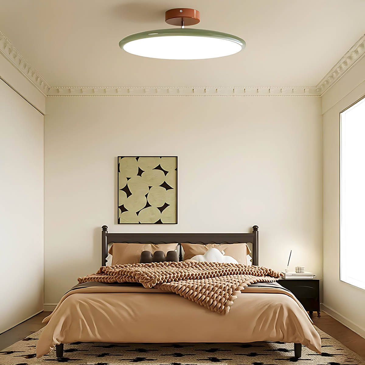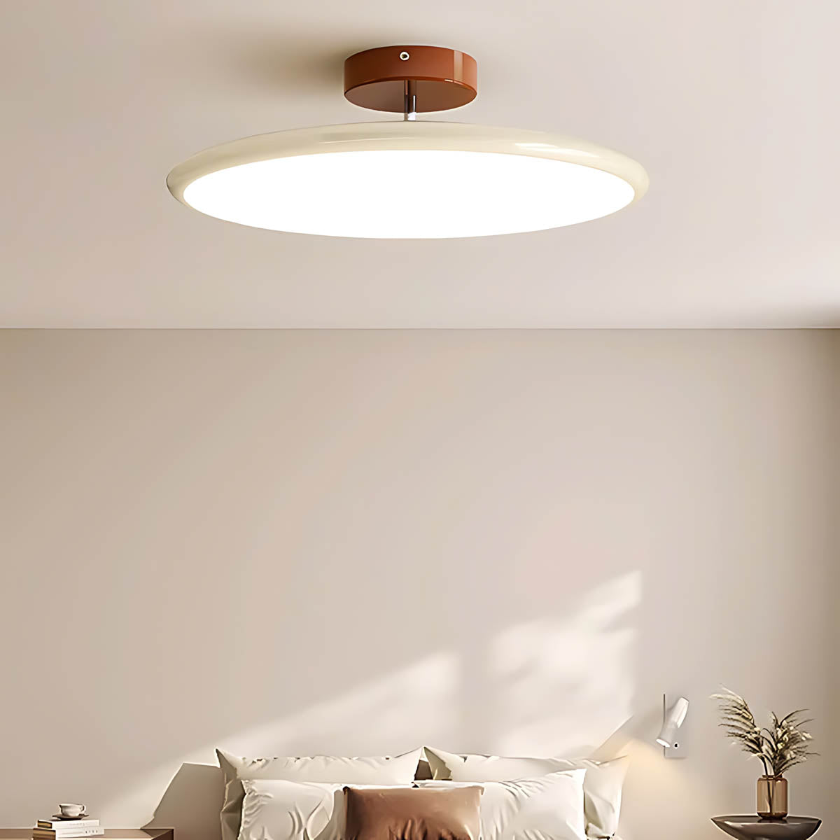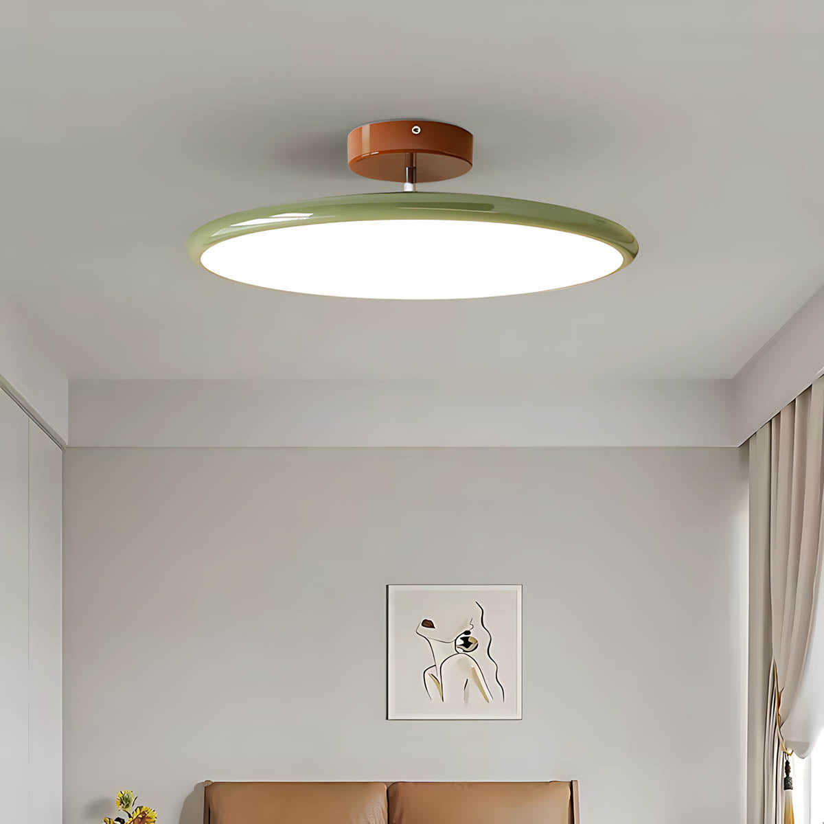 Crafted from durable iron and aluminum with a high-quality acrylic diffuser, this slim disc-style fixture floats just below the ceiling, creating a clean semi–flush mount silhouette that feels both minimalist and warm.
